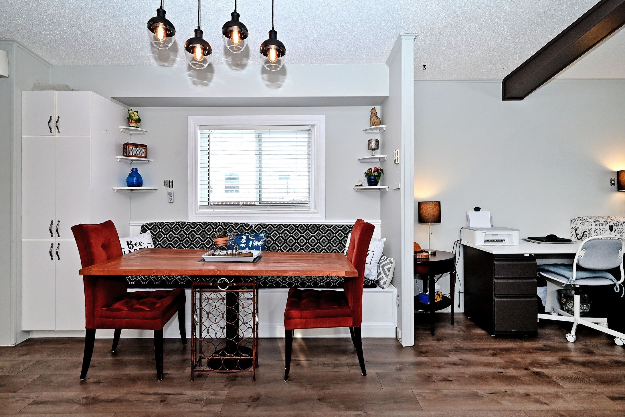 • Bright eat-in kitchen with plenty of counter space and stylish banquette seating.