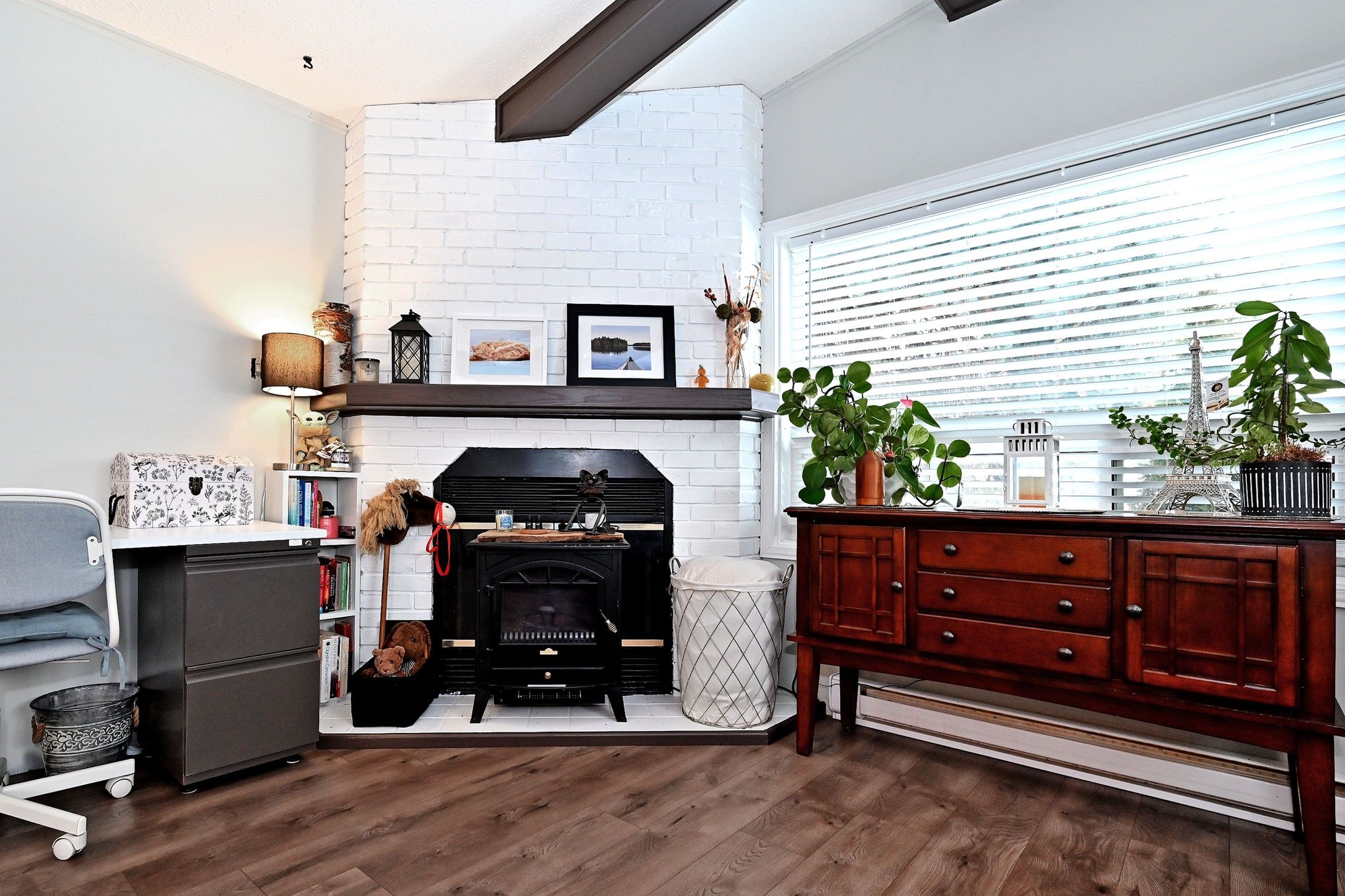 • Inviting living room features a cozy wood burning fireplace and vaulted ceilings.
