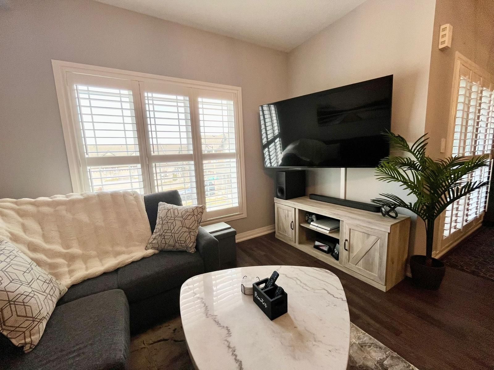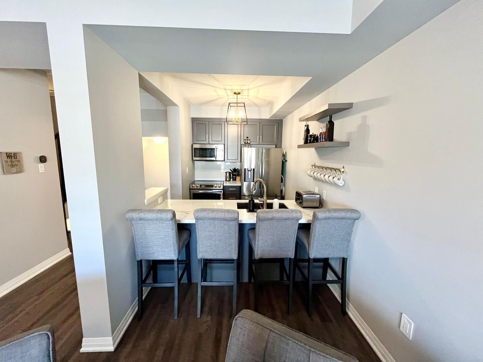 • Spacious rooms with a stylish white kitchen and quartz countertops.