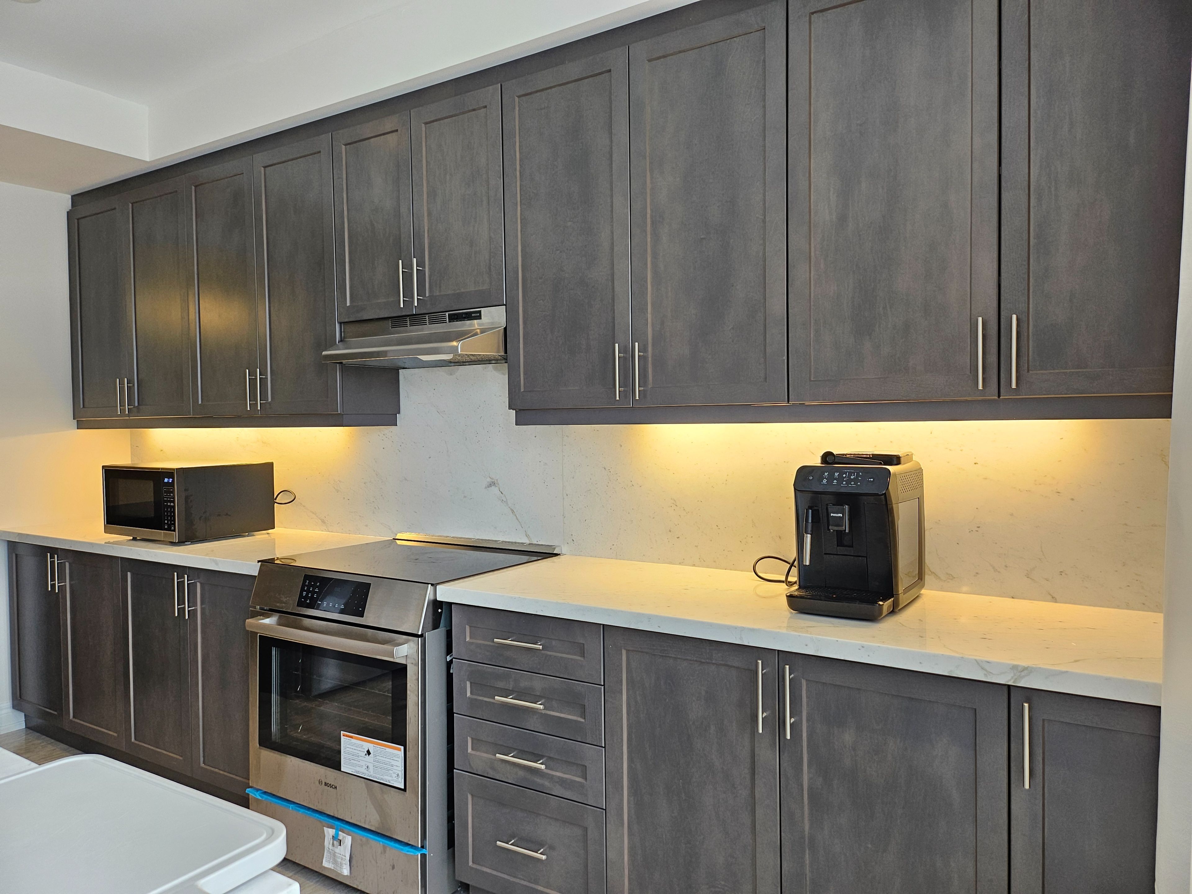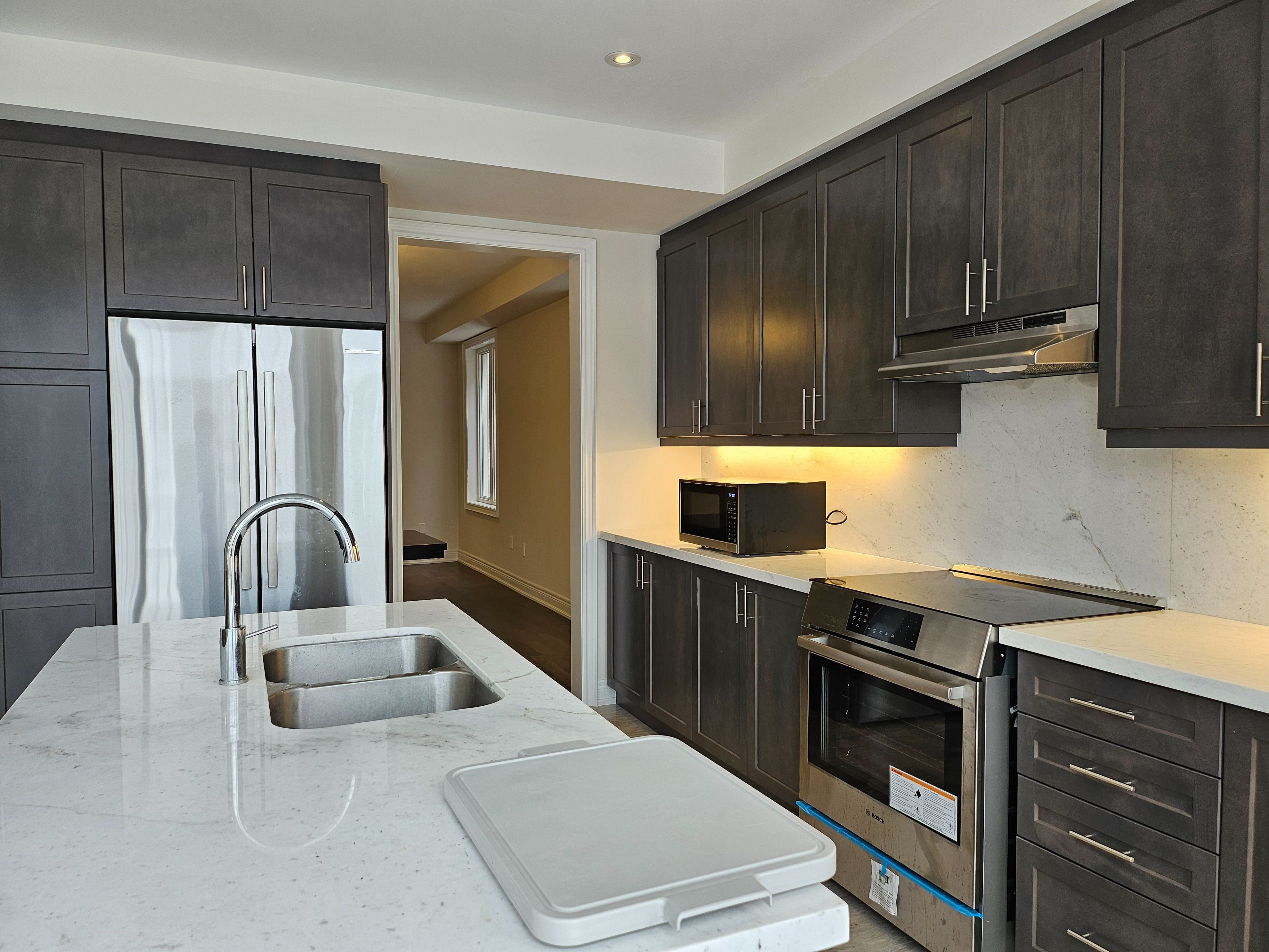 • Modern kitchen with marble countertops and Bosch appliances.