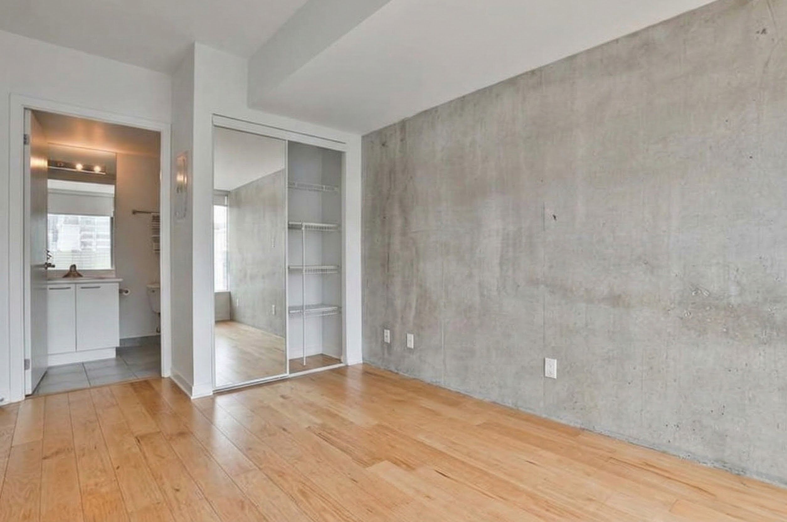 • Stylish exposed concrete accent walls add modern character throughout.