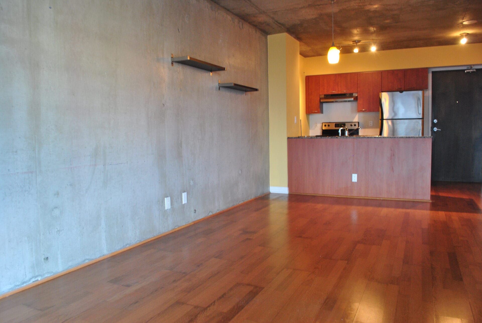 • Modern finishes include engineered hardwood and exposed concrete walls.