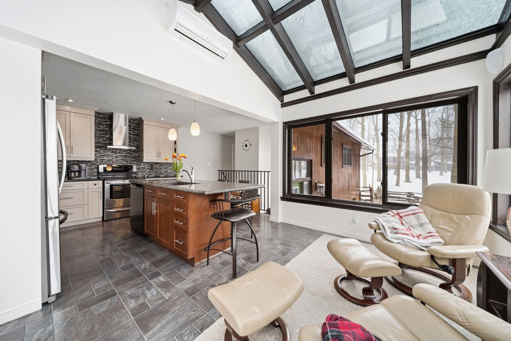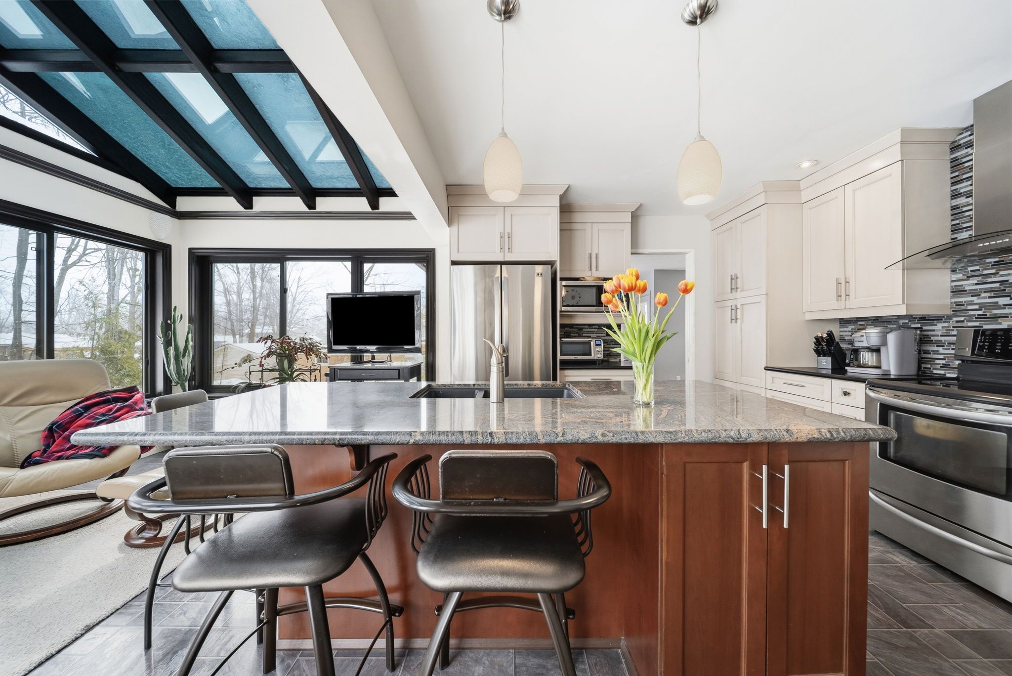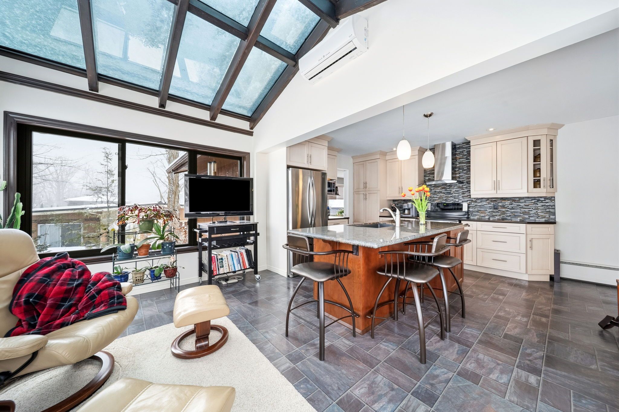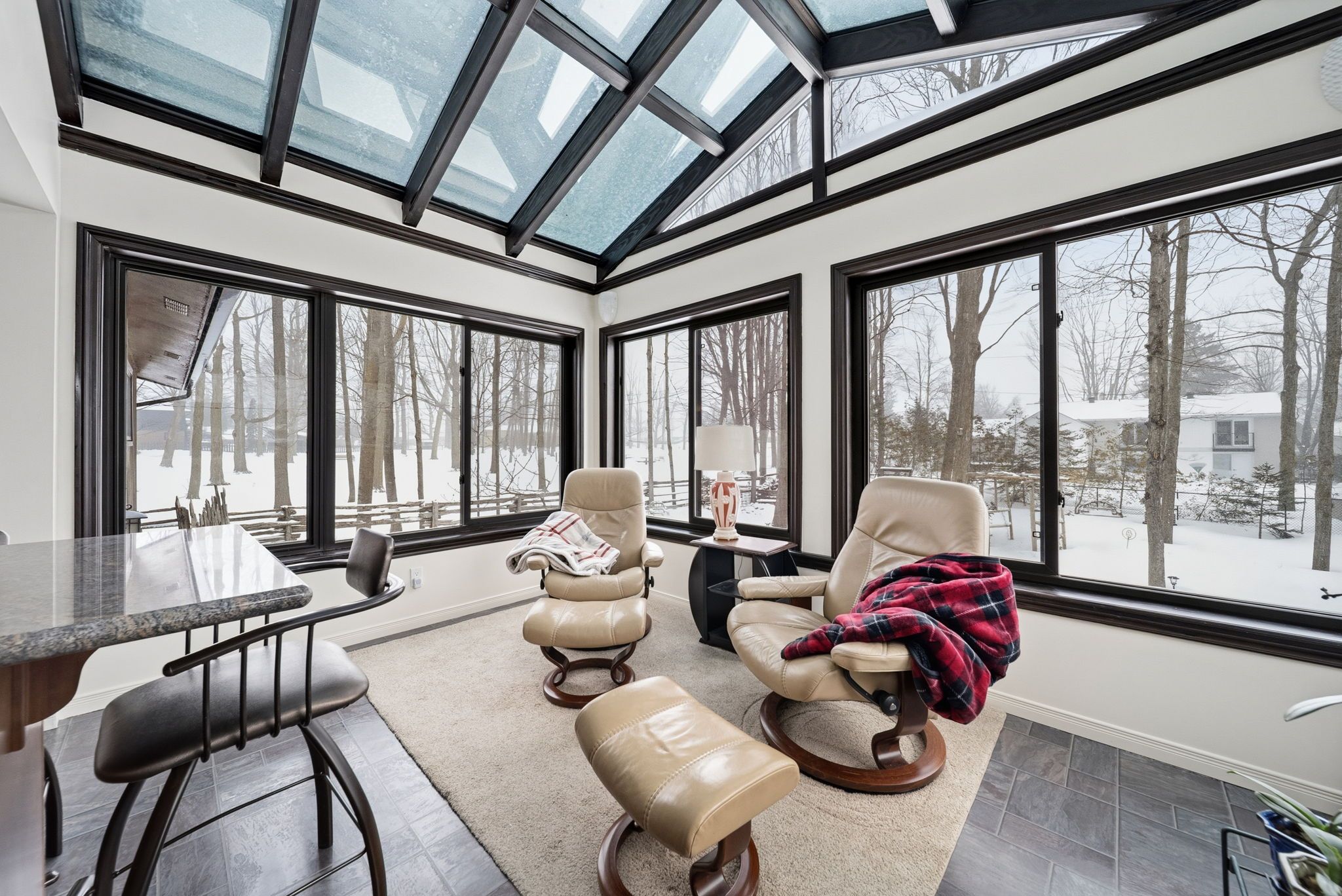 • Bright sunroom adds natural light, perfect for relaxation or reading.