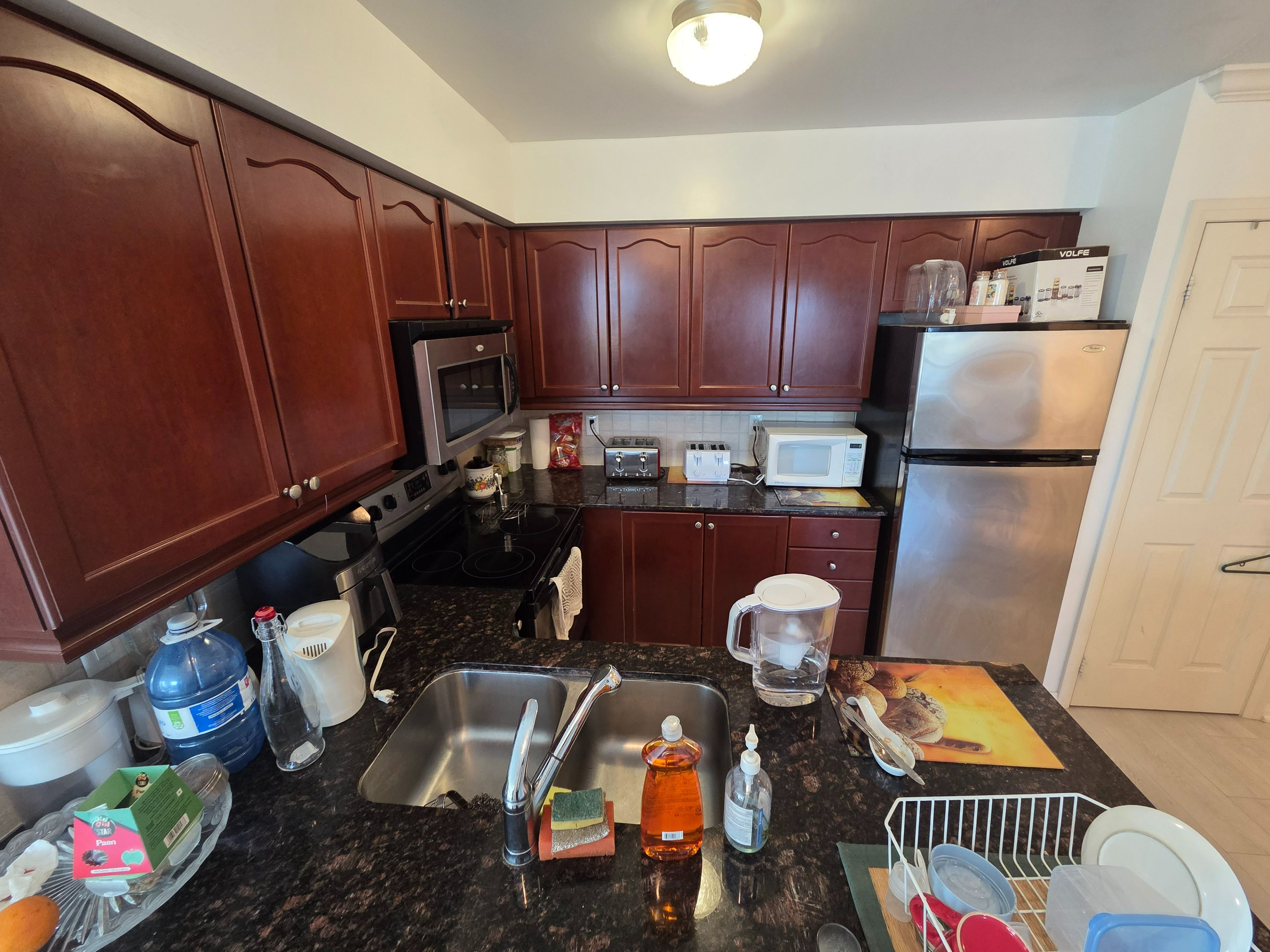 • Spacious kitchen with granite countertops and stainless steel appliances.