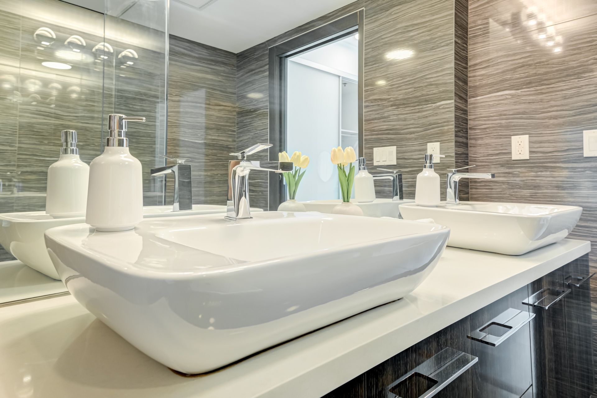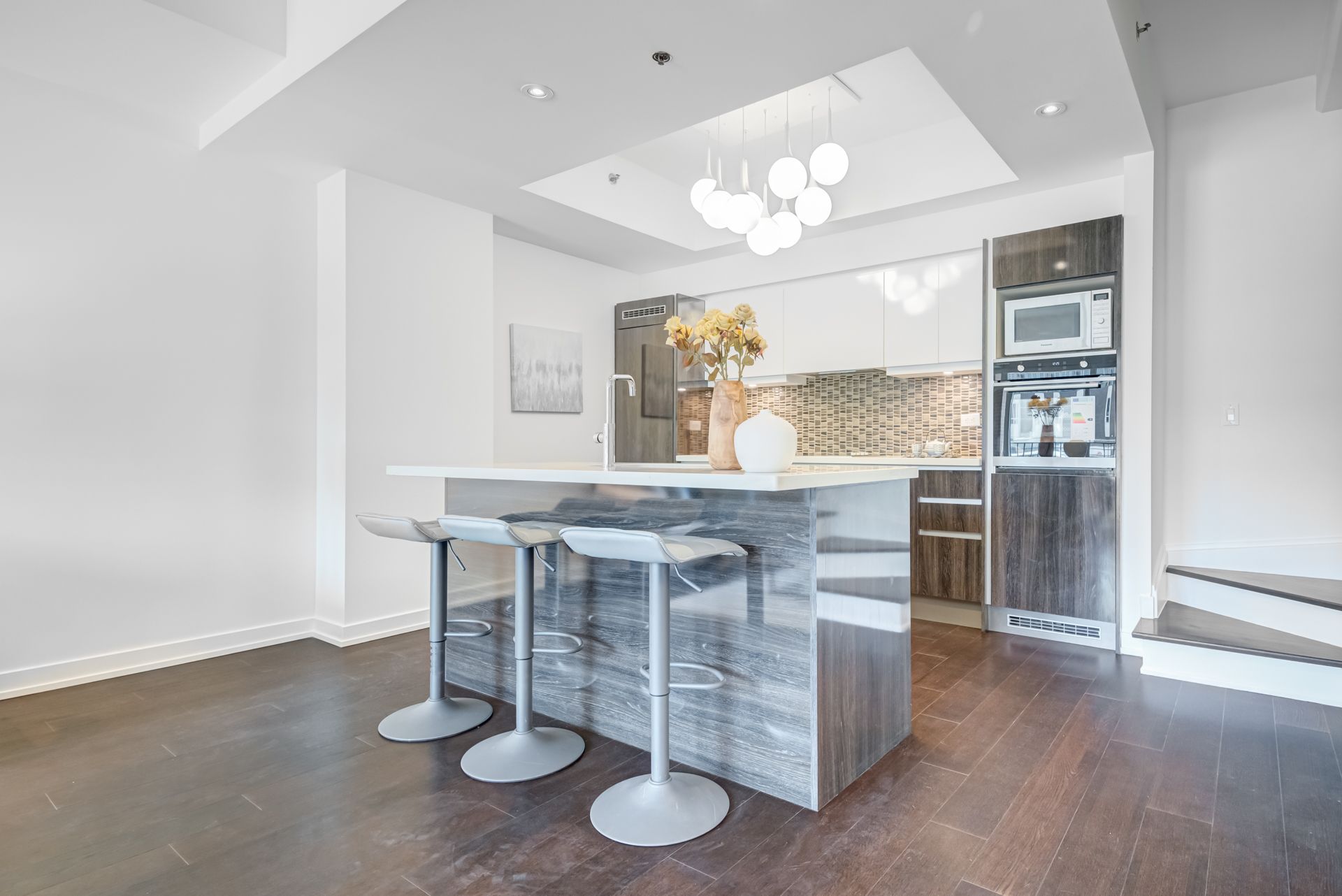 • Modern kitchen featuring quartz countertops and built-in appliances.