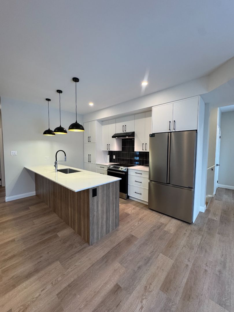 • Modern kitchen featuring shaker cabinets and quartz countertops.