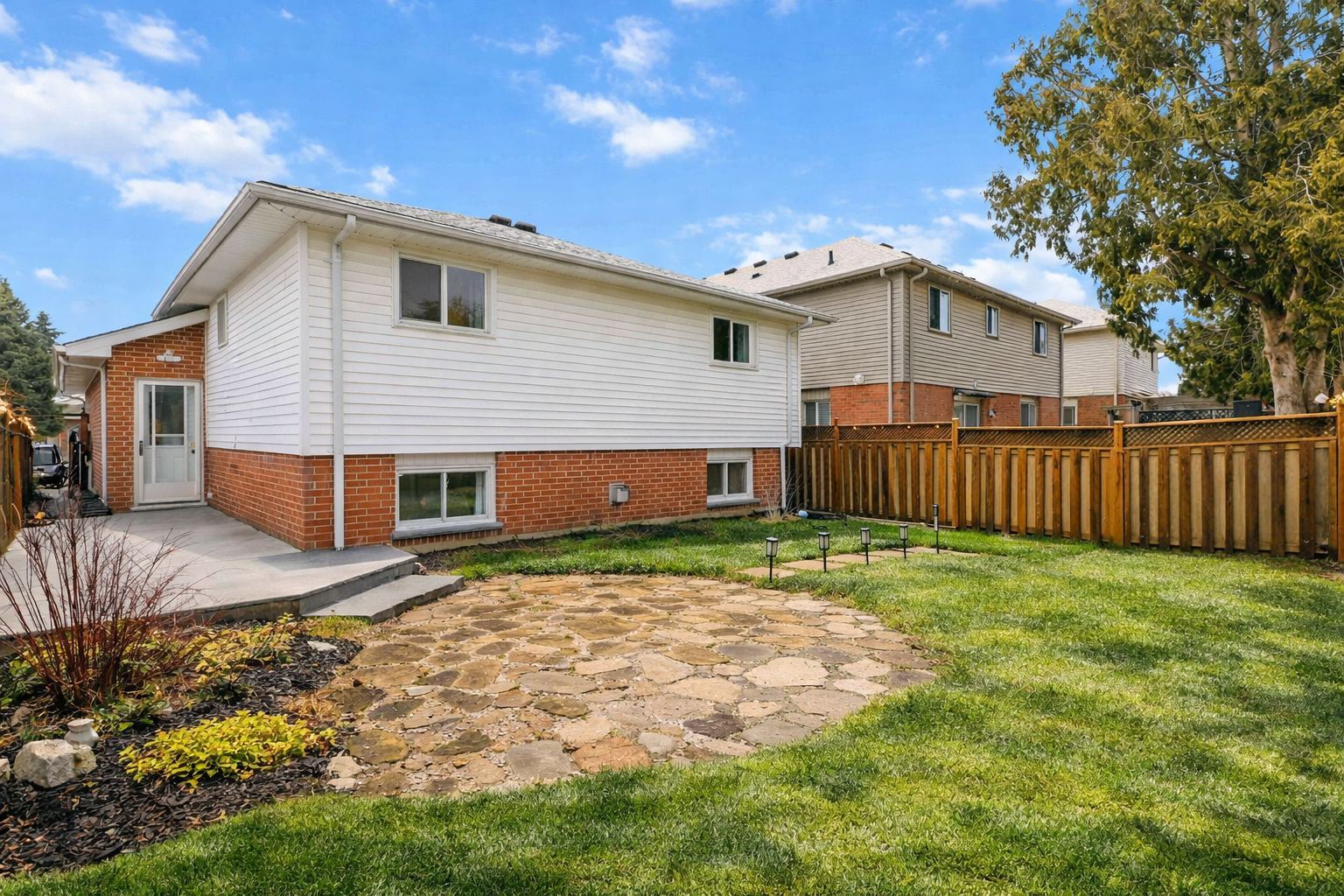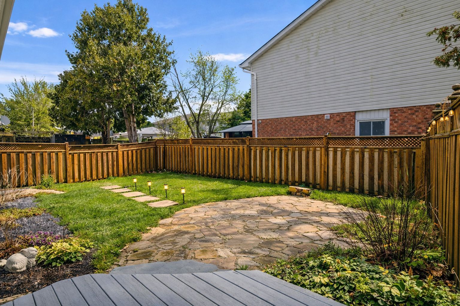 • Fully fenced backyard with sun deck, gazebo space, and fire-pit area.