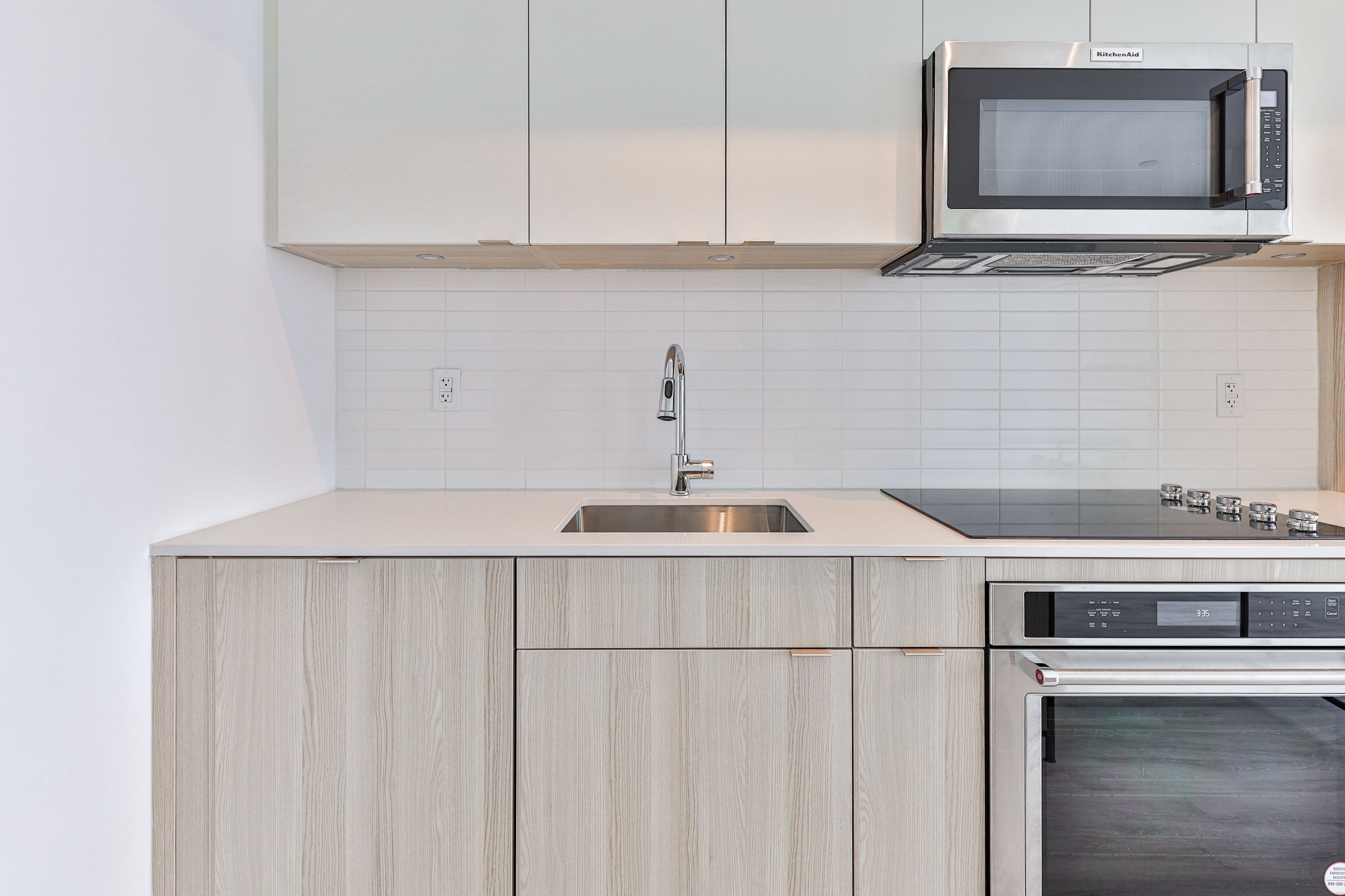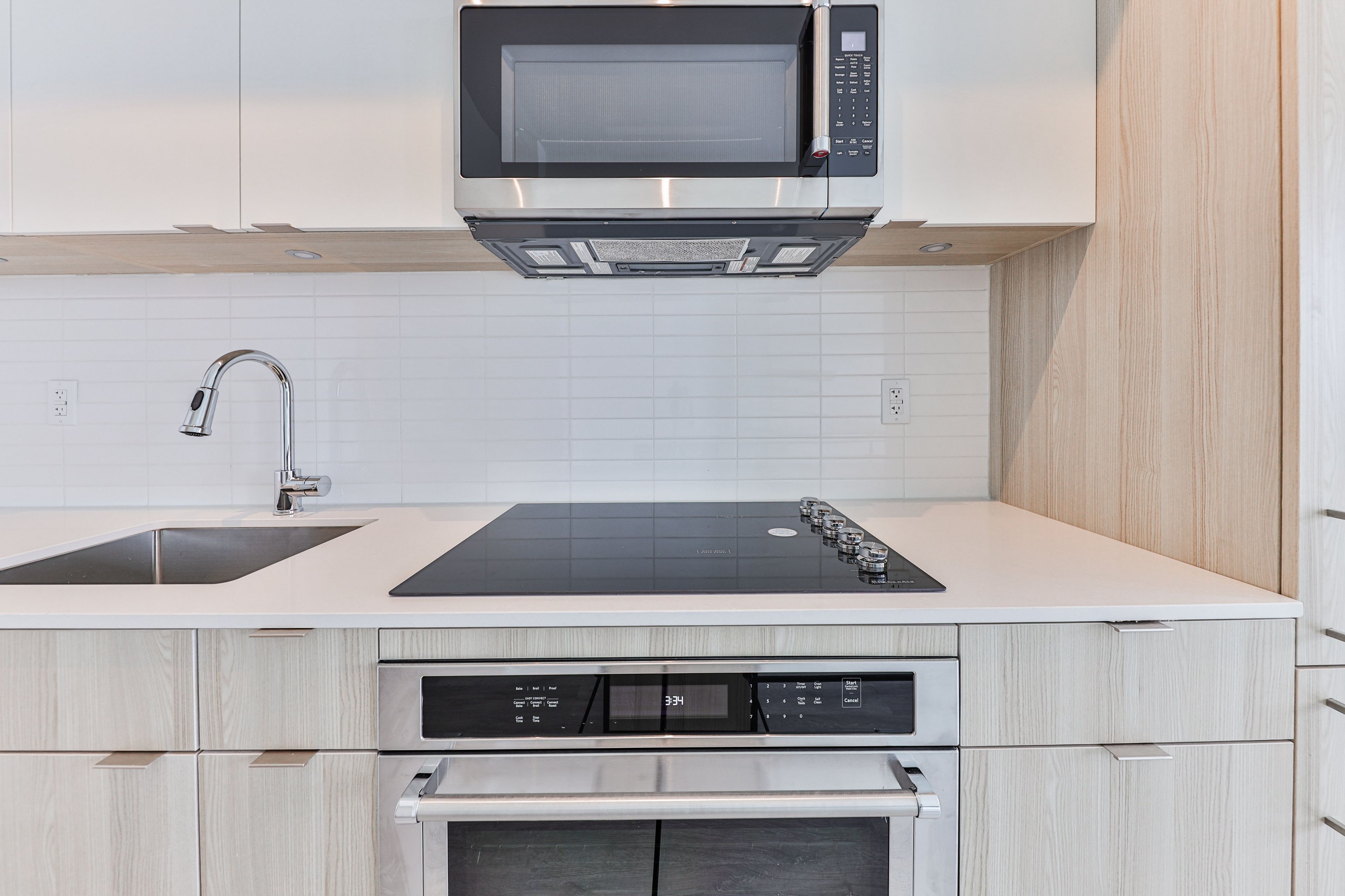 • Modern kitchen with built-in appliances and large floor-to-ceiling windows.
