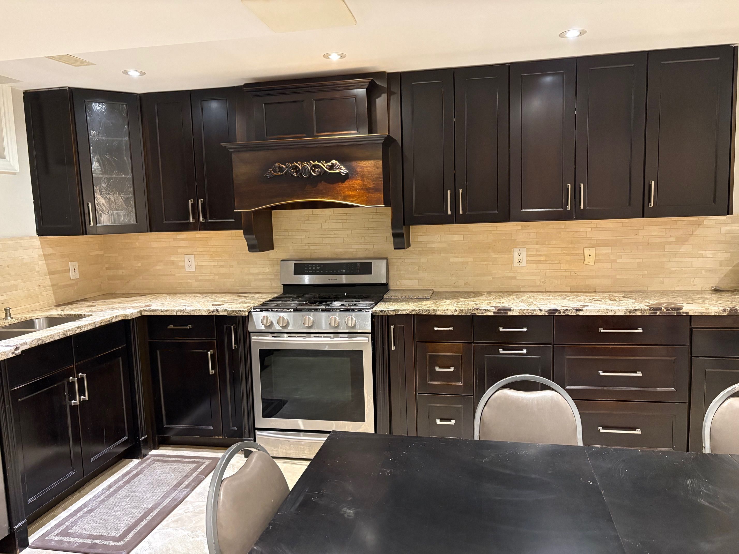 • Chef's kitchen with granite countertops and stainless steel appliances.