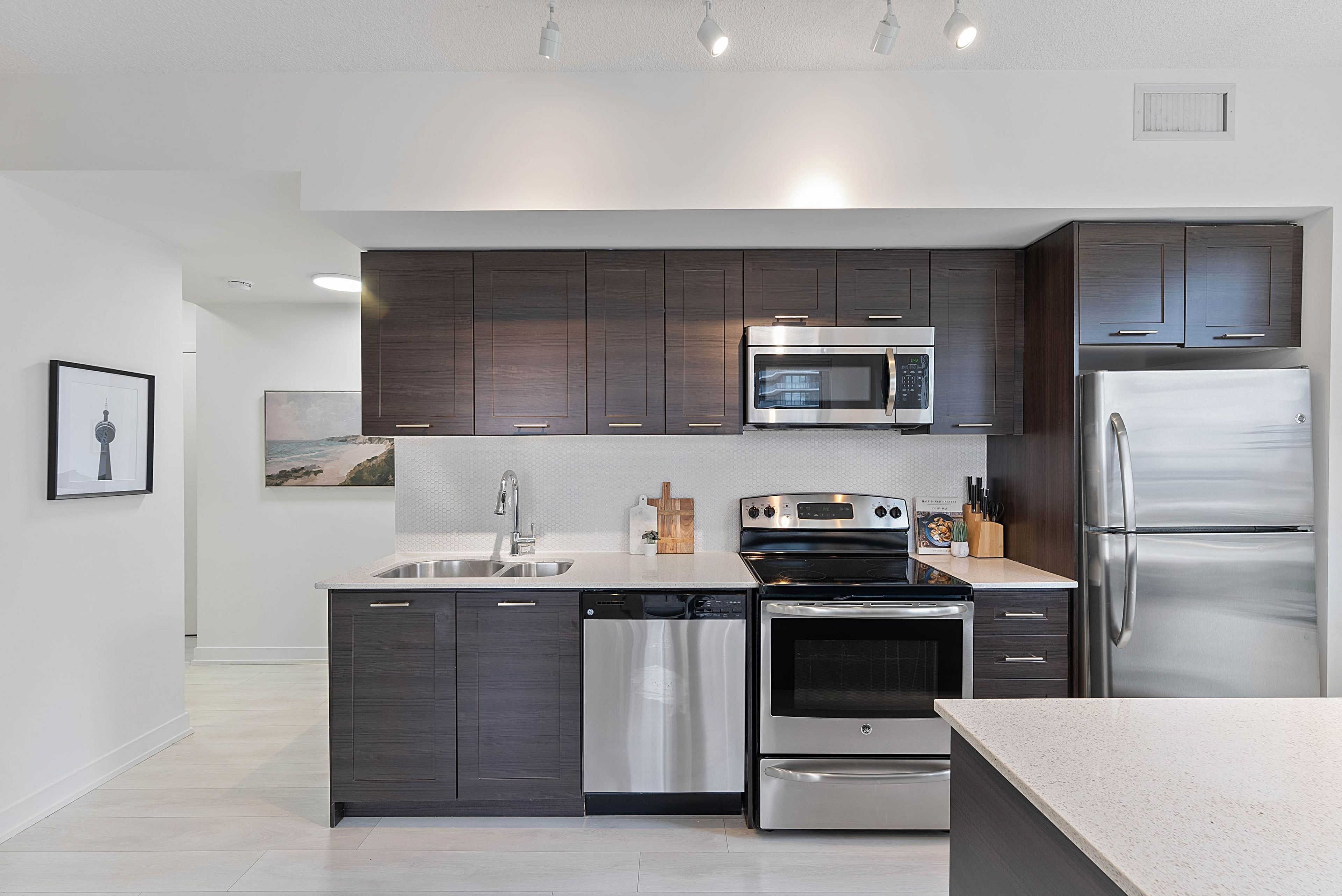 Welcome to suite 611 at 2200 lake shore boulevard west, a rarely offered corner unit in desirable westlake village, ideally located in the heart of humber bay shores. This spacious 2 bedroom + den, 2 bathroom suite offers 794 sf of interior living space paired with an impressive 767 sf wrap-around terrace-an extension of the living space with panoramic exposures to the north, west and south, including views of lake ontario. The functional open-concept layout is filled with natural light from expansive windows, features 9' ceilings and laminate flooring throughout and includes an stylish, upgraded kitchen with rich dark cabinetry, quartz countertops, stainless steel appliances, a tile backsplash and a centre island with breakfast bar that flows seamlessly into the living area with walk-out to the terrace for effortless indoor-outdoor living, a well-appointed primary bedroom with a large walk-in closet, additional built-in wardrobe, a 4-piece ensuite and a large windows, a versatile second bedroom with a custom murphy bed with a built-in desk and shelves ideal for guests or as flexible use space, a separate den perfect for a dedicated home office, convenient ensuite laundry and a 3-piece bathroom. Additional upgrades include hunter douglas ultraglide duette blinds (sheer and blackout), custom closet organizers, added storage solutions and a refurbished hvac fan coil unit (2023). Parking and locker included. Residents enjoy access to club w amenities including an indoor pool, hot tub, fitness centre, yoga studio, sauna and steam room, theatre, party room, outdoor terrace with bbqs, guest suites and 24-hour concierge. Westlake village offers over 60,000 sq ft of retail at your doorstep including metro, lcbo, starbucks & more. Steps to the martin goodman trail, waterfront parks, marina and beaches, with easy access to ttc, mimico go and the gardiner expressway. A rare opportunity to own a bright corner suite with exceptional outdoor space in a true waterfront community!