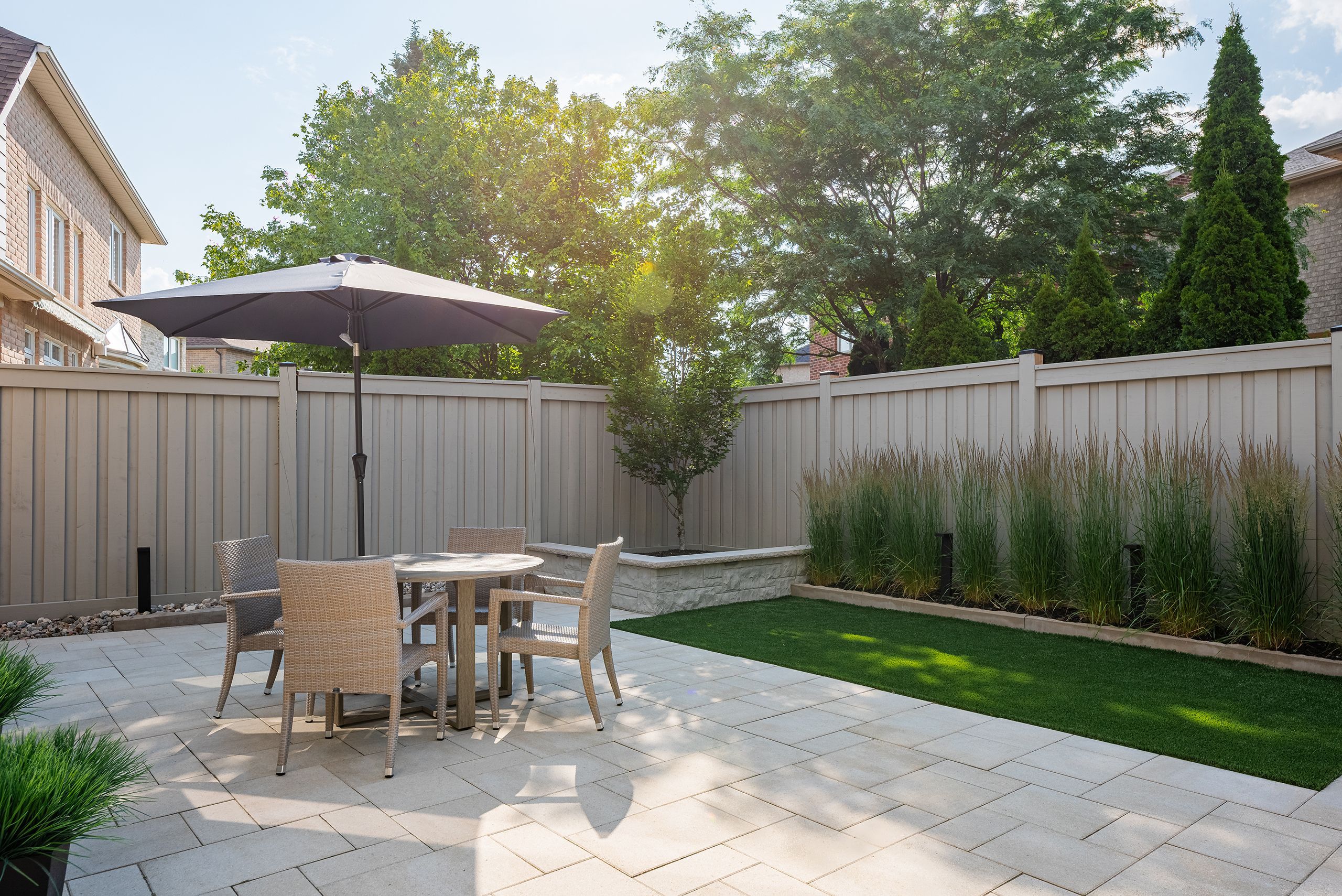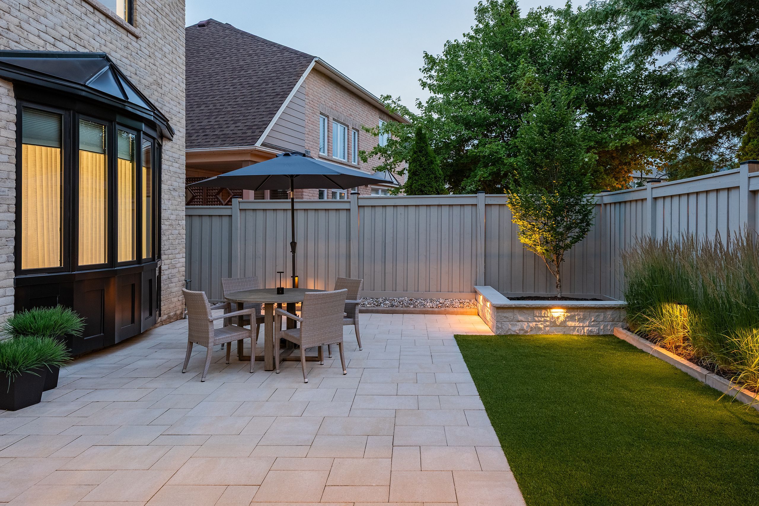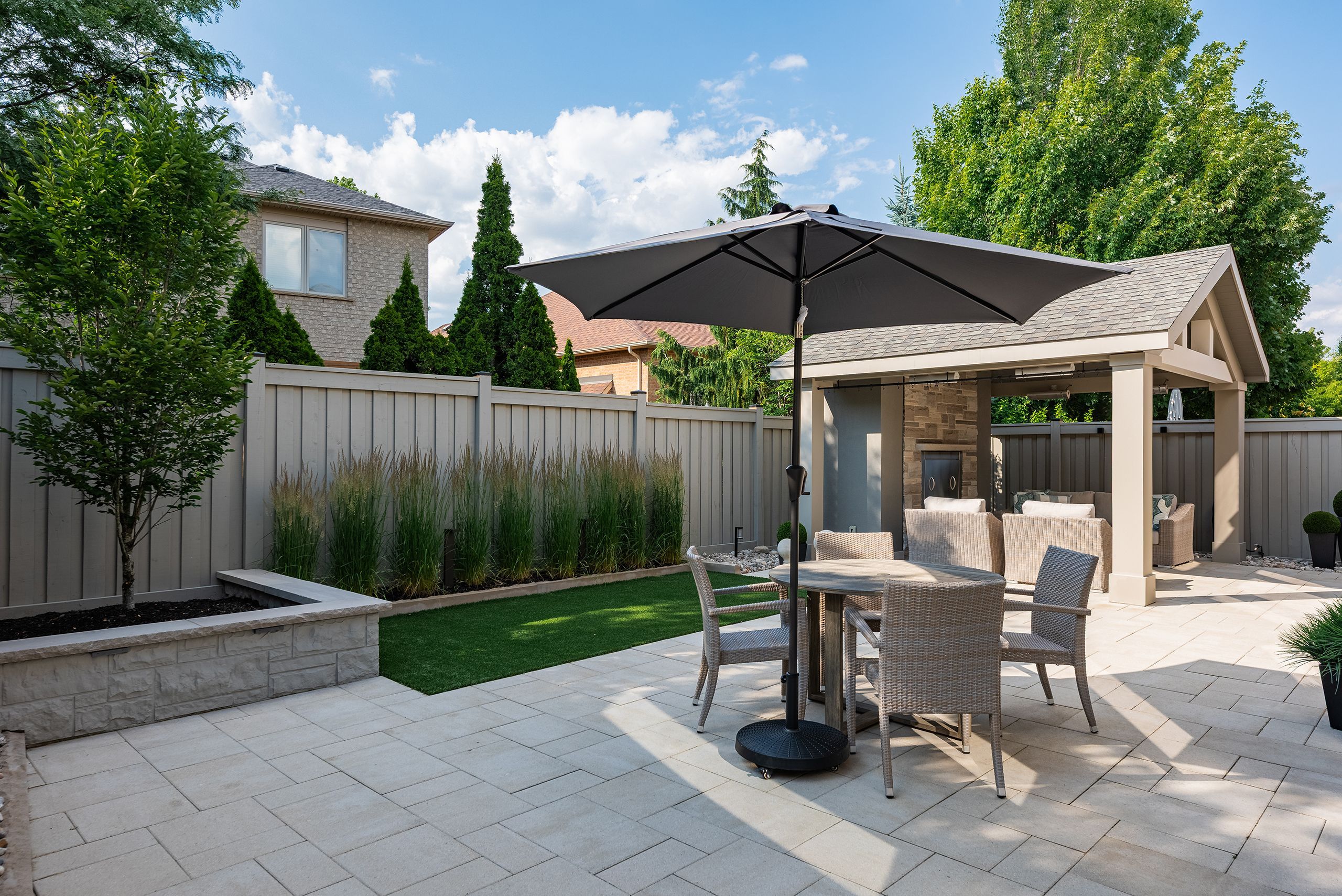 • Low maintenance backyard features custom pavilion with fireplace for relaxation.