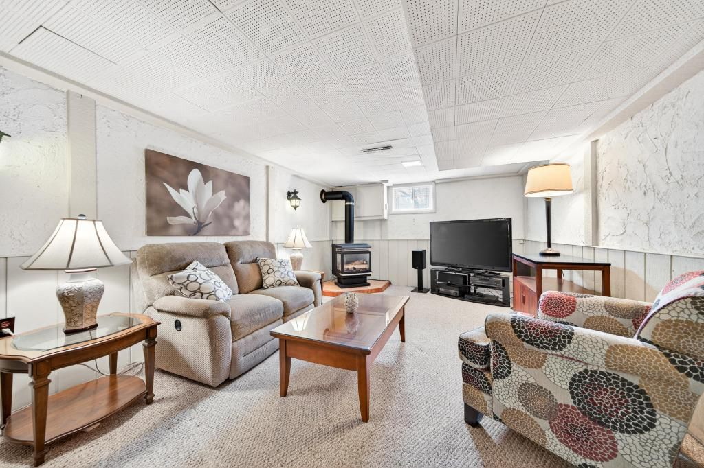 • Spacious living room featuring a floor-to-ceiling stone fireplace.