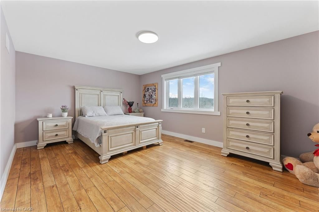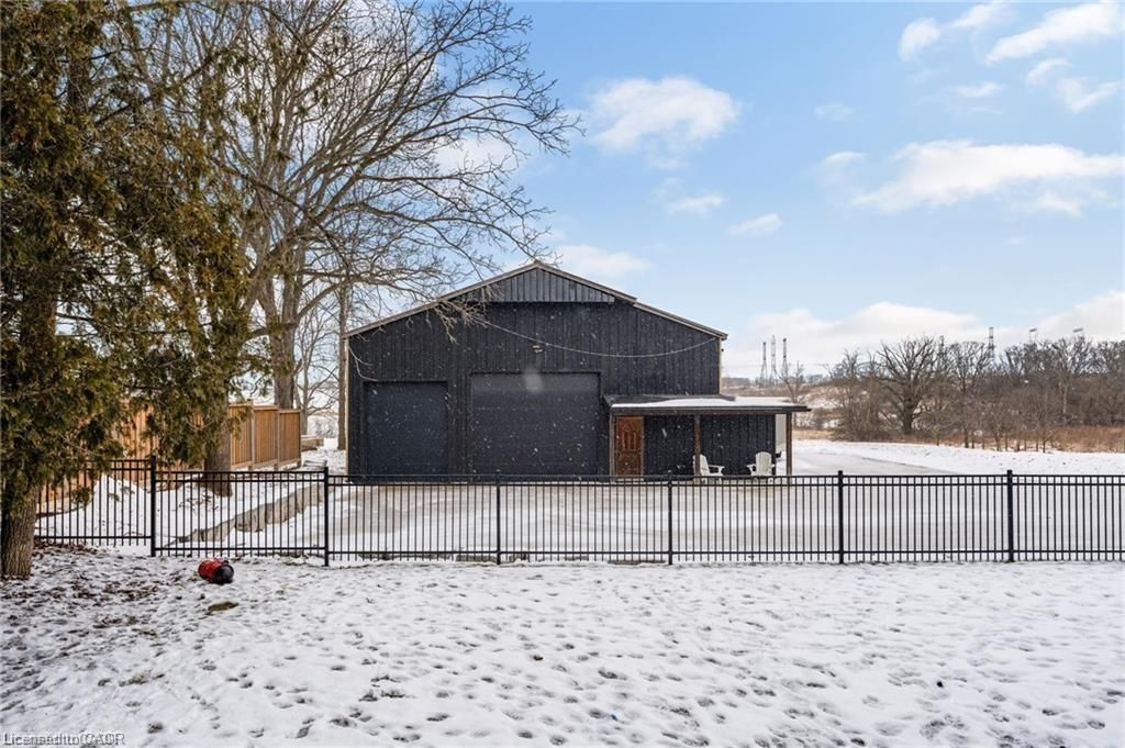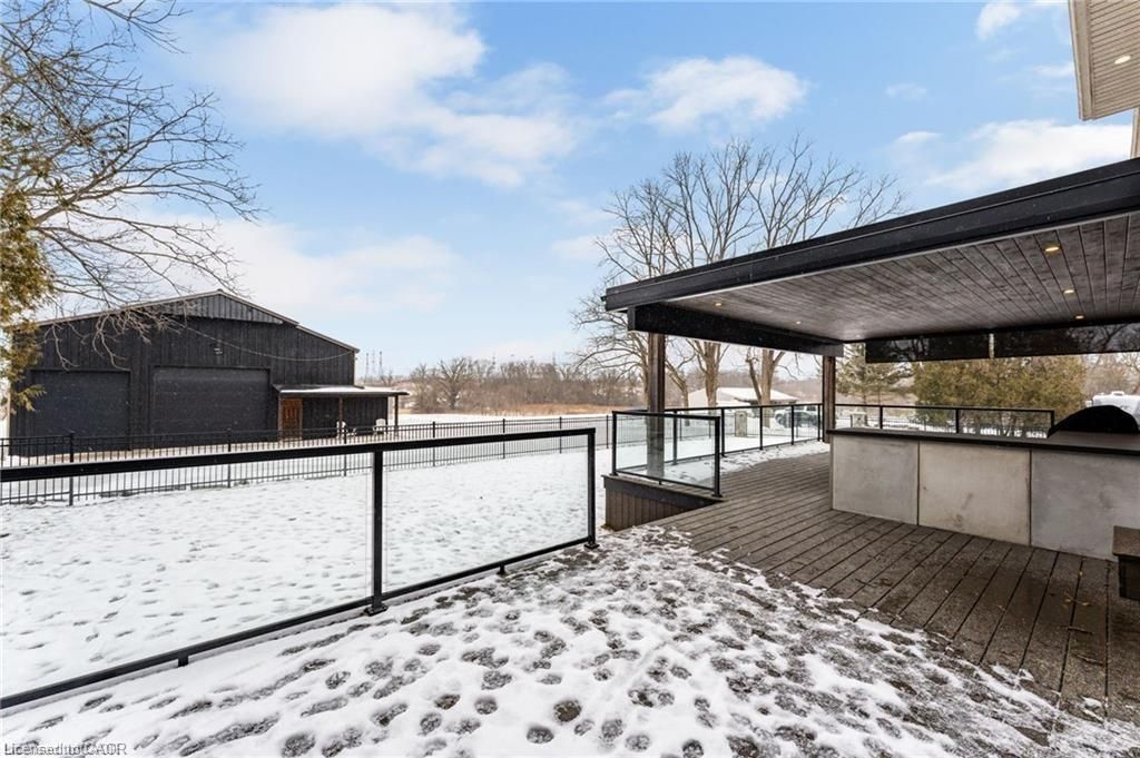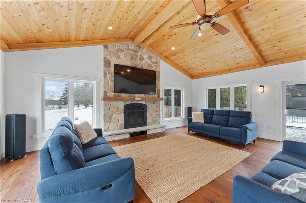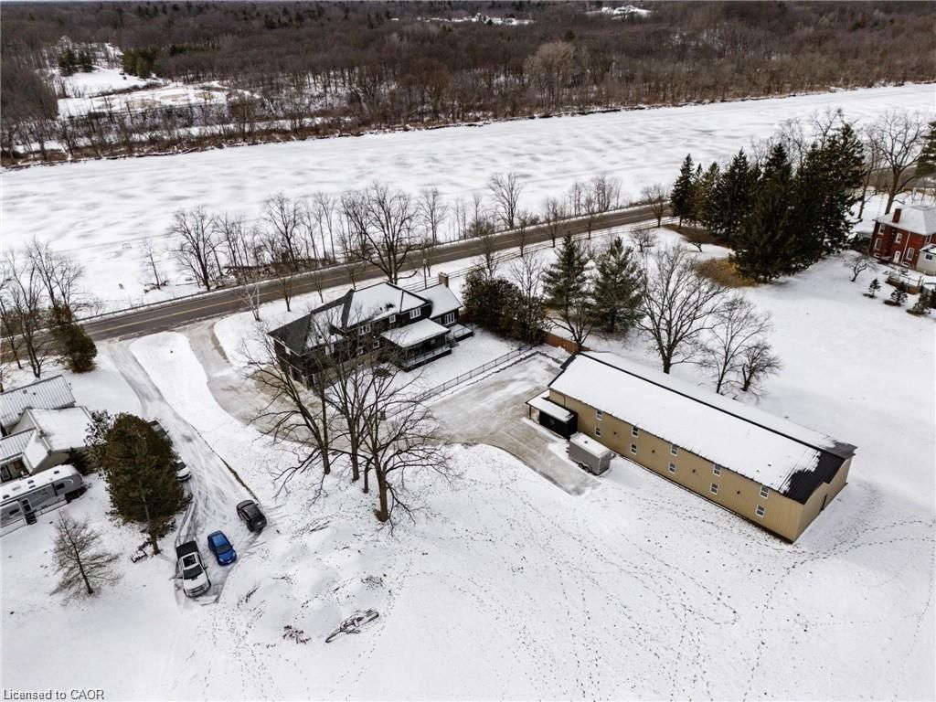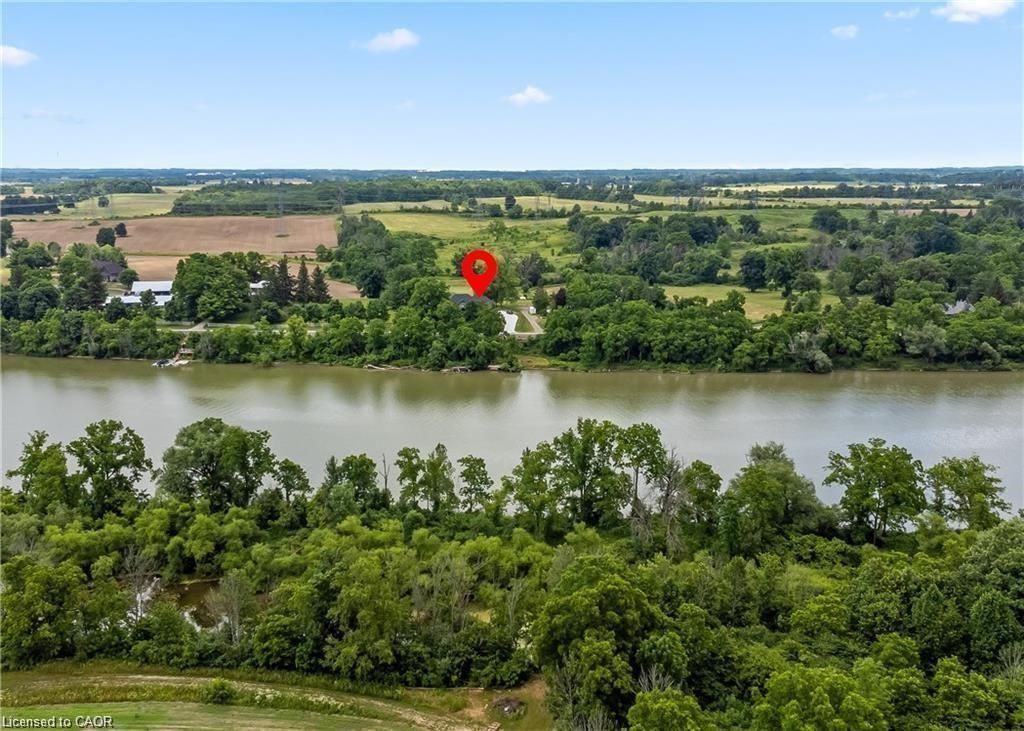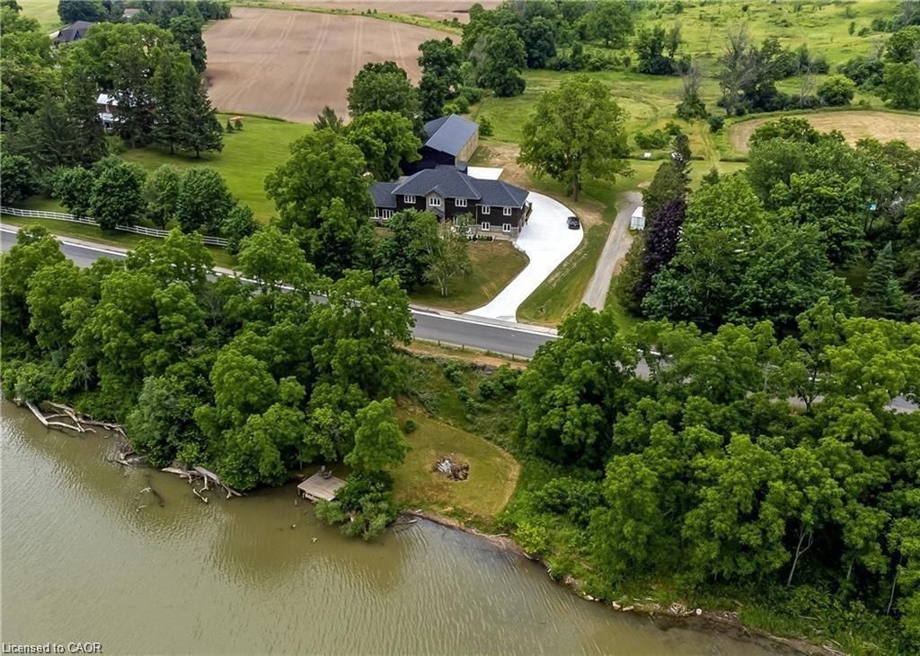 This stunning 5-bedroom, 2. 5-bathroom home spans over an energy efficient 3,800+sq/ft and is perfectly positioned to overlook the breathtaking grand river. Nestled on a generous lot overlooking rolling fields at the back and river access just across the street, it's an ideal setting for those who love the outdoors. Adding to its appeal, a massive 100' x 40' detached shop provides endless possibilities for hobbies, storage, or business use (w/ high speed fibre internet). The main floor boasts a spacious and inviting layout with 9ft ceilings, featuring a custom kitchen with a wood-paneled ceiling, stone countertops, a stylish herringbone backsplash, and a large island-perfect for gathering with family and friends. The adjacent dining room, with its tray ceiling and wood accent wall, offers picturesque views of the grand river. The oversized great room is a true showstopper, complete with a floor-to-ceiling stone fireplace, vaulted ceiling, and expansive windows that frame stunning views in every direction. Step through one of two patio doors to your private outdoor oasis, featuring a large covered patio and built-in outdoor kitchen, ideal for entertaining. On one elevated side of the home, the primary suite offers a peaceful escape with a walk-in closet and a luxurious ensuite, complete with a custom tile shower. The second level hosts four additional bedrooms and a full 4-piece bathroom. The versatile basement offers even more potential, with its own private entrance from the attached double garage, making it an excellent option for an in-law suite or additional living space. For those needing extra room for vehicles, equipment, or recreational toys, this property delivers! The huge concrete parking area and driveway ensure ample outdoor storage/parking for vehicles/trailers. Don't miss this rare opportunity to own a spectacular home in a prime location with endless possibilities! Luxury certified