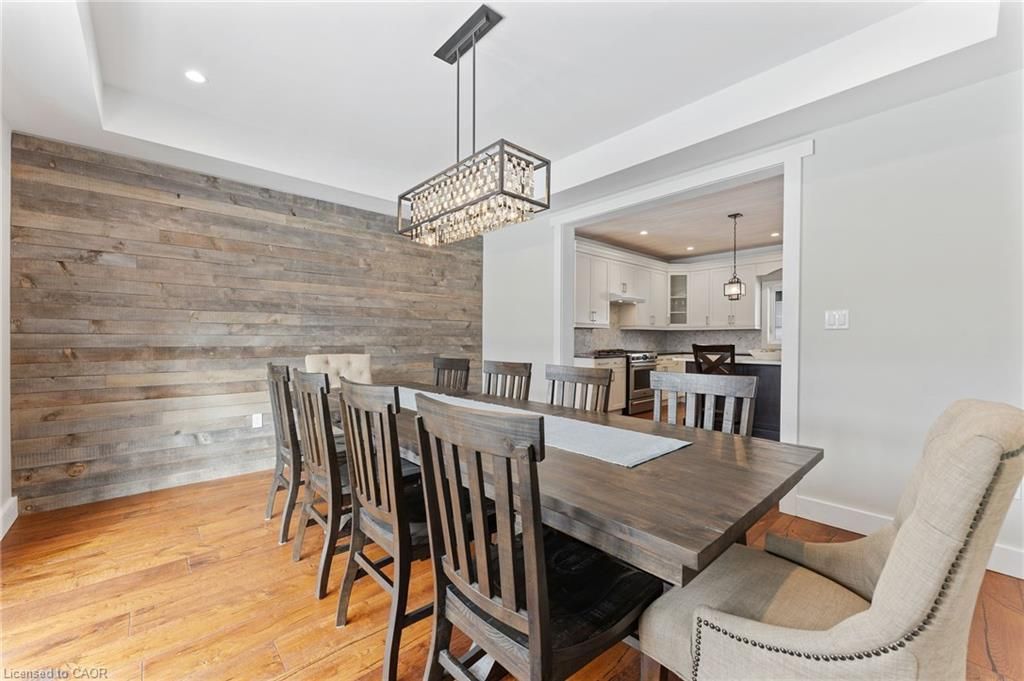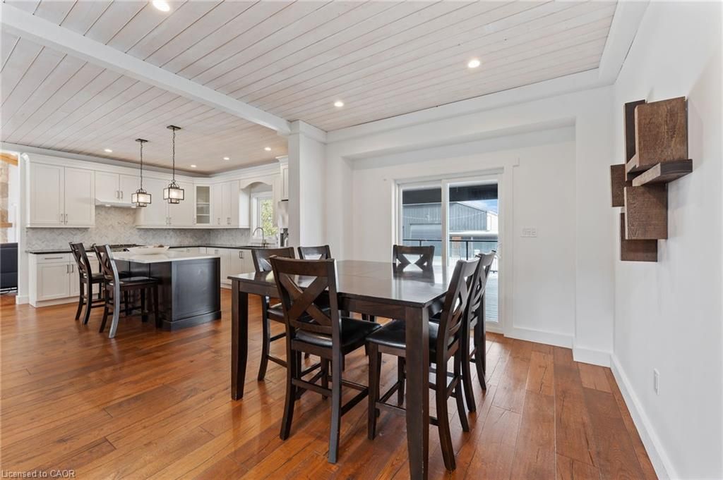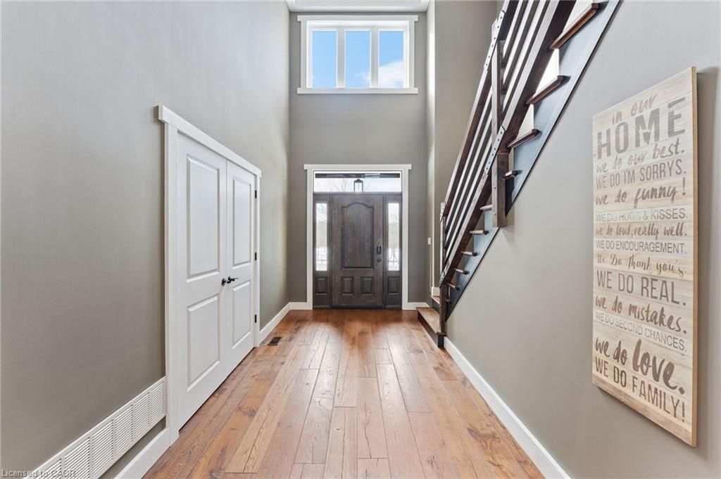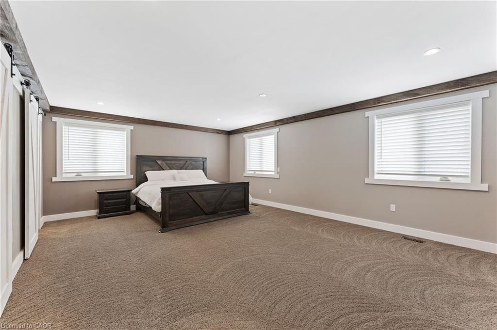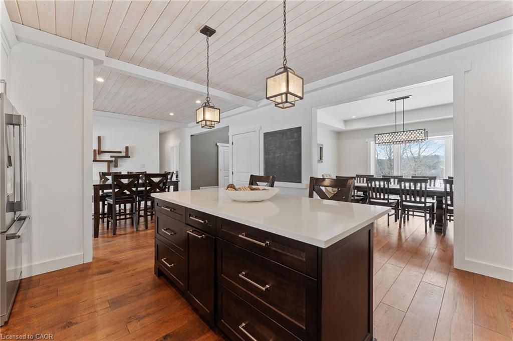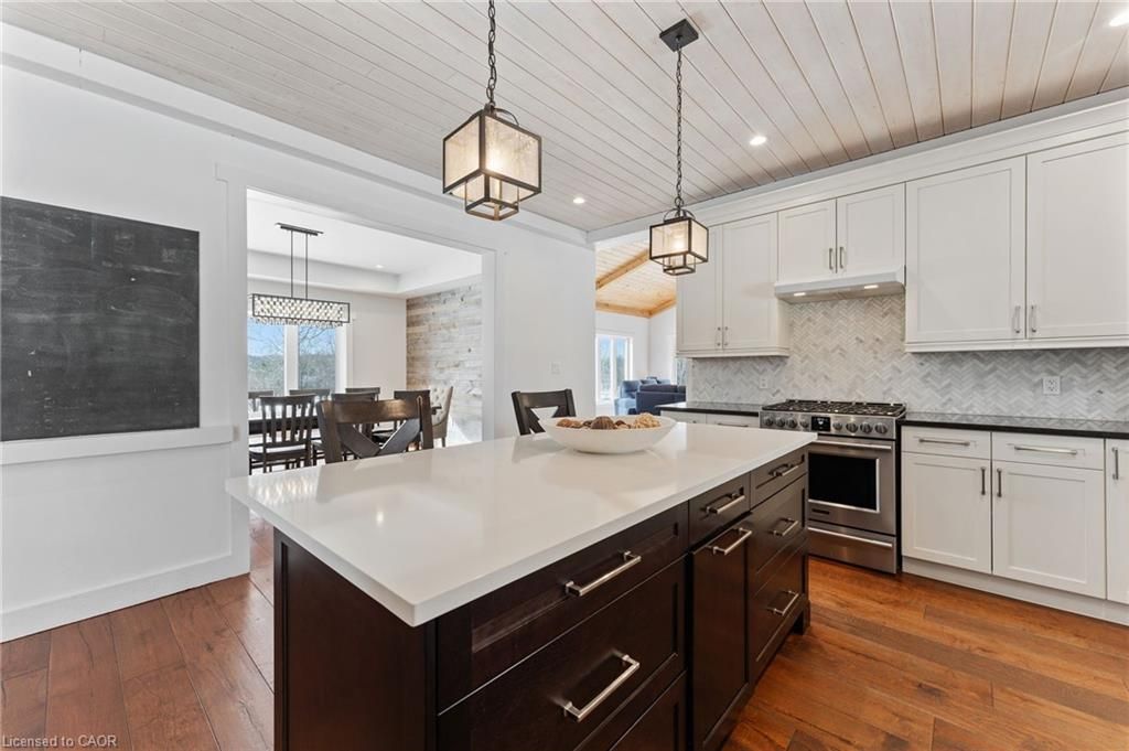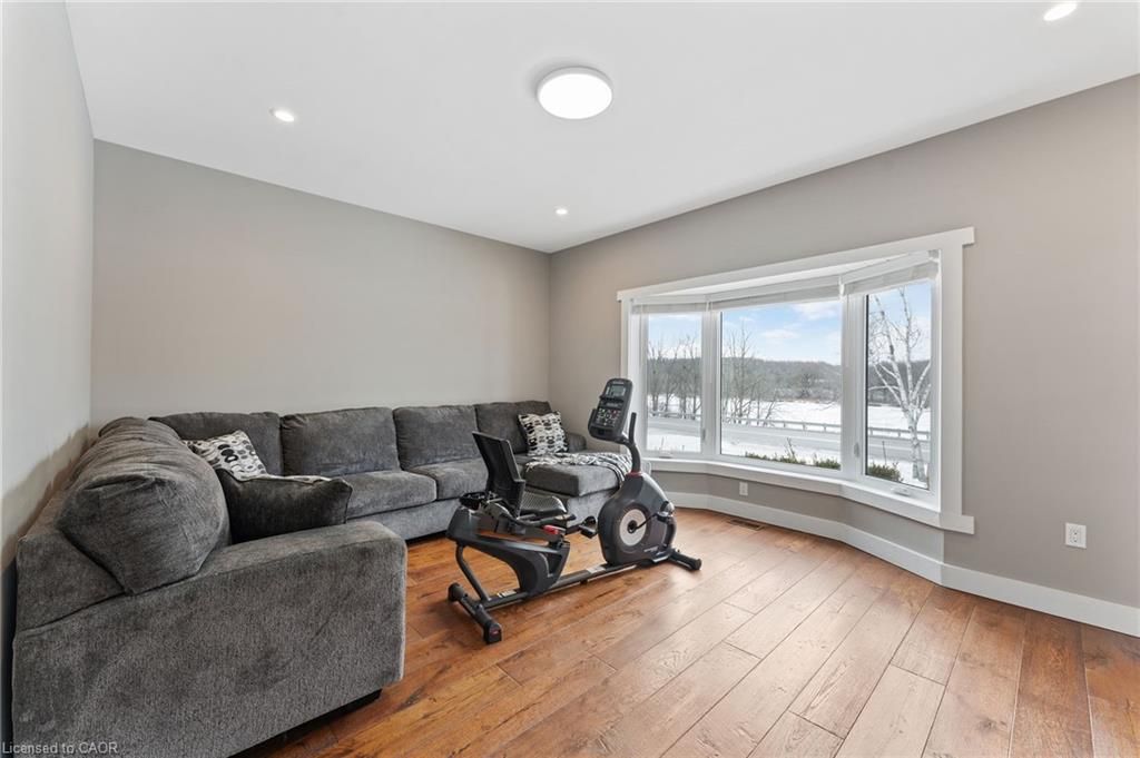 This stunning 5-bedroom, 2. 5-bathroom home spans over an energy efficient 3,800+sq/ft and is perfectly positioned to overlook the breathtaking grand river. Nestled on a generous lot overlooking rolling fields at the back and river access just across the street, it's an ideal setting for those who love the outdoors. Adding to its appeal, a massive 100' x 40' detached shop provides endless possibilities for hobbies, storage, or business use (w/ high speed fibre internet). The main floor boasts a spacious and inviting layout with 9ft ceilings, featuring a custom kitchen with a wood-paneled ceiling, stone countertops, a stylish herringbone backsplash, and a large island-perfect for gathering with family and friends. The adjacent dining room, with its tray ceiling and wood accent wall, offers picturesque views of the grand river. The oversized great room is a true showstopper, complete with a floor-to-ceiling stone fireplace, vaulted ceiling, and expansive windows that frame stunning views in every direction. Step through one of two patio doors to your private outdoor oasis, featuring a large covered patio and built-in outdoor kitchen, ideal for entertaining. On one elevated side of the home, the primary suite offers a peaceful escape with a walk-in closet and a luxurious ensuite, complete with a custom tile shower. The second level hosts four additional bedrooms and a full 4-piece bathroom. The versatile basement offers even more potential, with its own private entrance from the attached double garage, making it an excellent option for an in-law suite or additional living space. For those needing extra room for vehicles, equipment, or recreational toys, this property delivers! The huge concrete parking area and driveway ensure ample outdoor storage/parking for vehicles/trailers. Don't miss this rare opportunity to own a spectacular home in a prime location with endless possibilities! Luxury certified