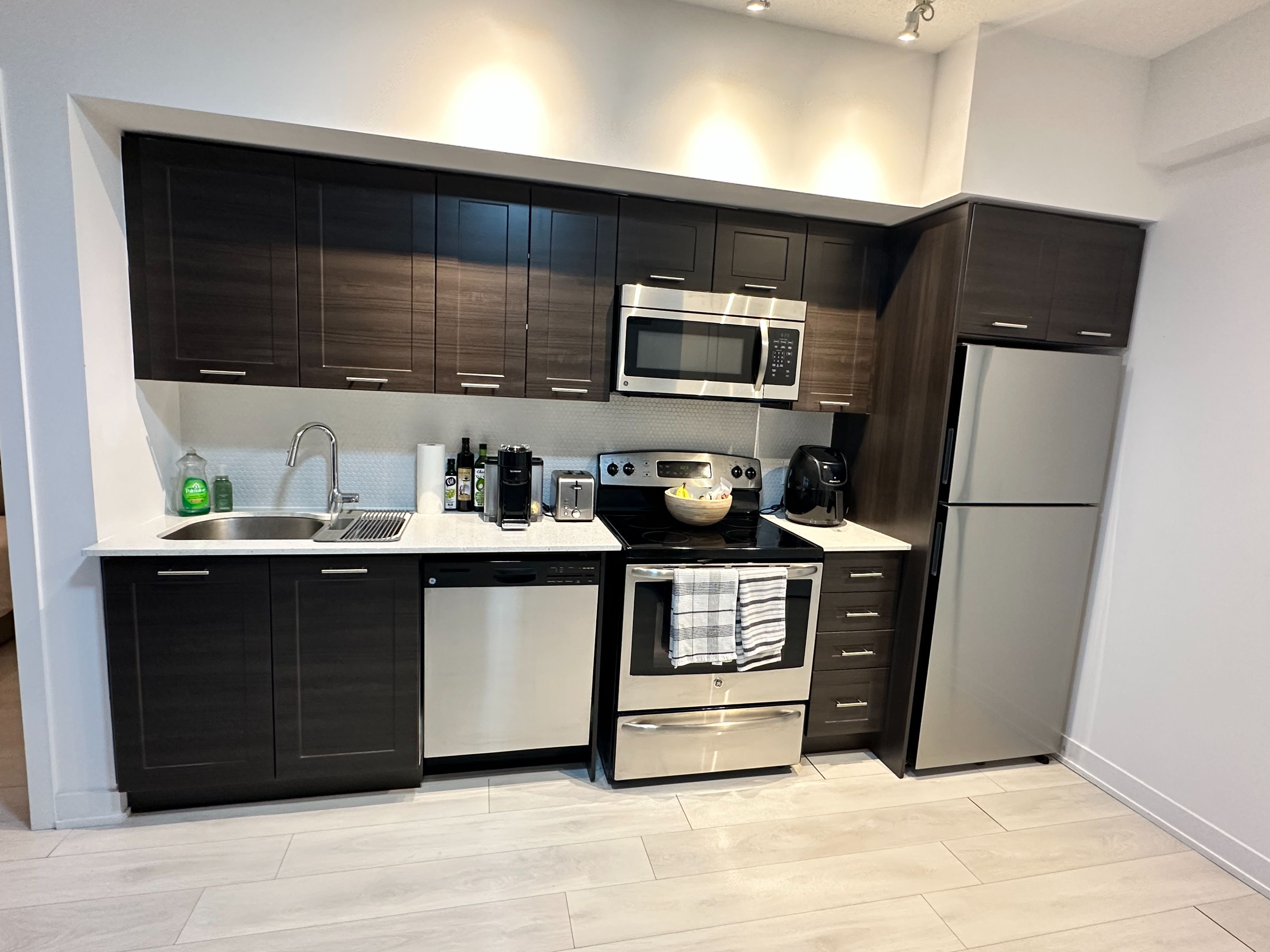 • Modern kitchen with stainless steel appliances and Caesarstone counters.