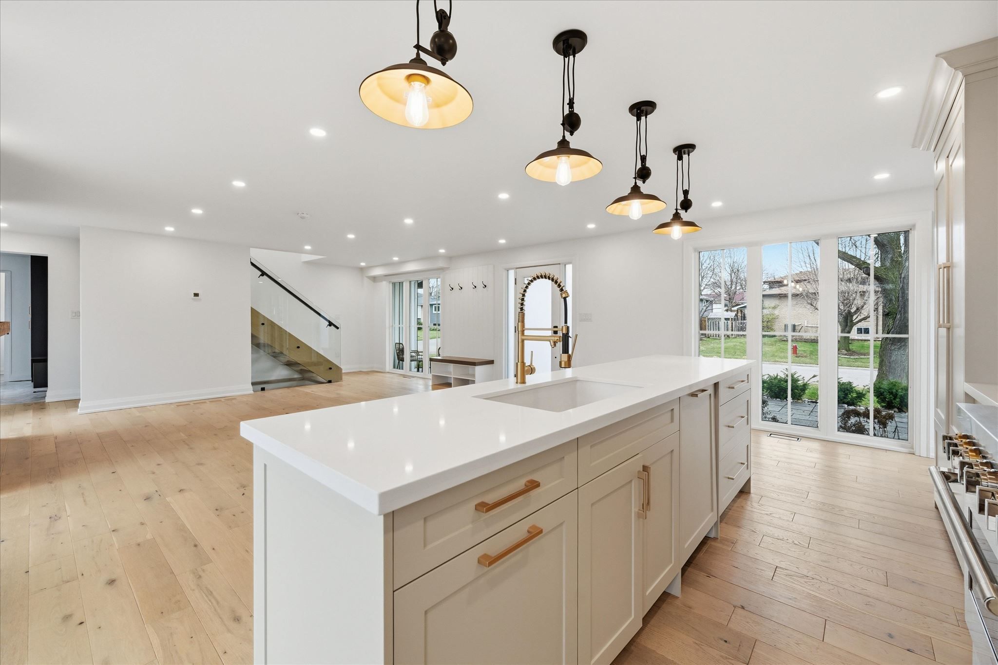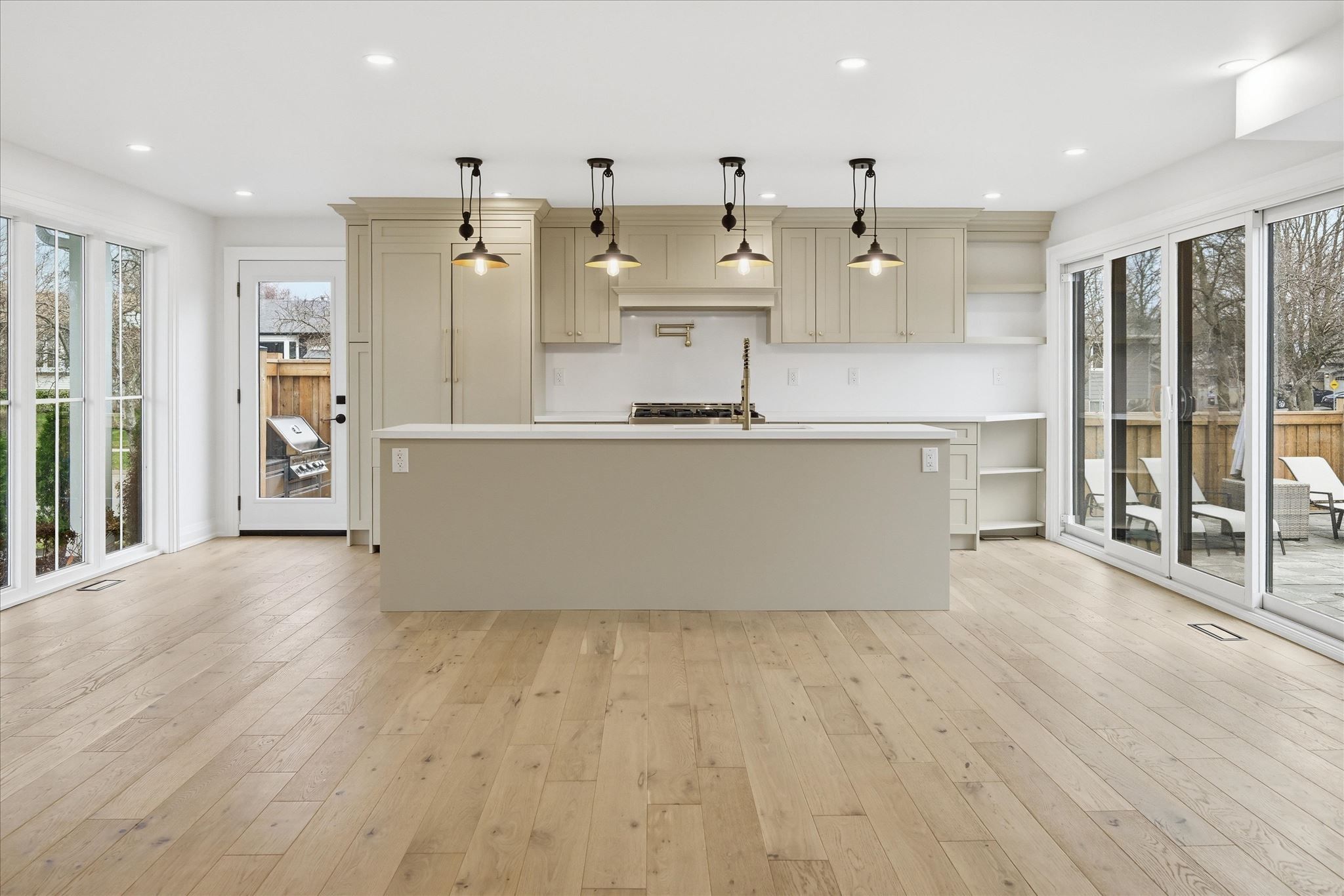 Recently reimagined for modern family living, this west oakville residence blends refined architectural design with a resort-style backyard retreat, all just minutes from the lake. Offering 4+1 bedrooms, 4. 5 bathrooms, and a finished lower level, the home delivers a seamless balance of style, comfort, and functionality. The main level is defined by engineered hardwood flooring, expansive floor-to-ceiling windows, and open-concept principal rooms designed for everyday living and entertaining. The custom kitchen showcases quartz countertops, a large centre island with sink, jennair gas range, pot filler, and effortless flow to the backyard. An open-riser staircase with glass panels adds architectural interest, while the living area is anchored by a feature wall with gas fireplace. Upstairs, engineered hardwood flooring continues throughout. The primary suite offers an accent wall, wall sconces, a walk-in closet with built-ins and window, and a spa-inspired ensuite featuring a freestanding tub, glass shower with rainfall showerhead, and double sinks. A second bedroom enjoys its own private three-piece ensuite, while two additional bedrooms share a well-appointed four-piece bath. A convenient laundry room with sink completes the upper level. Outdoors, the fully fenced backyard is a true showpiece. Designed for entertaining and relaxation, it features an inground pool with an eco-friendly and cost-effective copper ionizer system, extensive stone hardscaping, and a covered outdoor living area with gas fireplace. A dedicated bbq area with gas line and direct side-door access to the kitchen enhances both convenience and functionality. Ideally situated near parks, gladys speers public school, st. Dominic catholic elementary school, queen elizabeth park community and cultural centre, shopping, transit, major highways, and the lake, this home offers an exceptional lifestyle in a vibrant, family-friendly community. (certain exterior images have been digitally enhanced)