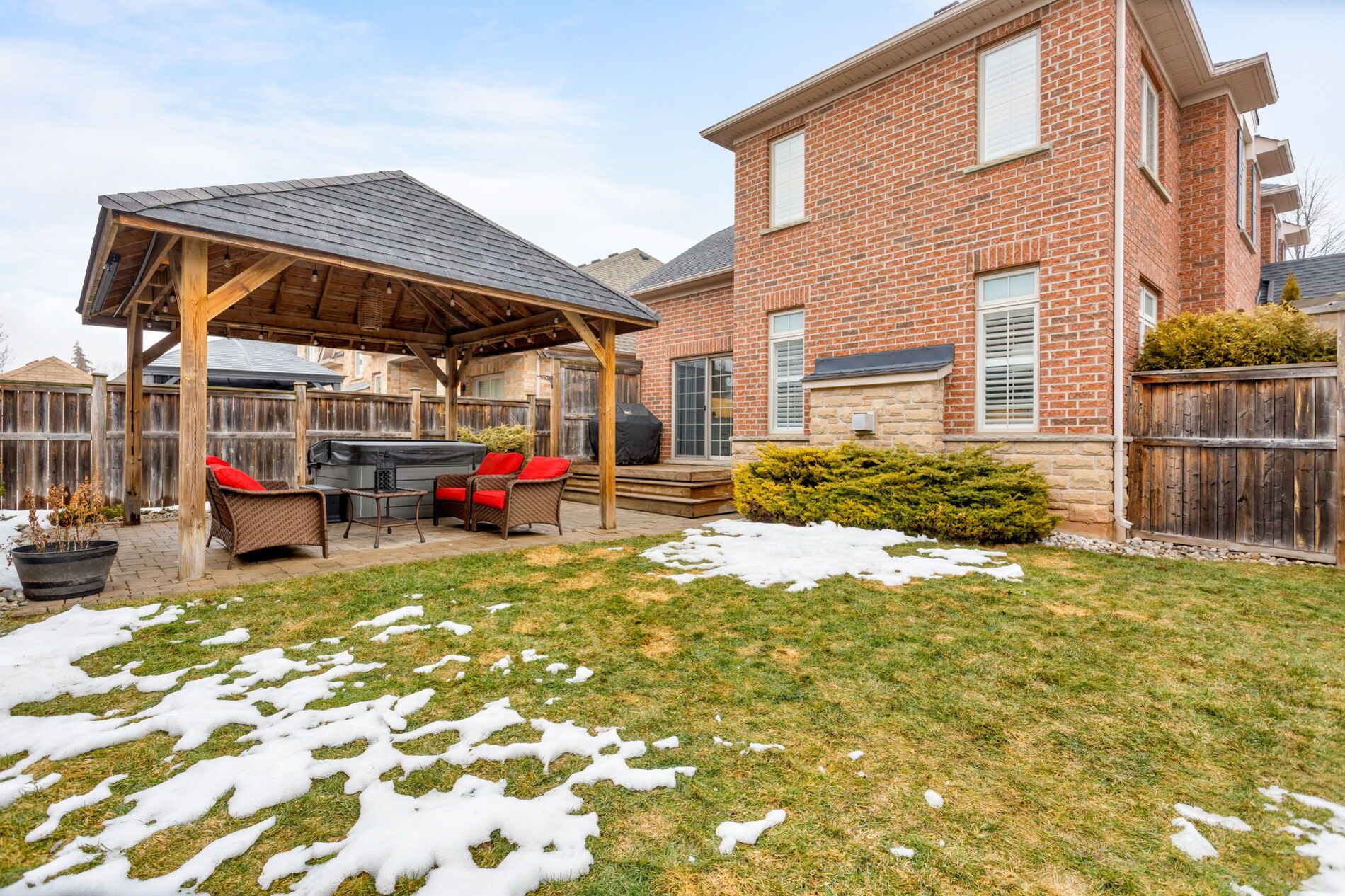 • Fenced backyard with a hot tub and large deck for relaxation.