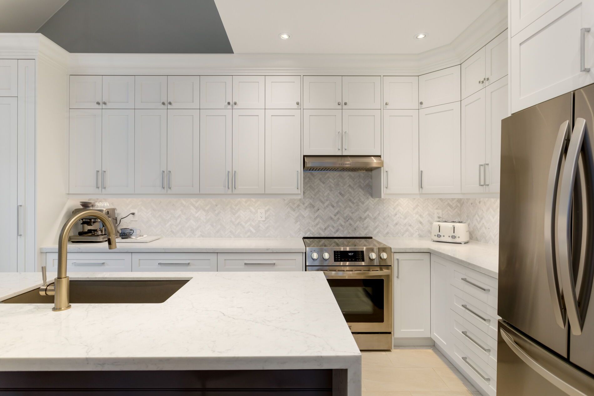 • Modern kitchen featuring quartz island and cathedral ceiling.