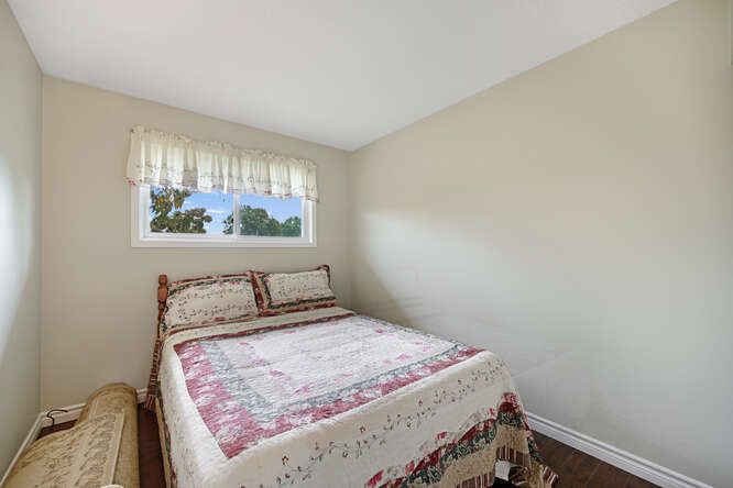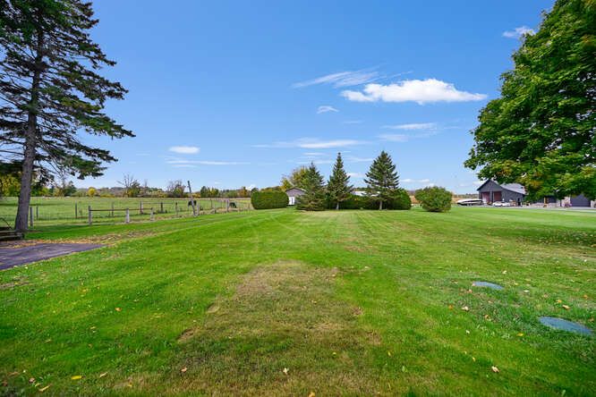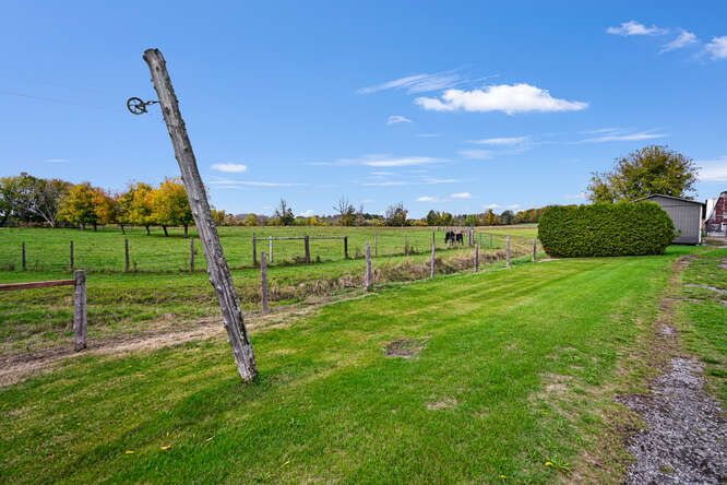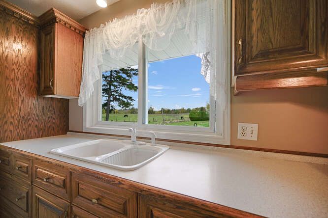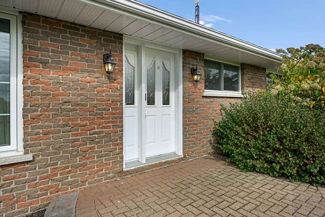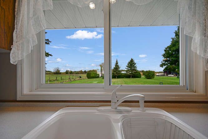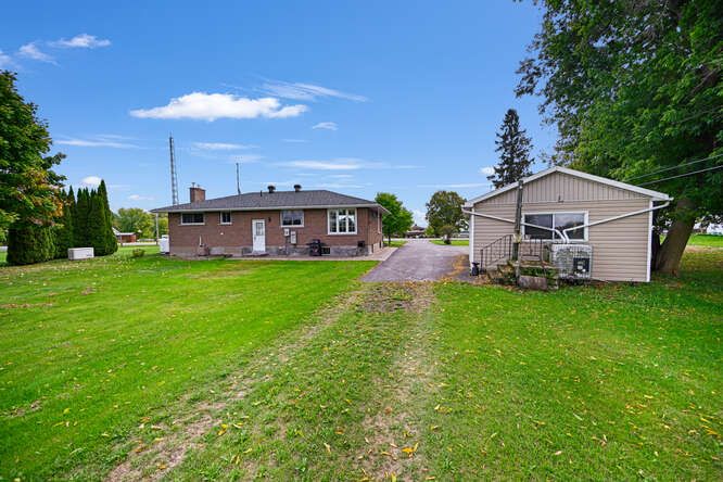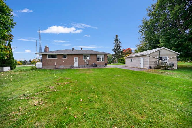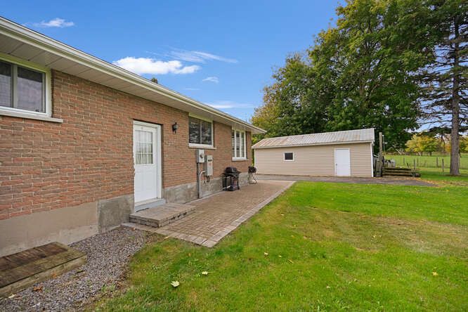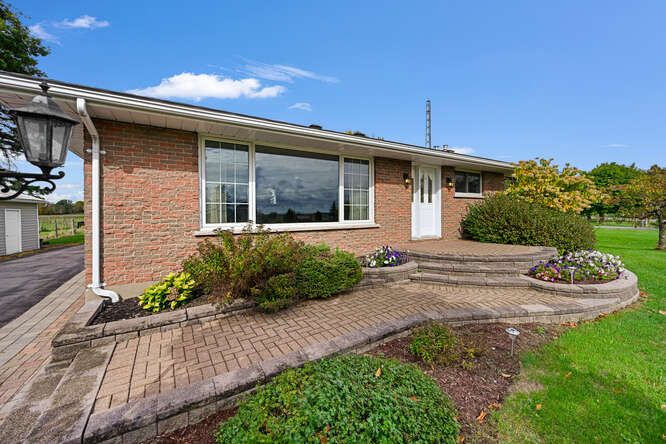 Absolutely lovely country living in a clean and updated brick bungalow. From your kitchen sink enjoy fields of corn as far as the eye can see, and cattle grazing. Close to all major transportation, including the international bridge. One hour to ottawa via hwy 416. Partial river views, near parks, boat launches, and all the seaway offers. Close to convenience store and gas mart. Open and renovated kitchen with island, all appliances included . Gleaming hardwood throughout with ceramic accents. 2 large bedrooms. One full bath with whirlpool tub, corner shower, vanity, sink, and the main floor laundry. Basement has one bedroom with natural light , and closets, beautiful ceramic flooring. 2 large utility rooms. Generous and warm family room, has raised gas stove. Linen closet, entry closet. Security lock. Remote garage door on the 16' by 30', steel roofed, one car garage. Clothesline deck and water gather back of garage. Nicely landscaped with interlocking on walkways, flowering shrubs, and raised gardens. New roof 2023, windows 2015, furnace and stove 2017. Generac. All other upgrades found in documents. 24 hour irrevocable.
