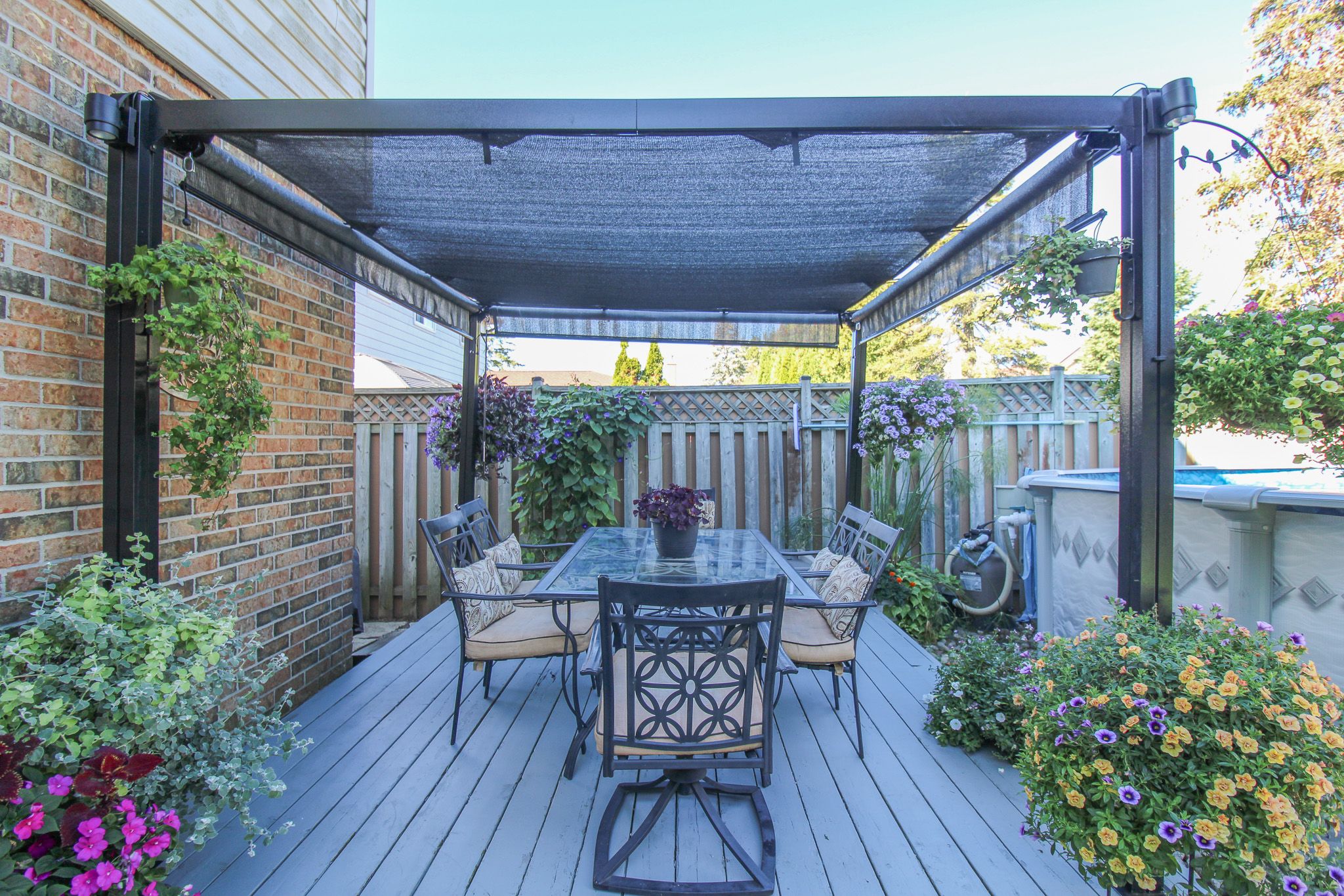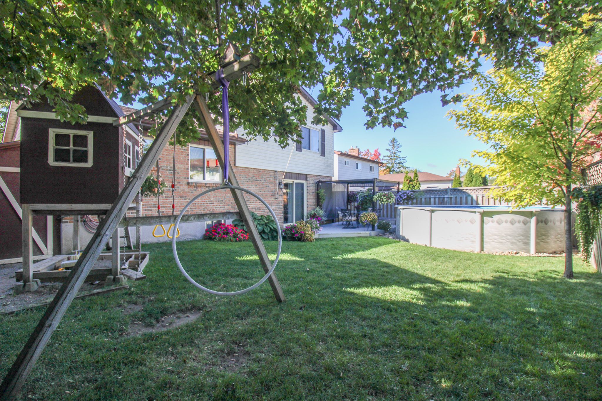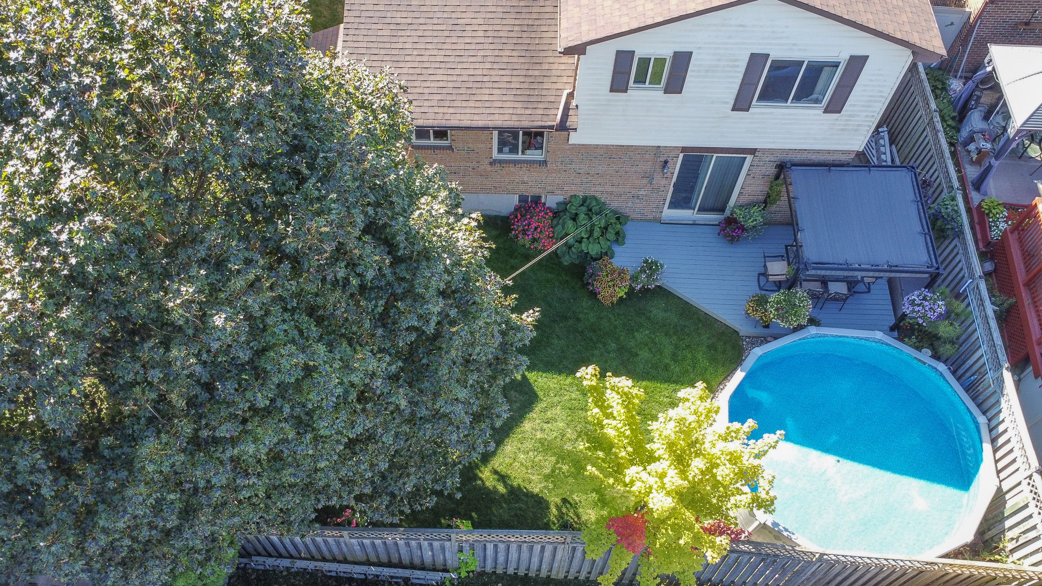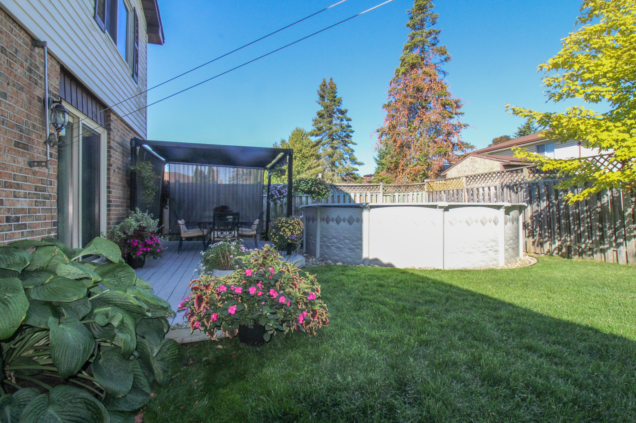 • Fully fenced backyard with custom structures and an above-ground pool.