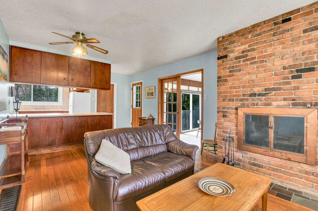 • Cozy family room with a brick-faced fireplace for relaxation.