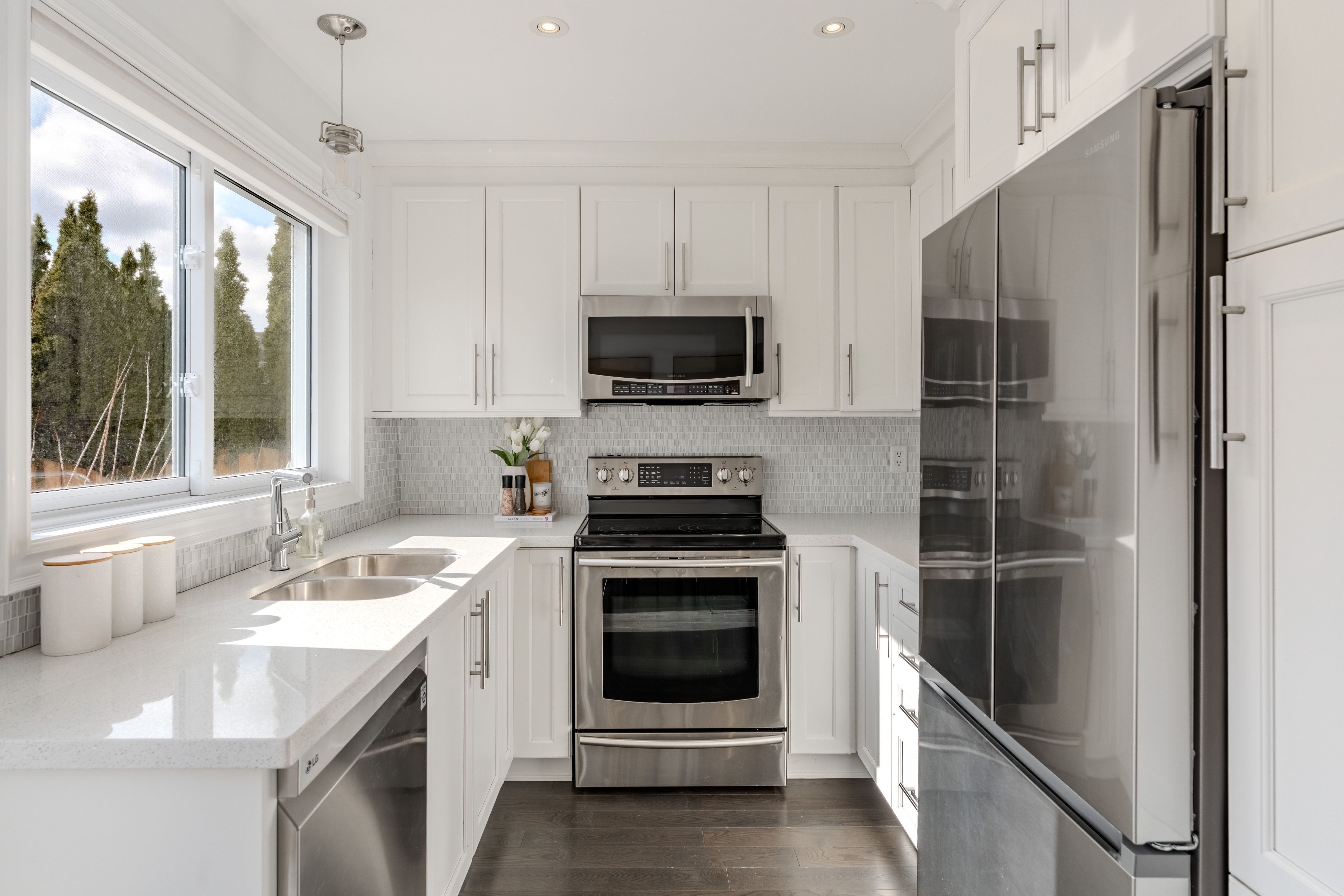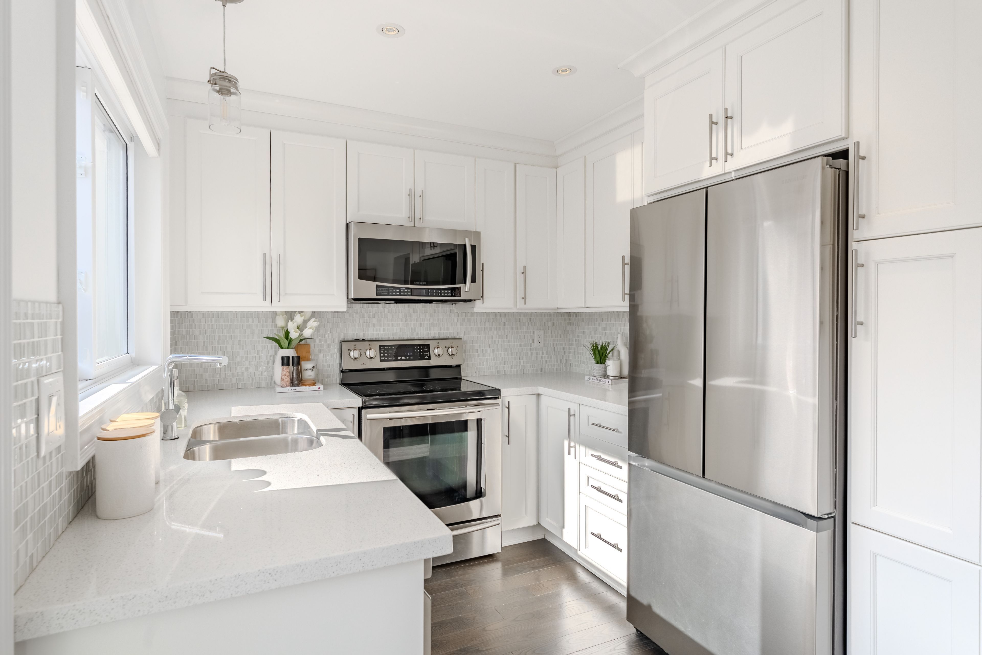 • Custom kitchen with quartz countertops and stainless steel appliances.