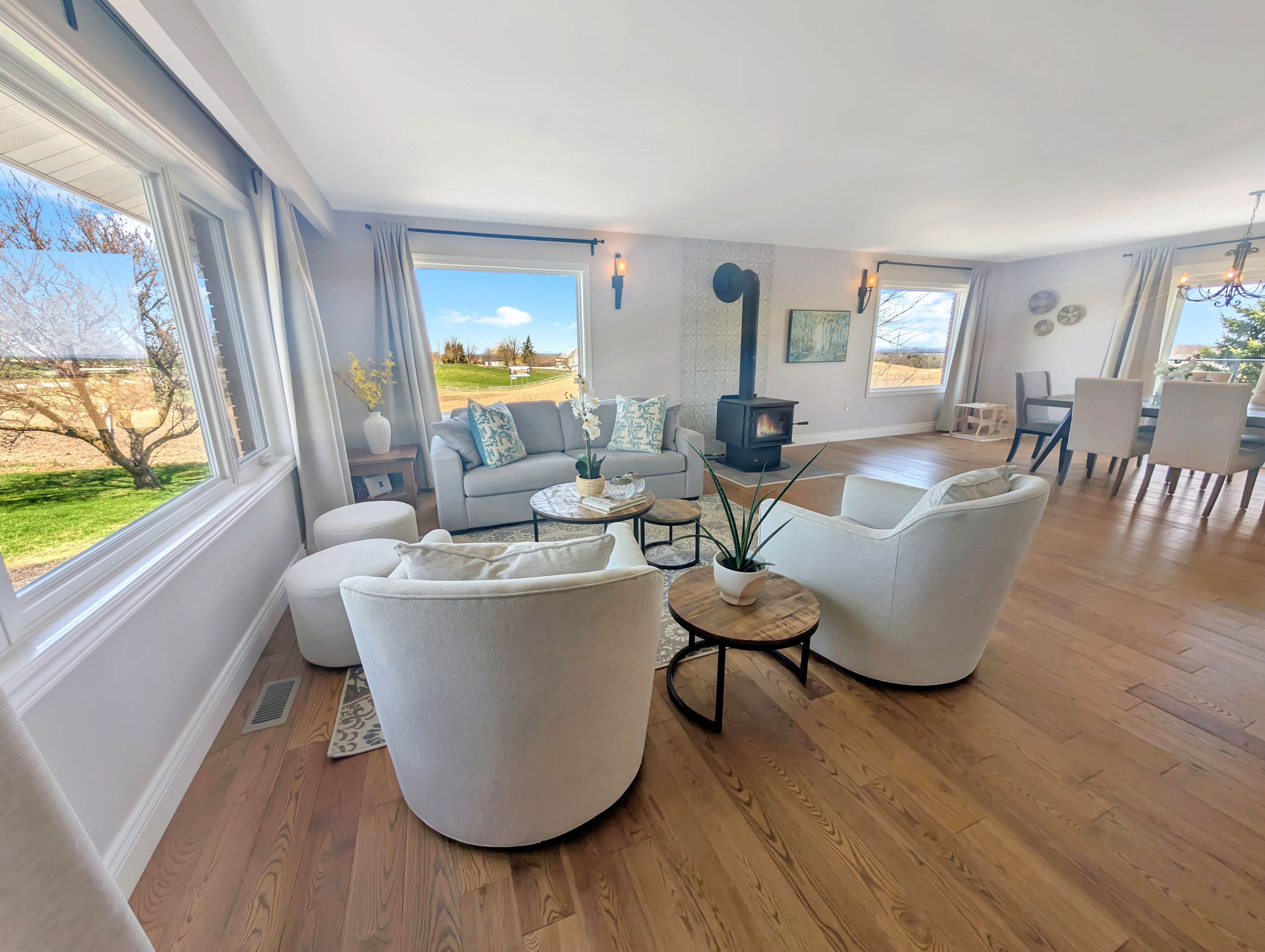 Welcome to this fully renovated and beautifully landscaped home offering panoramic views that expand from georgian bay to snow valley ski resort. Situated on a spacious 1-acre lot, this 5-bedroom, 3-bathroom gem is perfect for families or multi-generational living with its separate in-law suite with private entrance. Enjoy the heart of the home in the oversized kitchen featuring a large island, quartz countertops, and open flow into the main living area. The main floor boasts hardwood flooring, a cozy wood-burning fireplace, and a spacious bedroom and full bath, ideal for guests or single-level living. Step outside onto the expansive, maintenance-free water shedding pvc deck complete with bbq propane hookup perfect for entertaining or relaxing while taking in the serene landscape. The lower level walk-out basement features a propane fireplace, ample living space, a bedroom, full bathroom and kitchen. This property also includes a double car garage and a large coverall shop providing abundant storage and workspace for all your tools, toys, and hobbies. The newly paved driveway has room for numerous vehicles. Located in the heart of a four-season paradise, you're just minutes to the charming town of creemore, devils glen, mad river golf club, dufferin county forest, wasaga beach and collingwood/blue mountain. Skiing, golfing, boating, and cycling adventures await right at your doorstep. Don't miss this rare opportunity to own a piece of paradise in clearview!