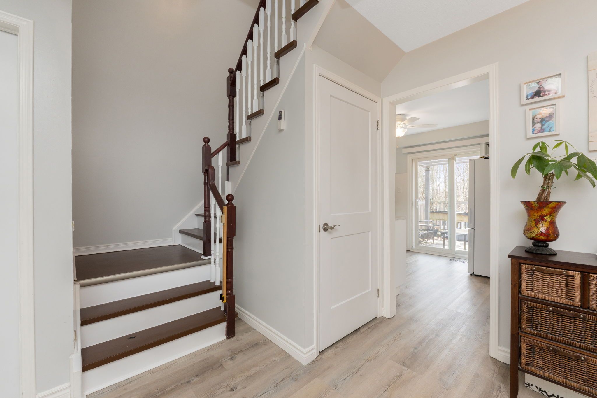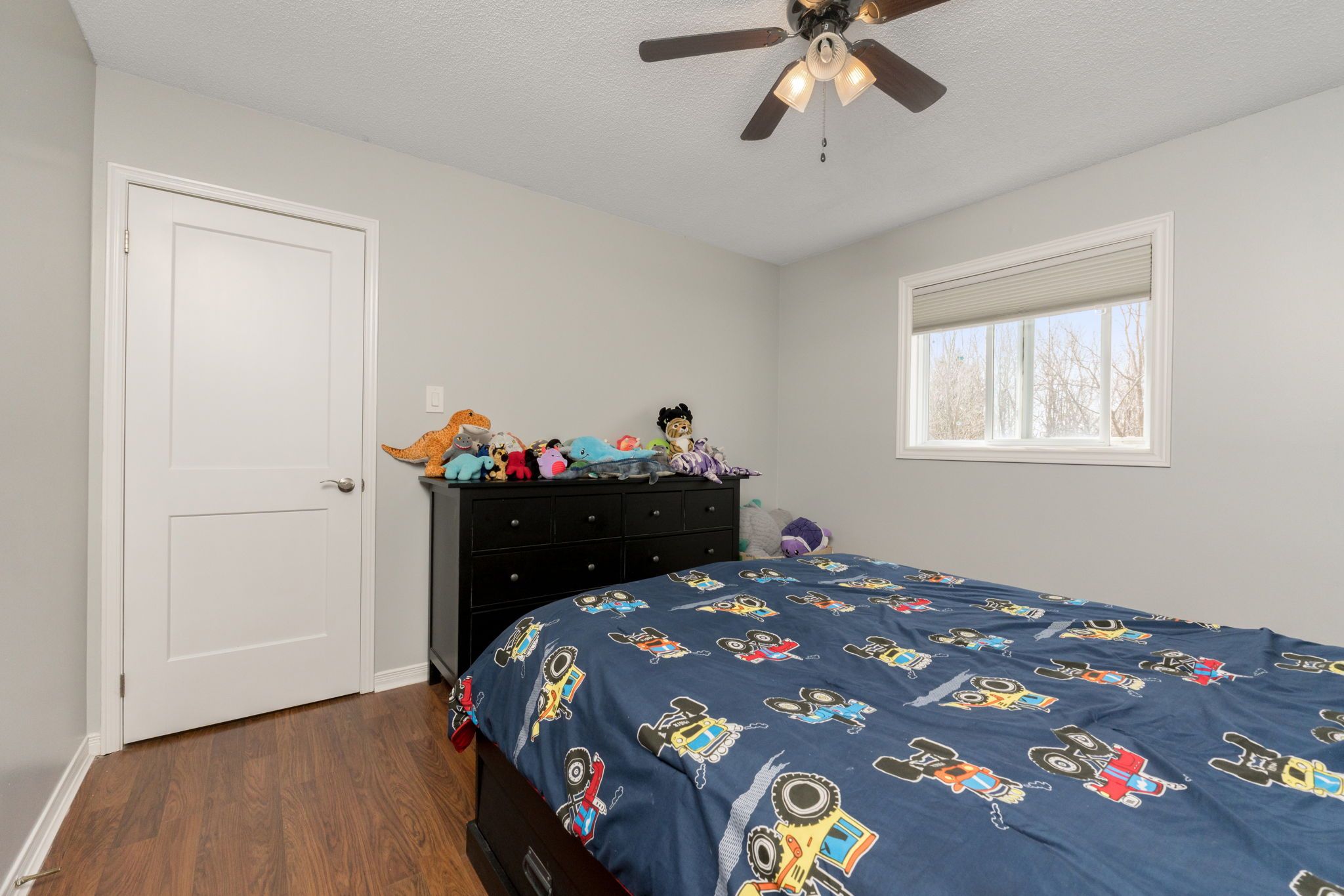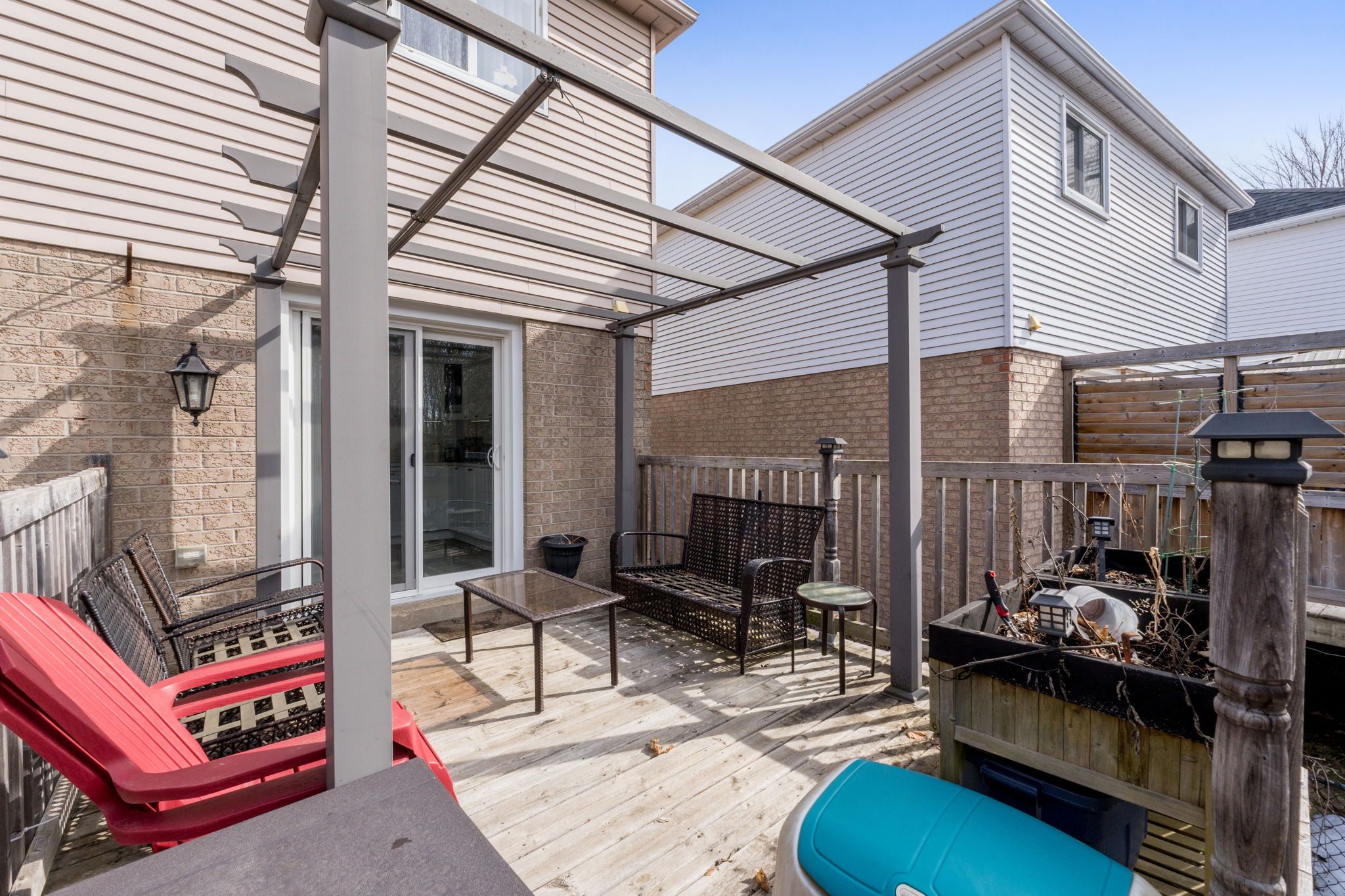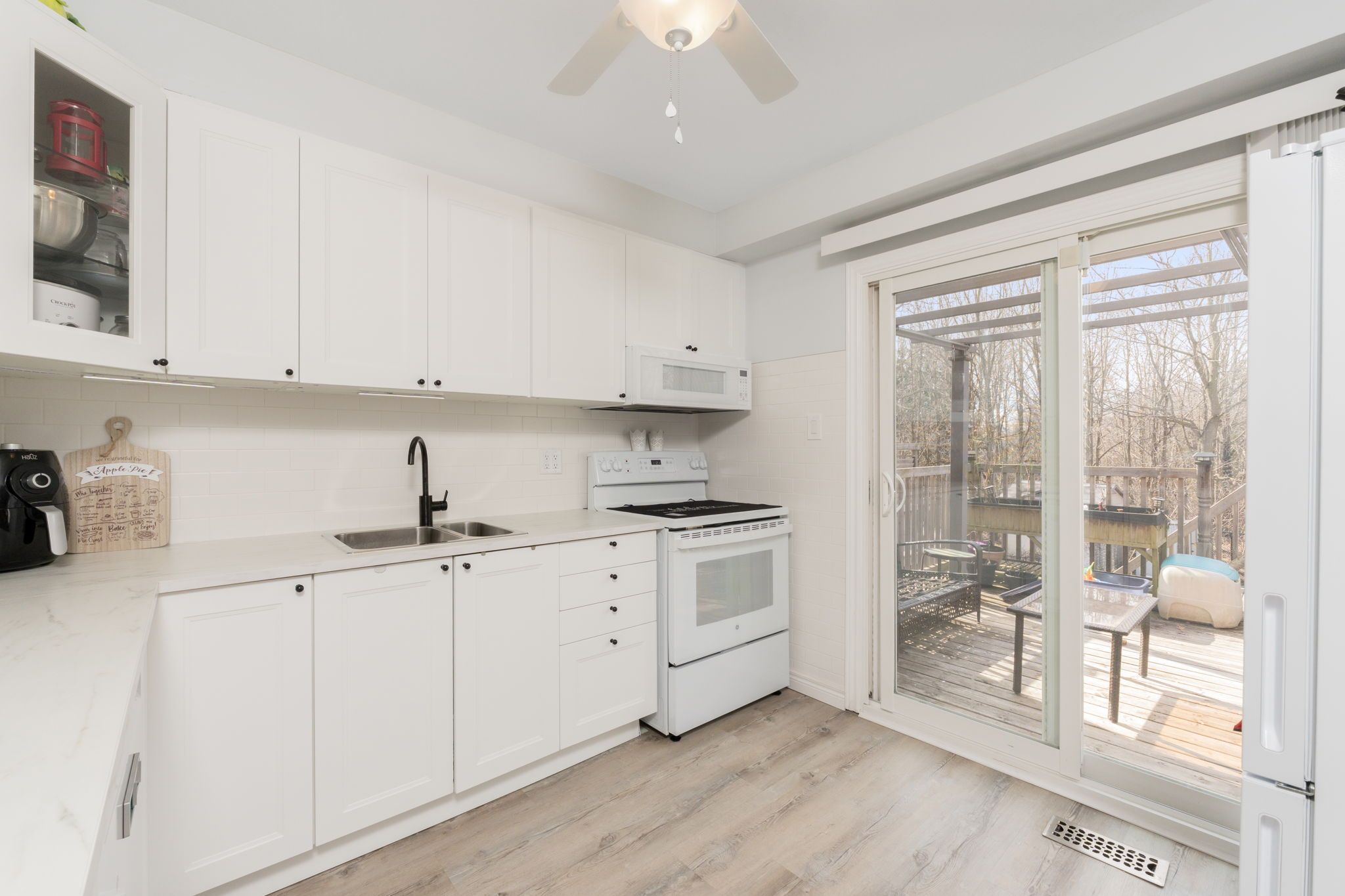 Beautifully renovated 3-bedroom home with no neighbors behind: perfect for starting out, downsizing or starting over! Nothing left to do but unpack and enjoy the compliments! Bright, new kitchen (2024) features crisp white cabinetry, modern white backsplash and lots of cupboard and counterspace. Patio doors lead to backyard deck. Great for barbequing, entertaining or morning coffee! Dining room off the kitchen has a large picture window- a good spot for meals and homework. Spacious living room with bay window overlooking street and renovated powder room off to the side. Main floor has high quality vinyl click floors- low maintenance & scratch resistant- perfect for kids/pets. Upstairs features 3 bedrooms and a beautifully renovated bathroom with white cabinetry and linen tower. The entire home was recently painted in fresh, neutral colors, newer interior doors and hardware create an upgraded, polished look. Finished basement offers lots of extra living space- perfect for kids, working from home, a home gym, man cave... Whatever you'd like! Large backyard is fenced and backs onto treed area. You'll love the privacy, quiet, and the view- especially in the summer and fall. Located in small town acton within a friendly neighborhood. Walk to multiple schools in minutes. Close to parks, shopping, nature trails, indoor public pool, skate park, and more. One car garage + parking for 2 more cars in driveway. Don't miss out on the opportunity to call this listing "home." dates: windows (2017), front door (2018), garage door (2018), main floor flooring (2020), fridge & stove (2024), dishwasher (2026), central air (2018)