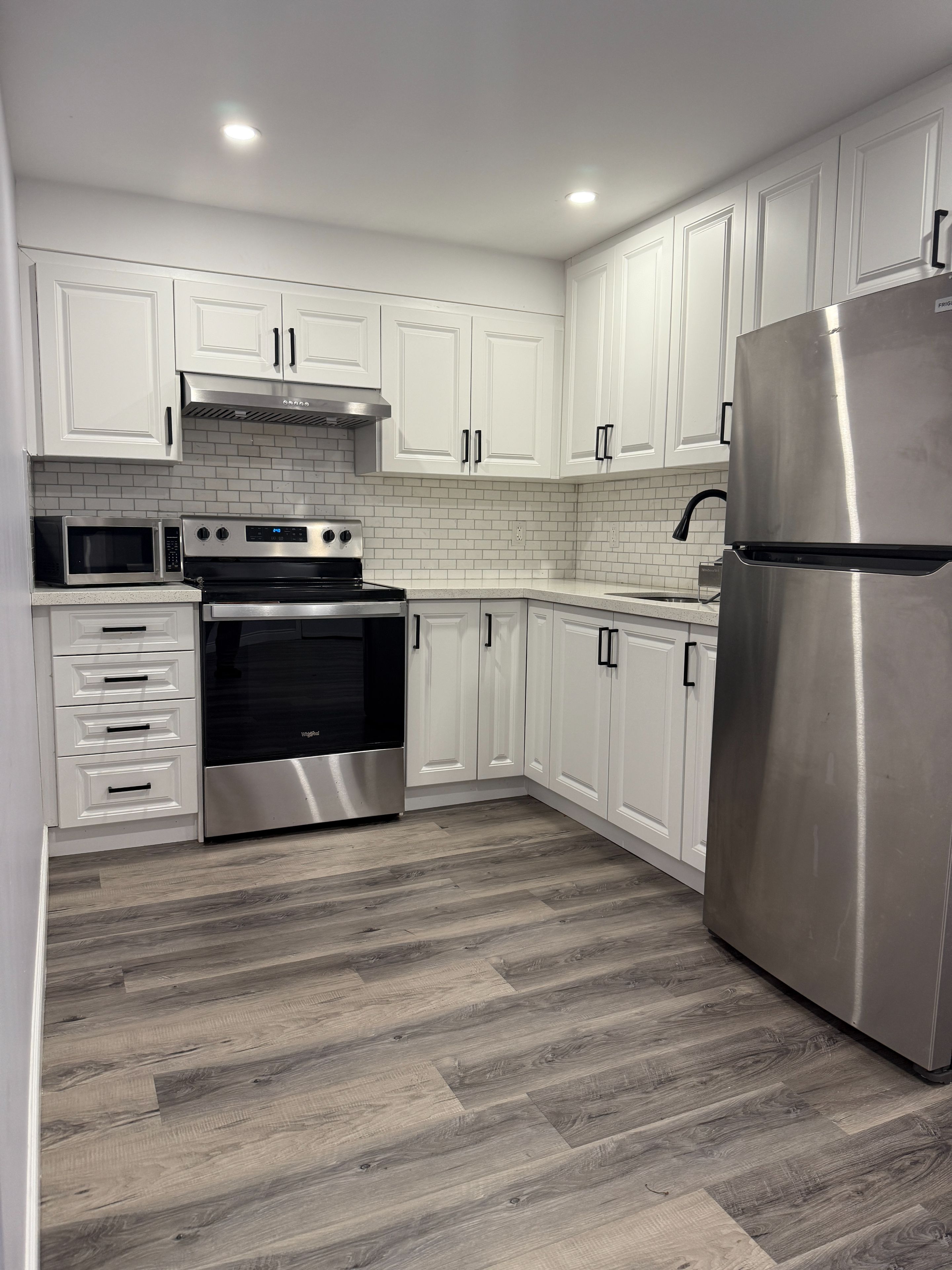 • Clean and contemporary ambiance with neutral tones and vinyl flooring.