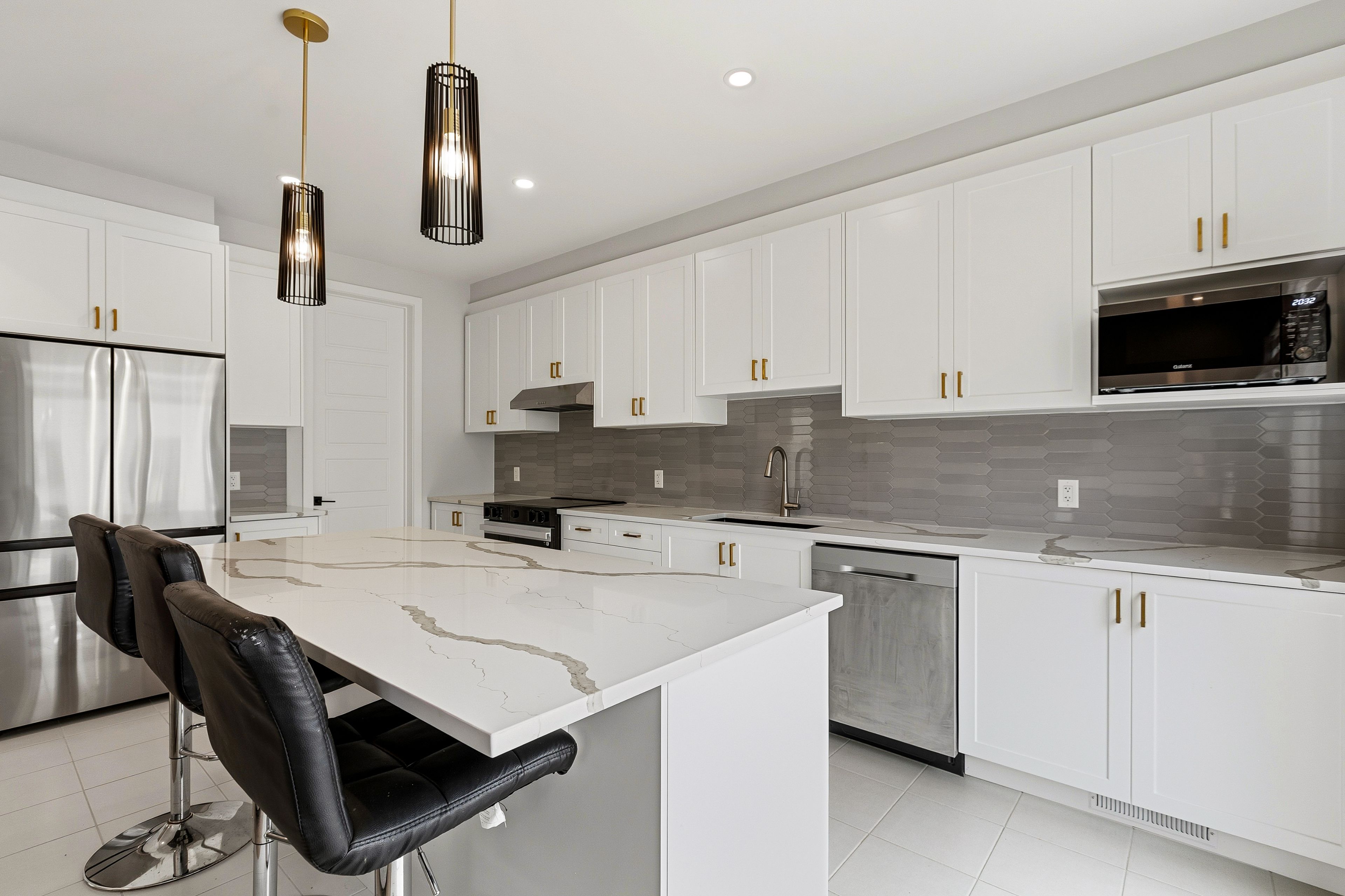 • Bright open-concept kitchen with stainless steel appliances and large island.