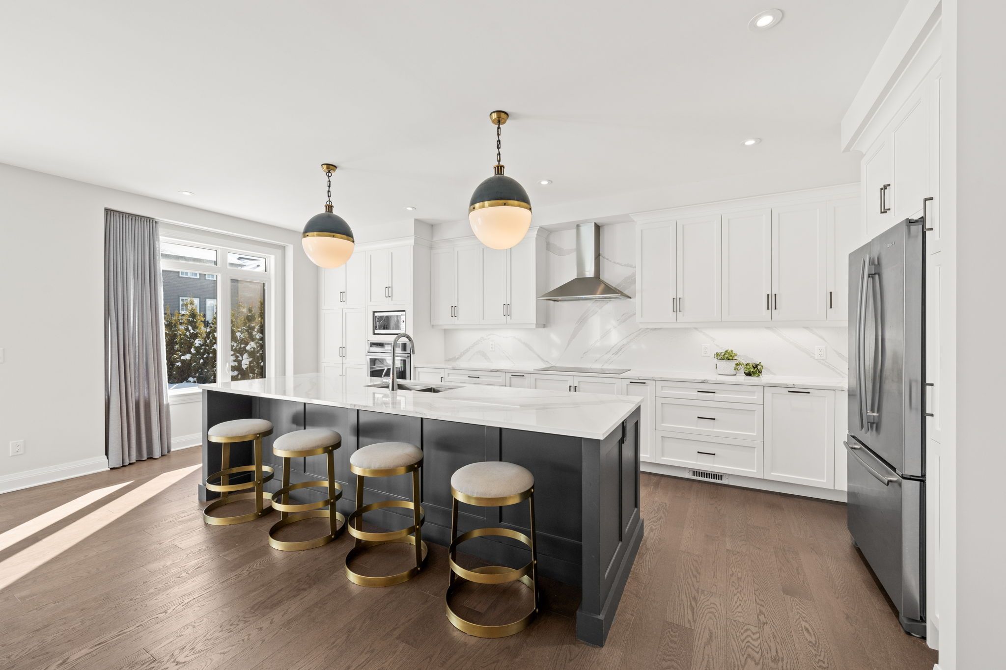 A one of one custom home in stonebridge in this fabulous barry hobin designed, uniform built residence. Modern lines and classic elegance seamlessly blend throughout 4000+sf of impressive floorplan providing welcoming spaces for both family and guests. A true open concept main floor with dedicated areas for living and dining are adjacent the impressive kitchen featuring a massive custom island! Custom millwork throughout provide next level elegance and functionality. Upstairs, wide plank hardwood floors are featured throughout all 4 bedrooms with 3 full bathrooms, laundry room and loads of natural light. A fully finished lower level with 9 foot ceilings, gas fireplace, bathroom and rec room provide the perfect teen retreat. Set on a 47 x 136 foot lot amongst some of the finest homes in stonebridge, this home features upgrades and finishes that you literally will not find in any other home in this sought after neighborhood!