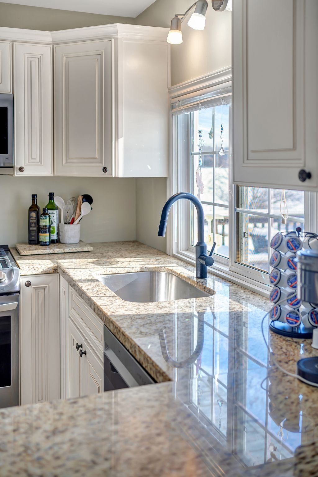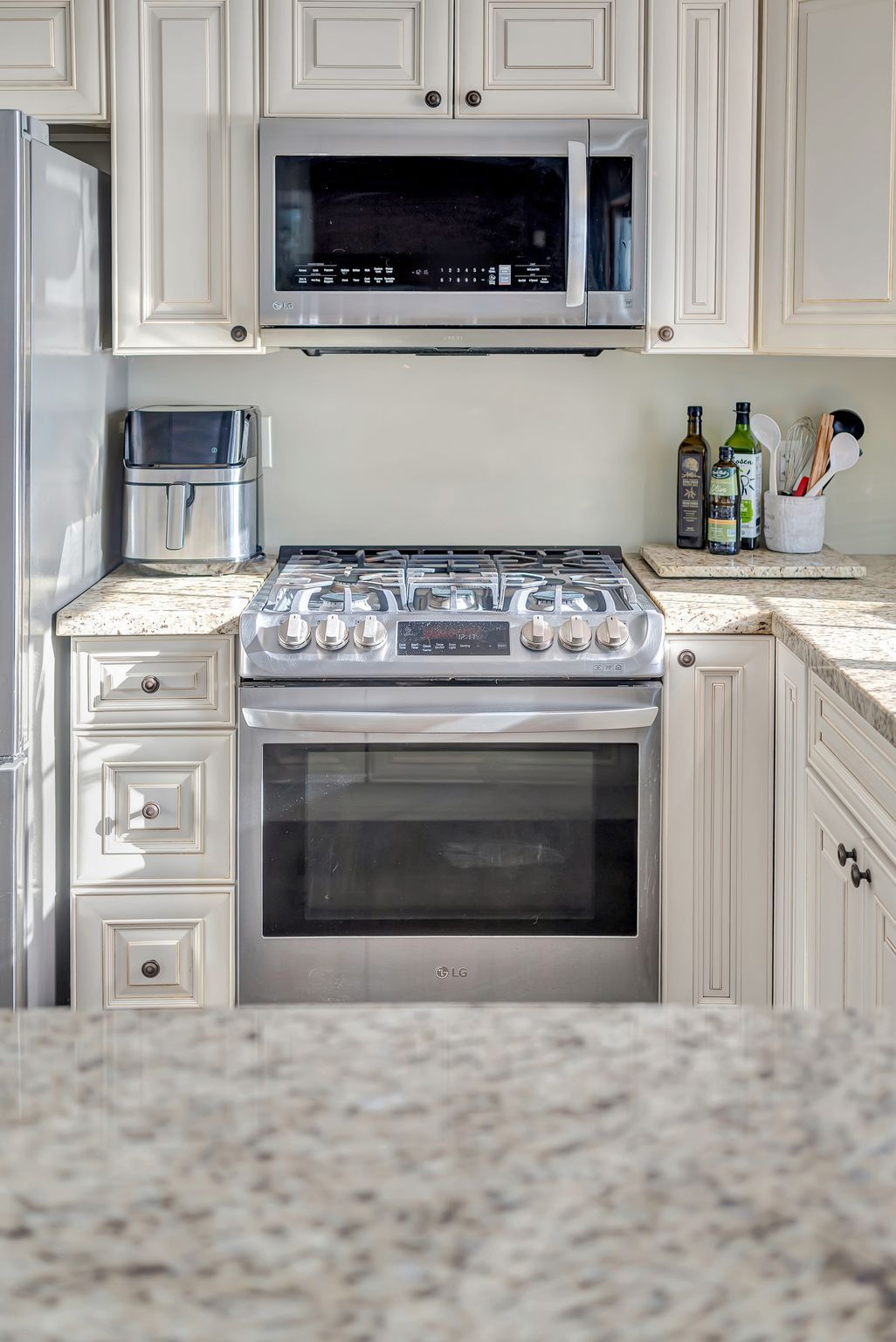 • Modern kitchen with granite countertops and stainless steel appliances.