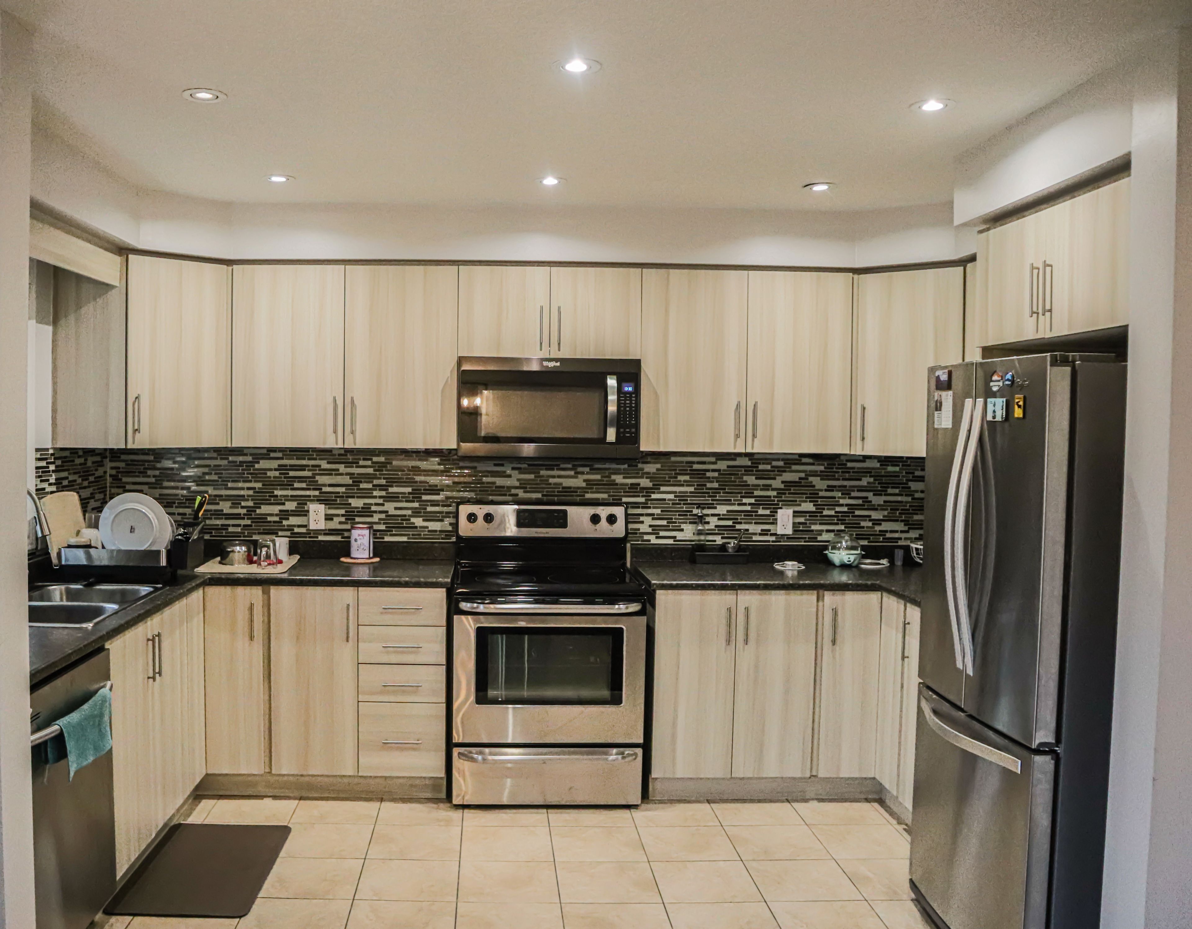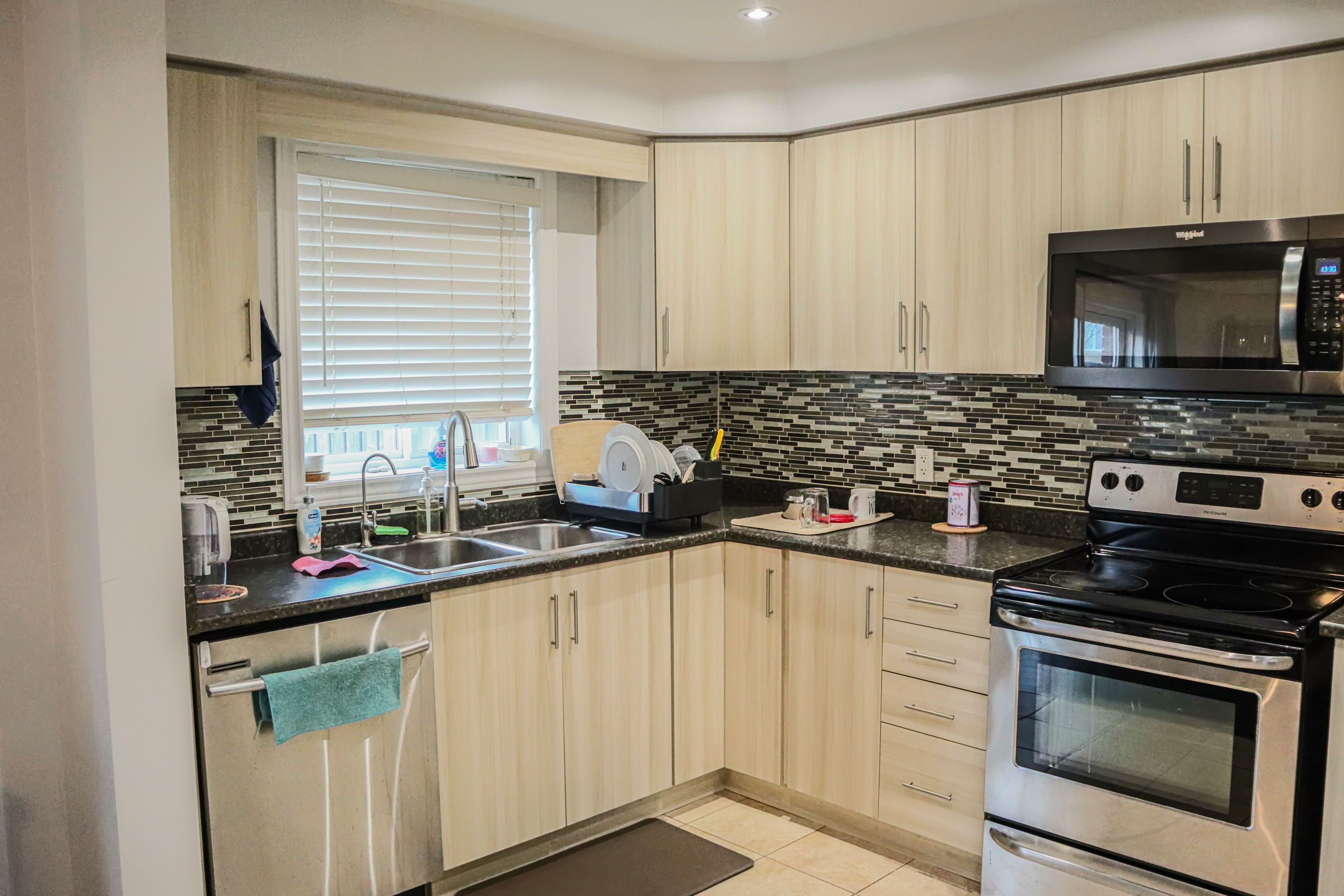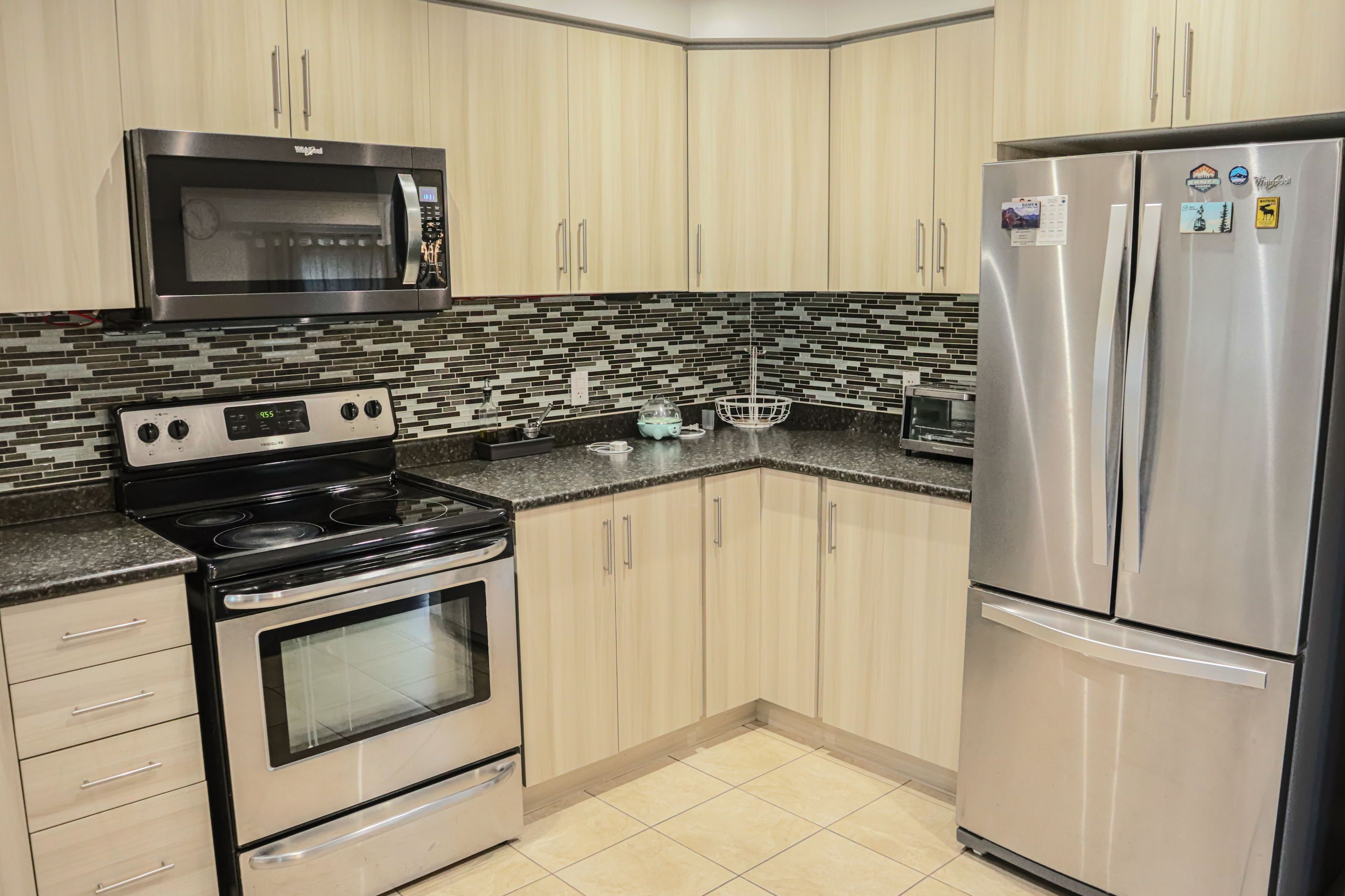 • Upgraded kitchen with stainless steel appliances and ample storage.