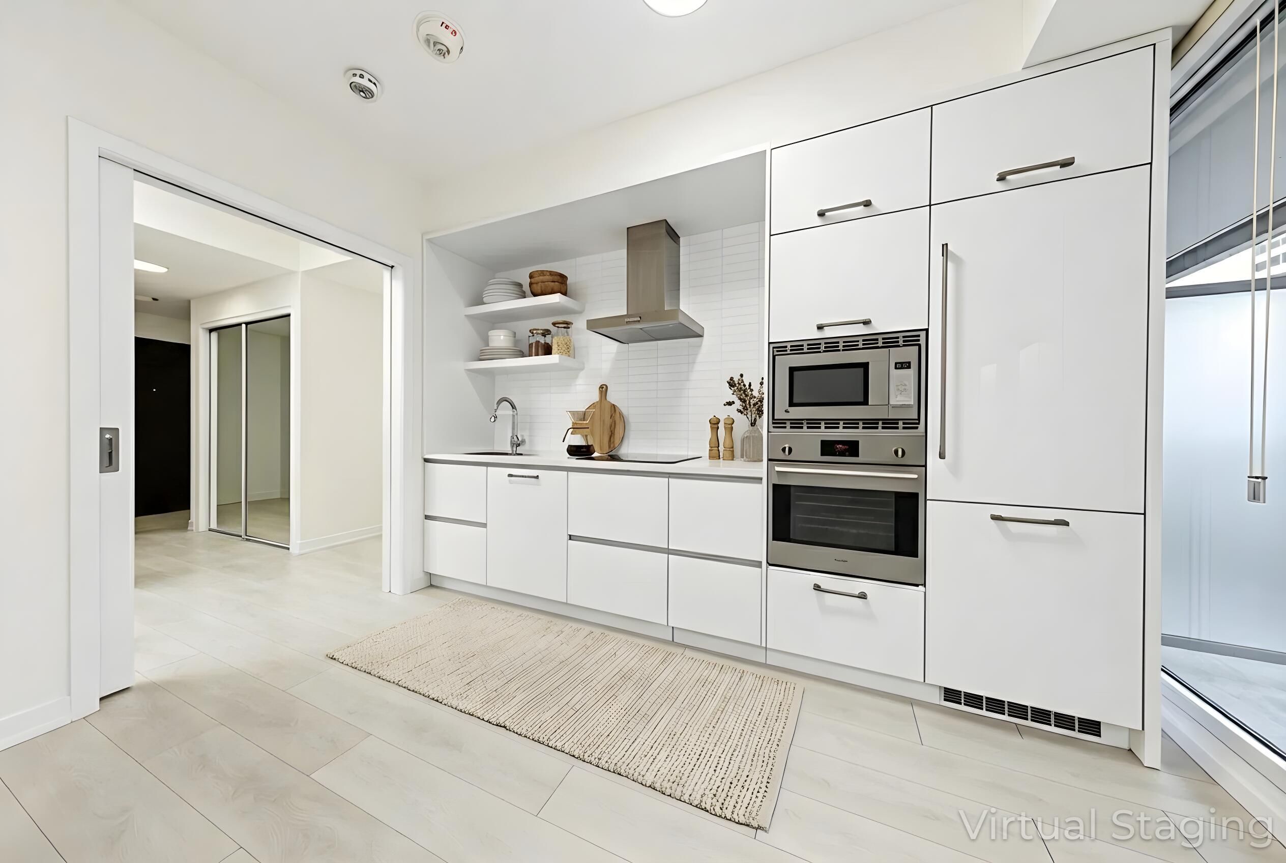 • Modern kitchen with integrated appliances and durable quartz countertops.