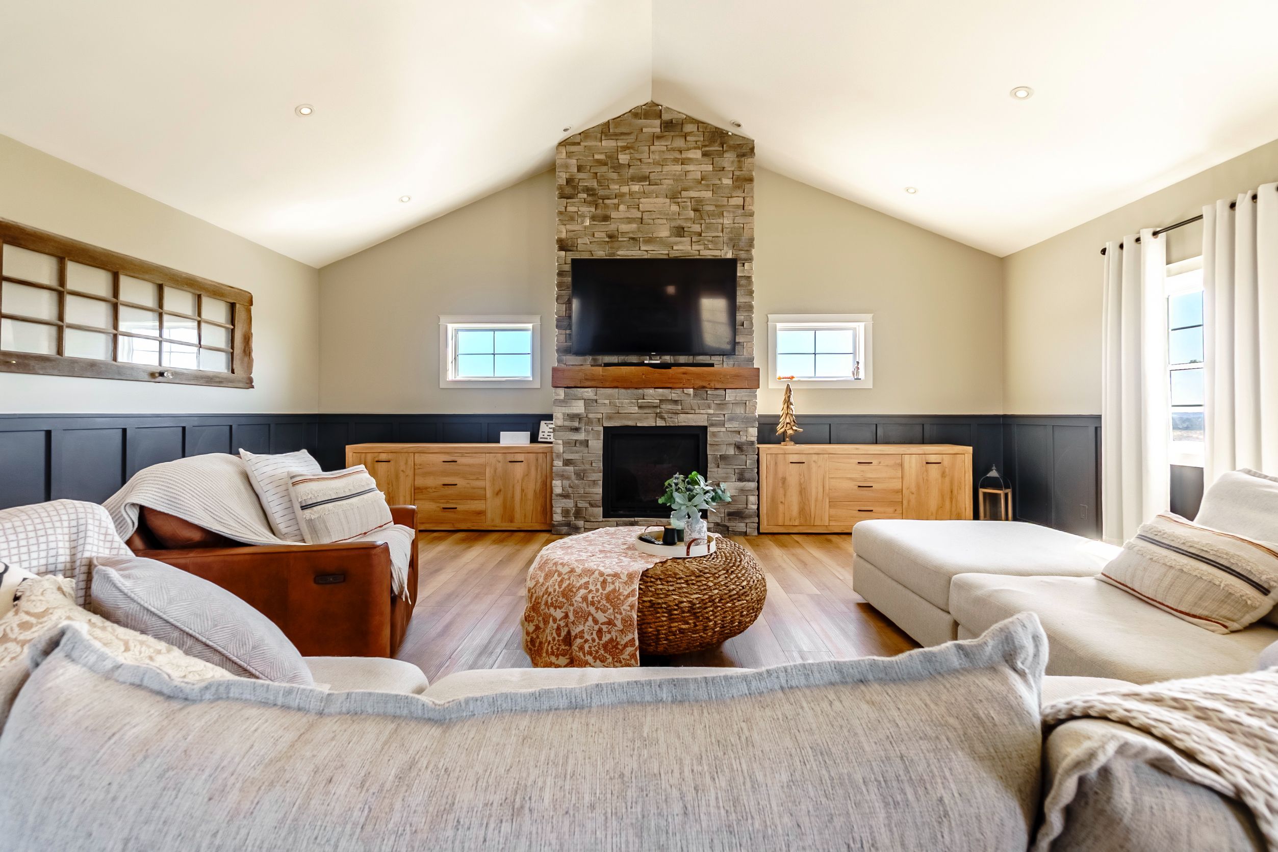• Living room features gas fireplace, soaring ceilings, and plenty of natural light.