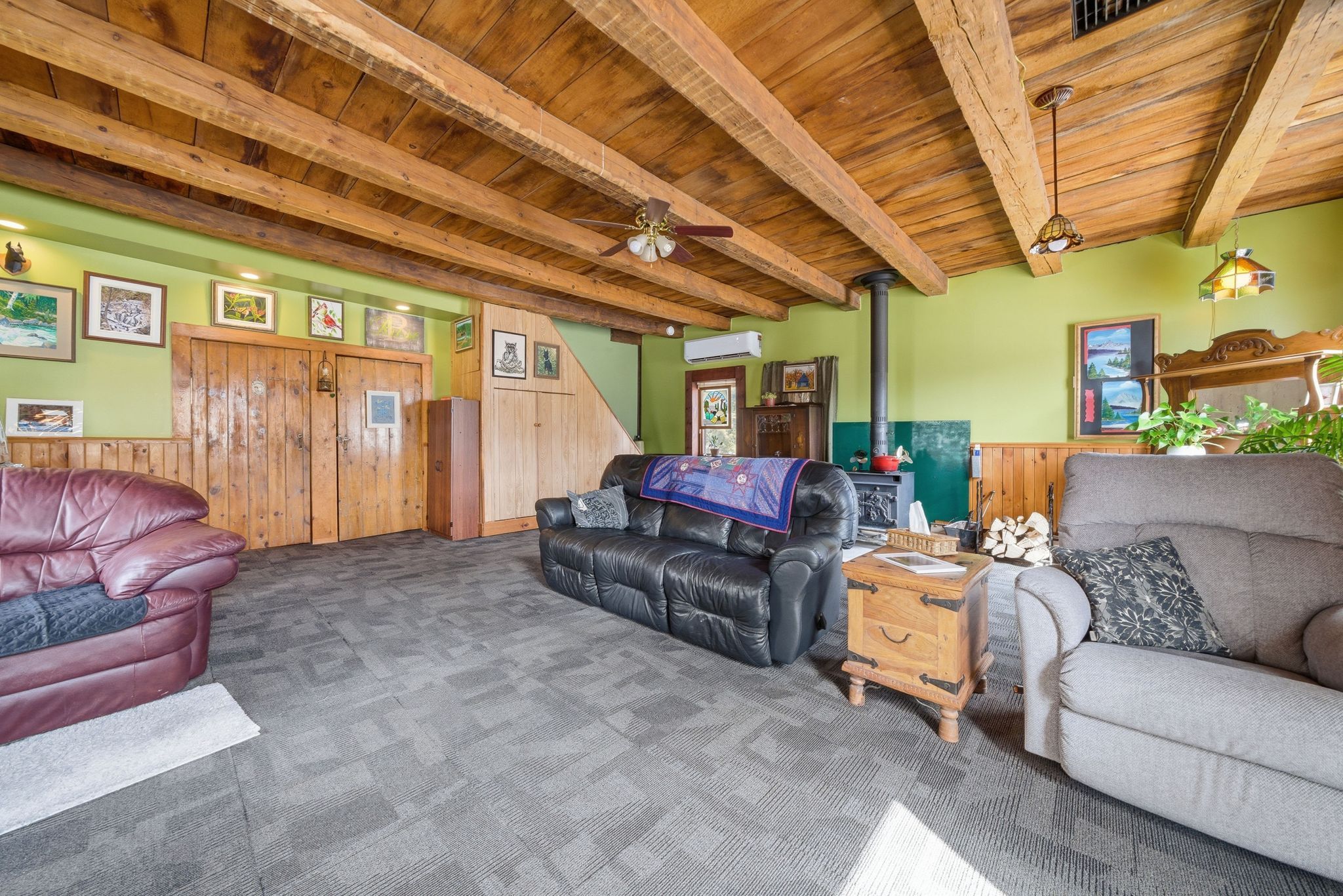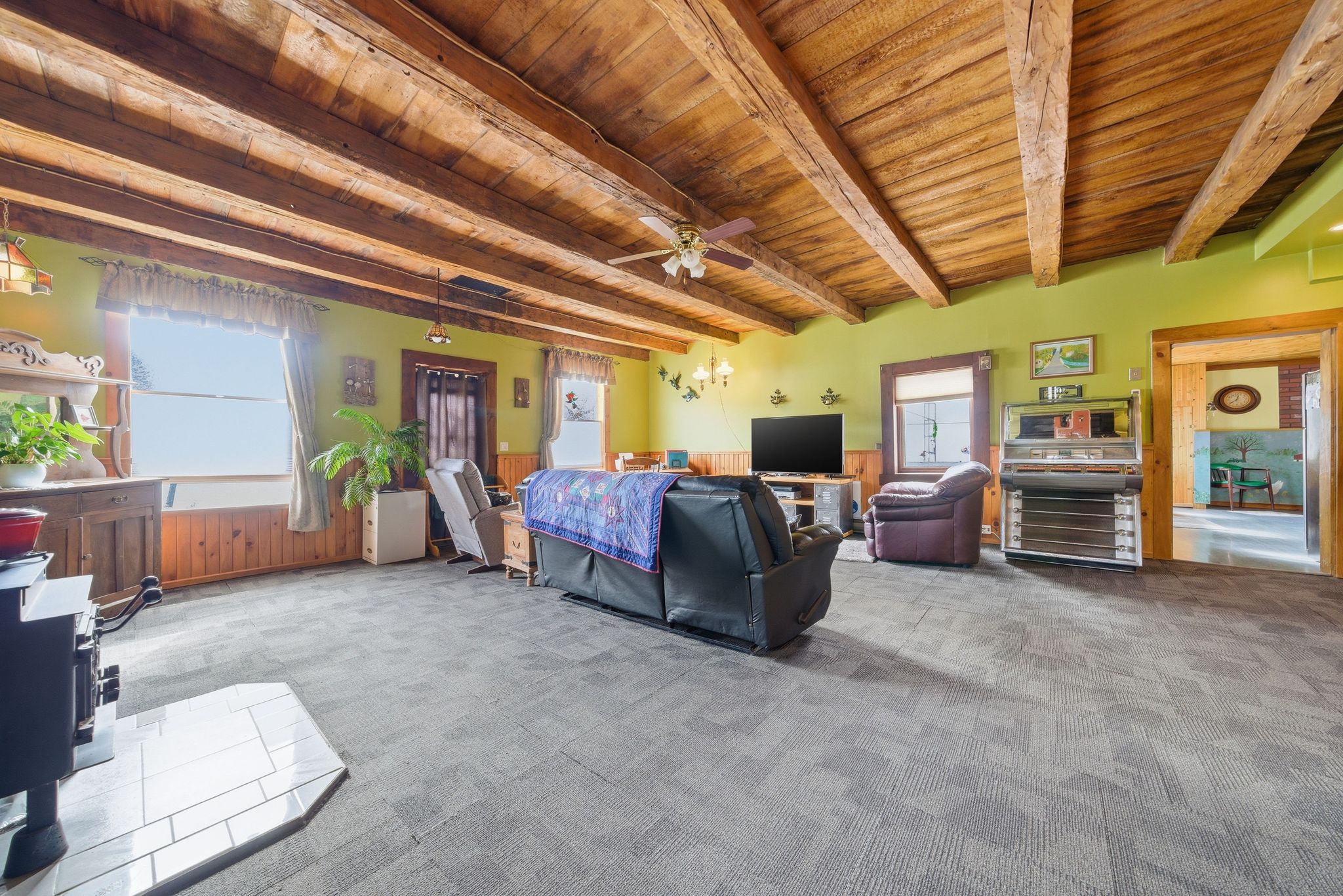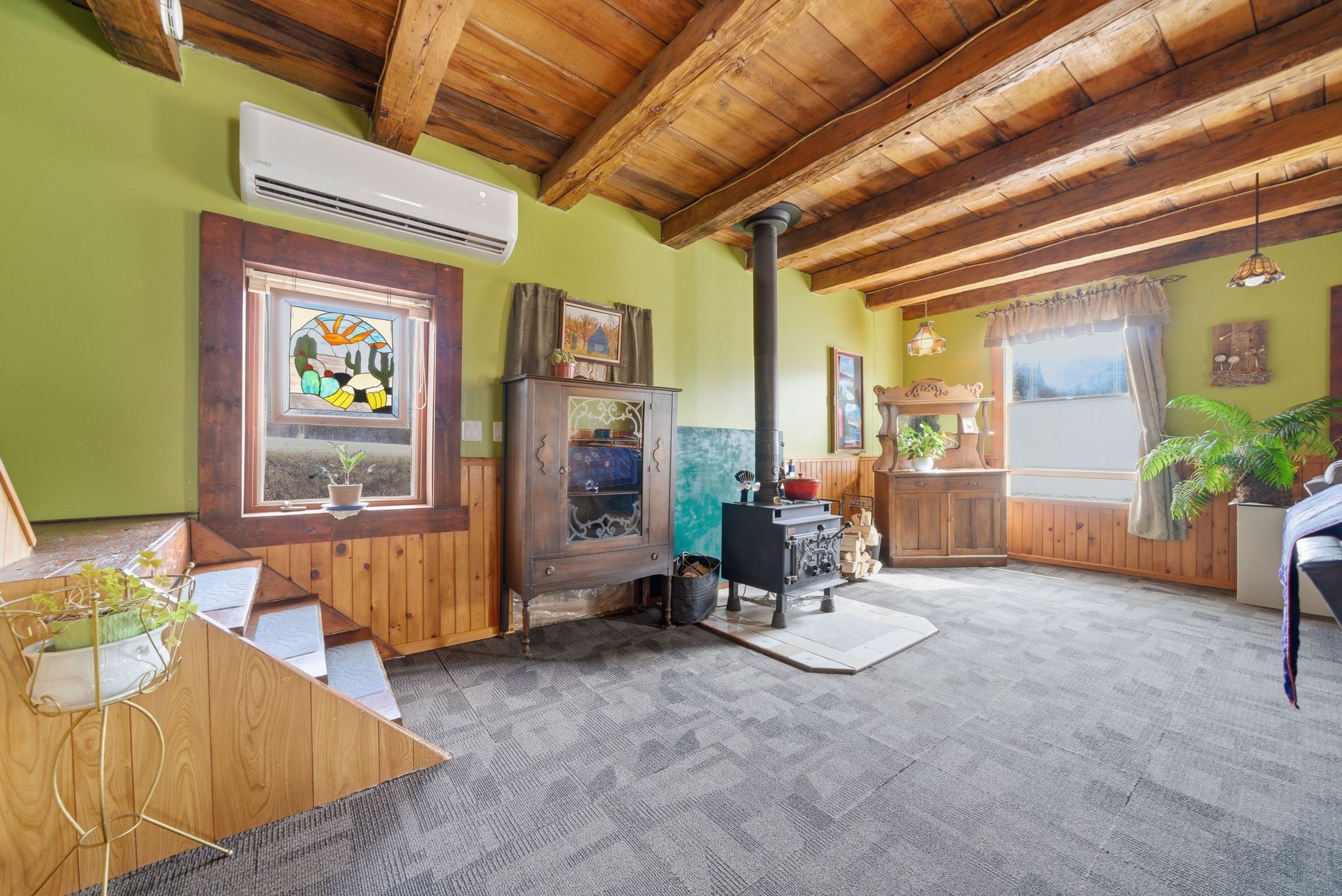 • Massive living room with original beams and cozy wood stove.