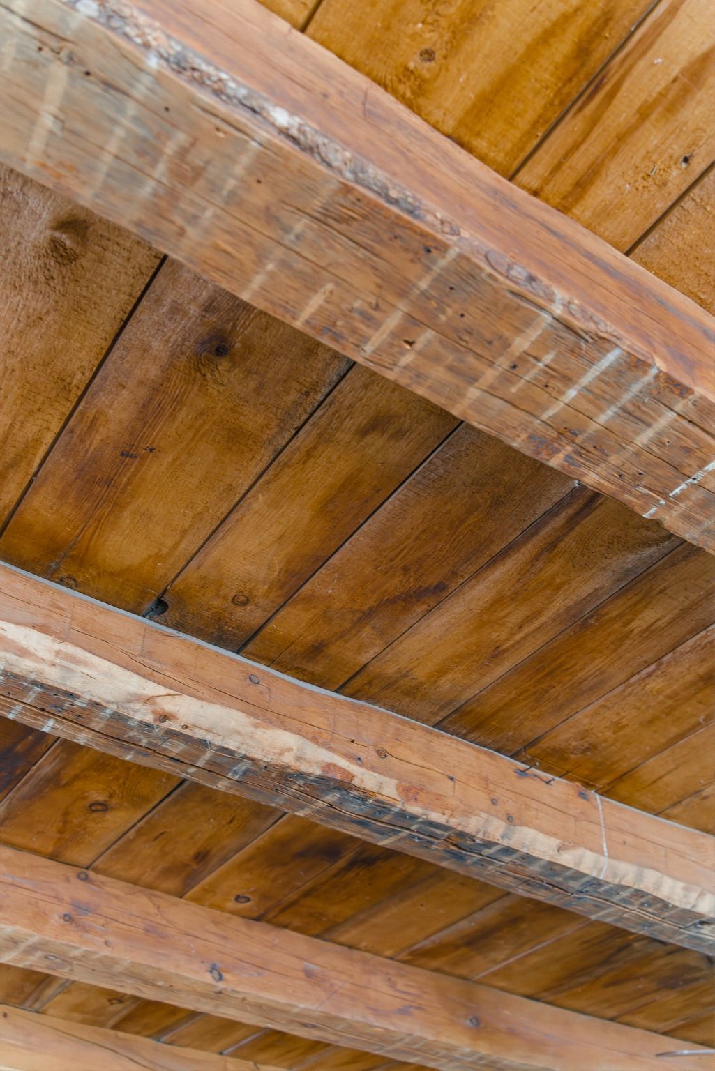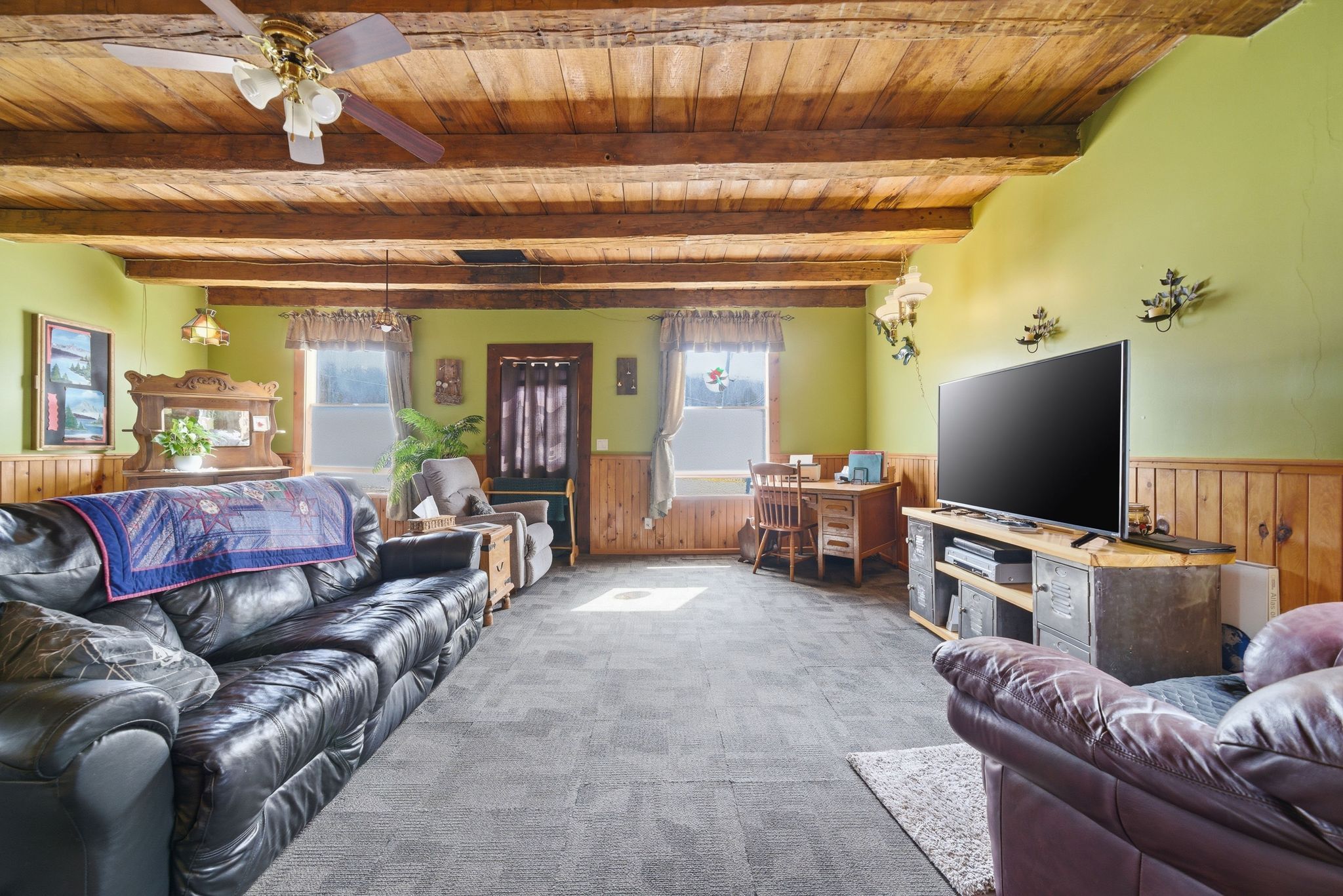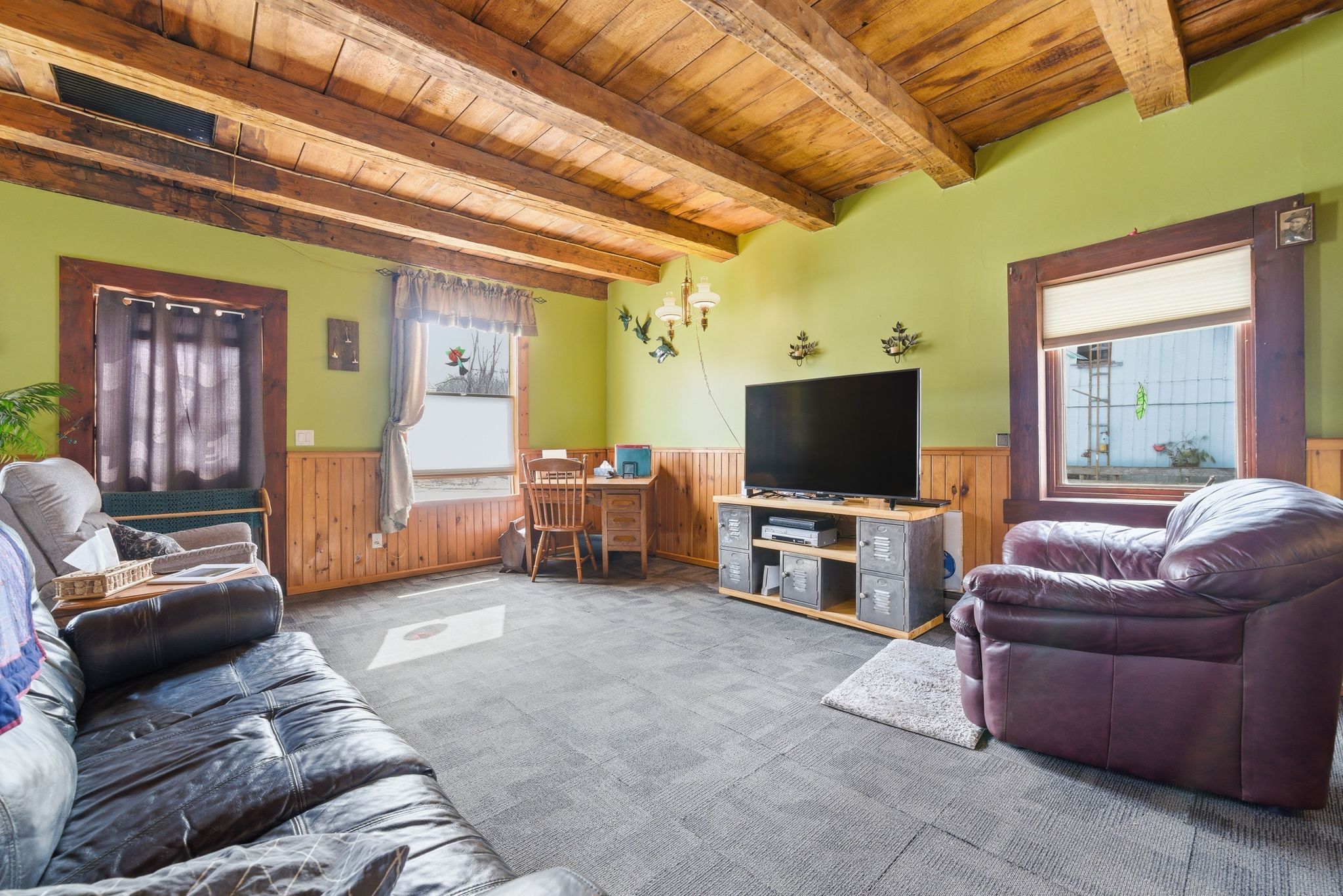 • Massive living room with original beams and cozy wood stove.