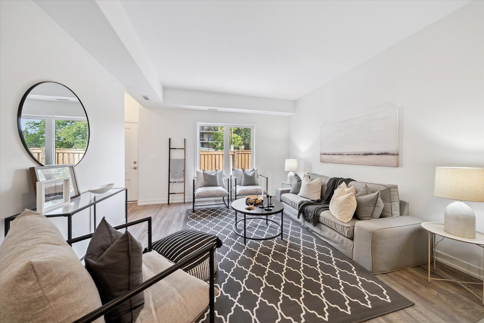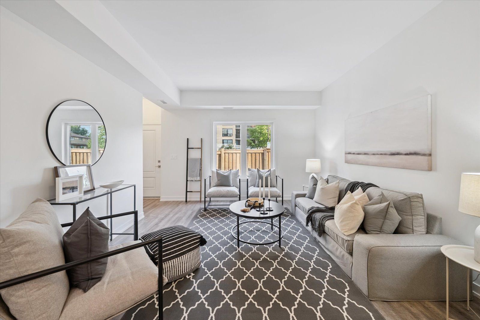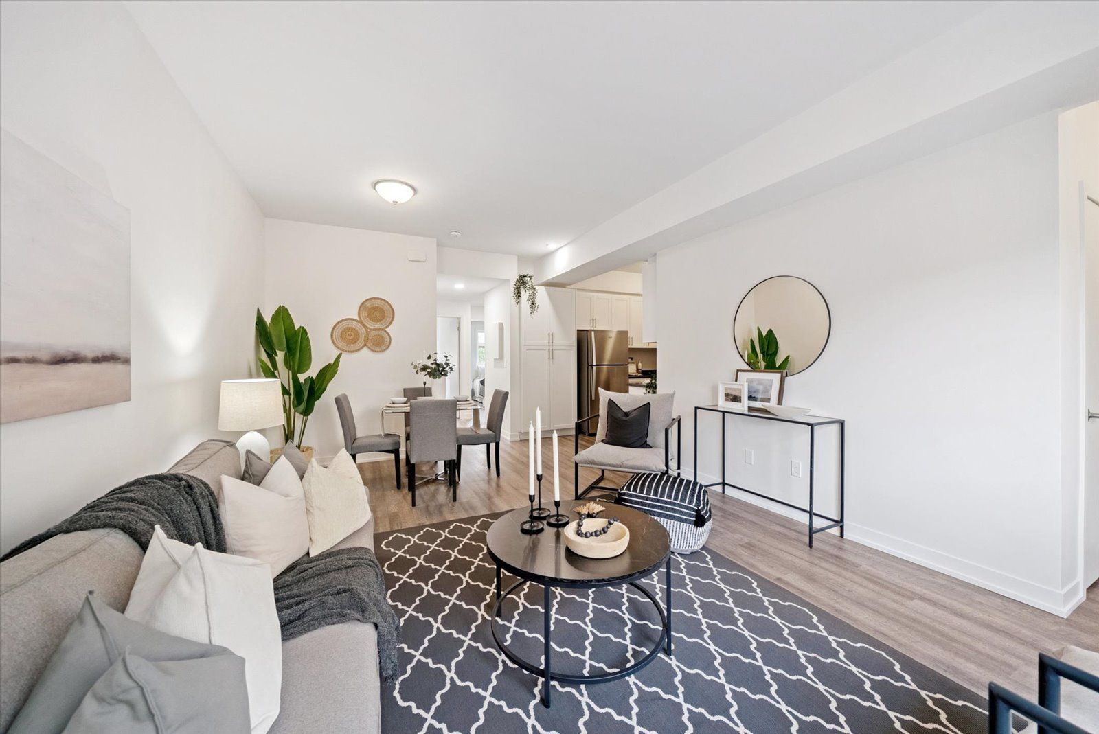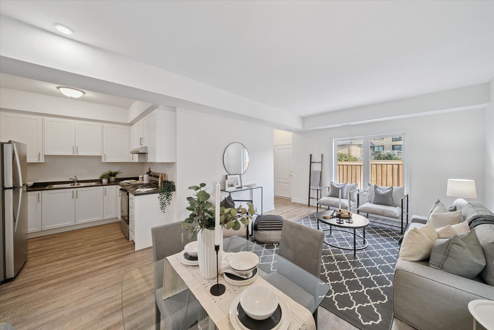 • Open-concept layout with stylish laminate flooring throughout.