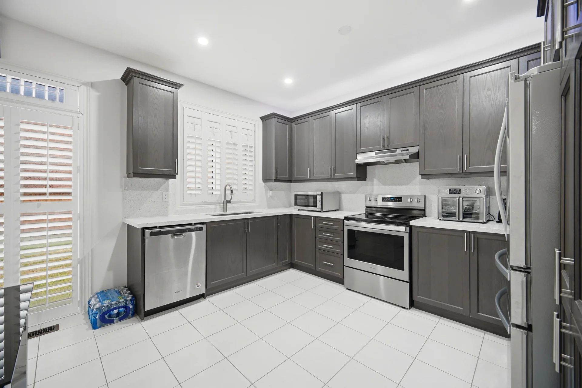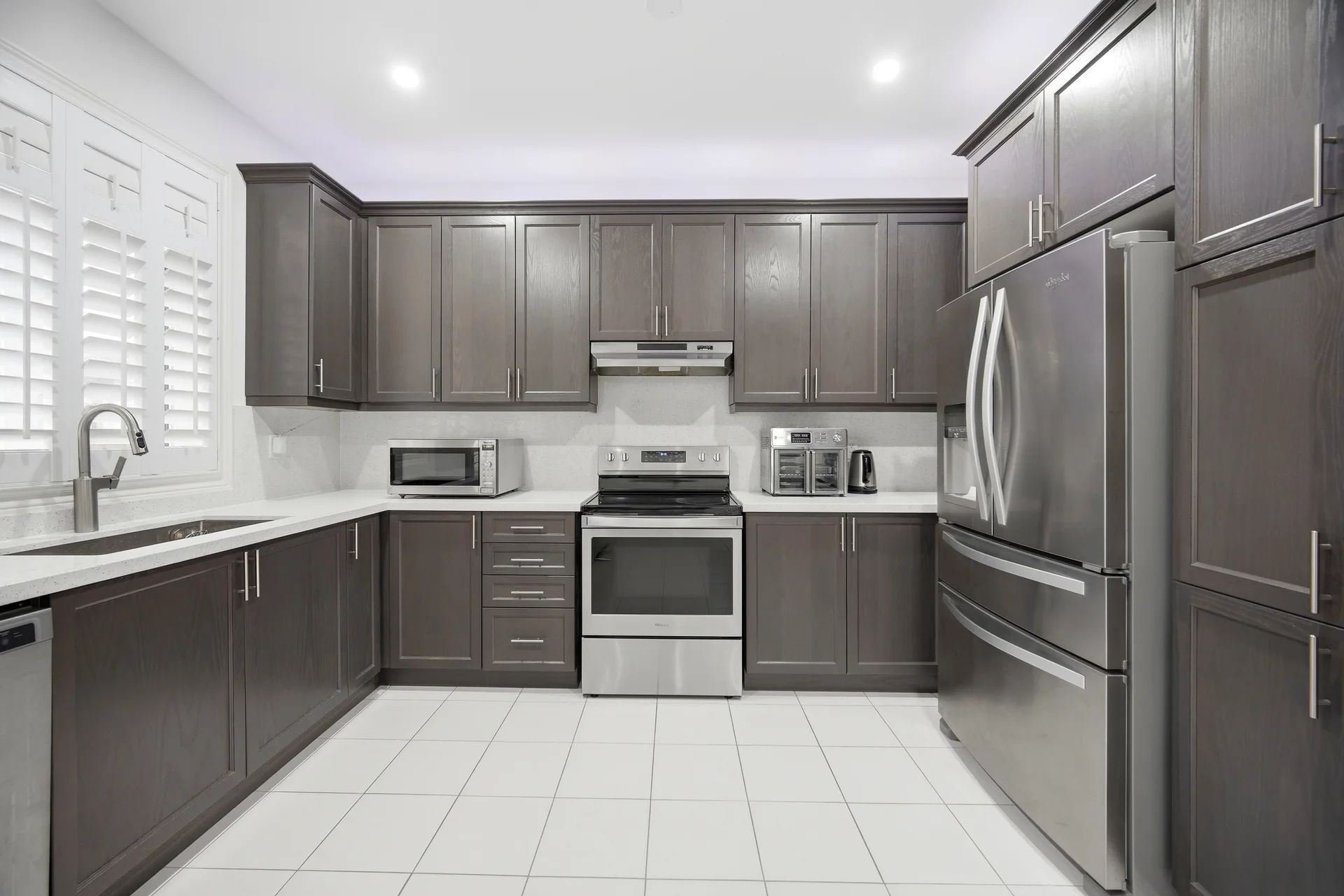 • Gourmet kitchen features quartz counters and a stylish backsplash.