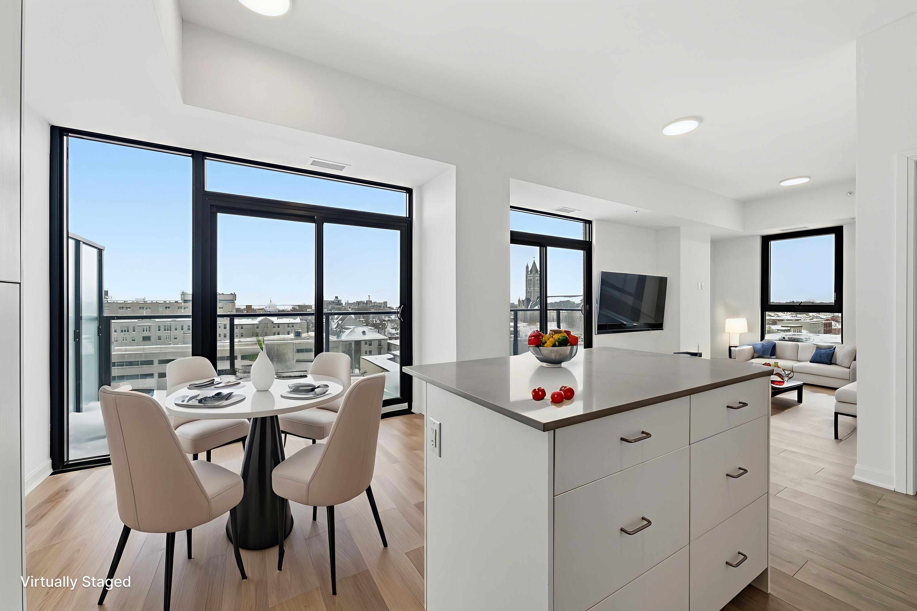 Stunning, beautifully finished top floor corner unit featuring 2 bedrooms, 2 full baths, 2 balconies, spectacular water views & a well-designed layout in the heart of downtown kingston. Welcome to the crown condominiums! This cozy ninth-floor unit is host to soaring ceilings, an open-concept designer kitchen connected to a dedicated dining & living are offering sweeping panoramic views of both downtown kingston & lake ontario. Enjoy premium amenities including in-suite laundry, a storage locker, underground parking, a rooftop terrace with bbqs, lounge areas, a party room with full kitchen, a fitness center with yoga studio & concierge service. Located quite literally in the middle of the downtown core, just minutes from queen's university, kgh/hotel dieu & a wide variety of restaurants, shops & amenities, this location presents unbeatable convenience. Whether you're a student, professional, or looking for an upscale urban lifestyle, this condo is a perfect place to call home.