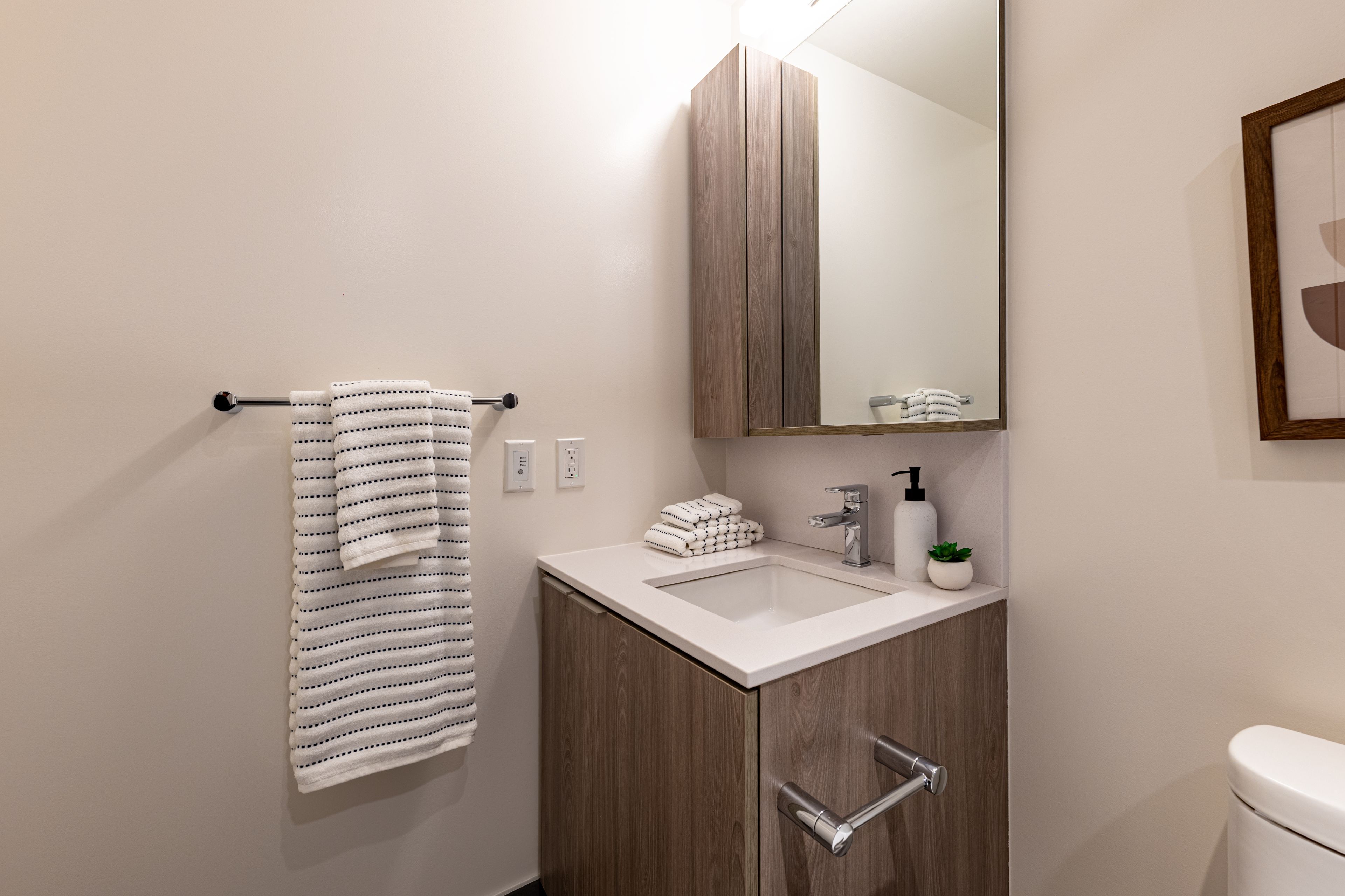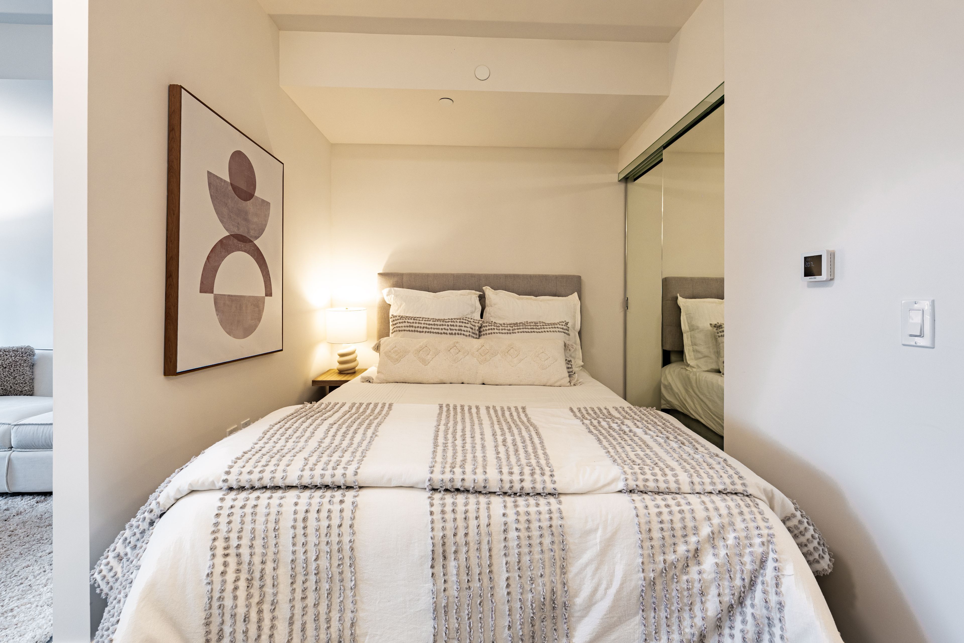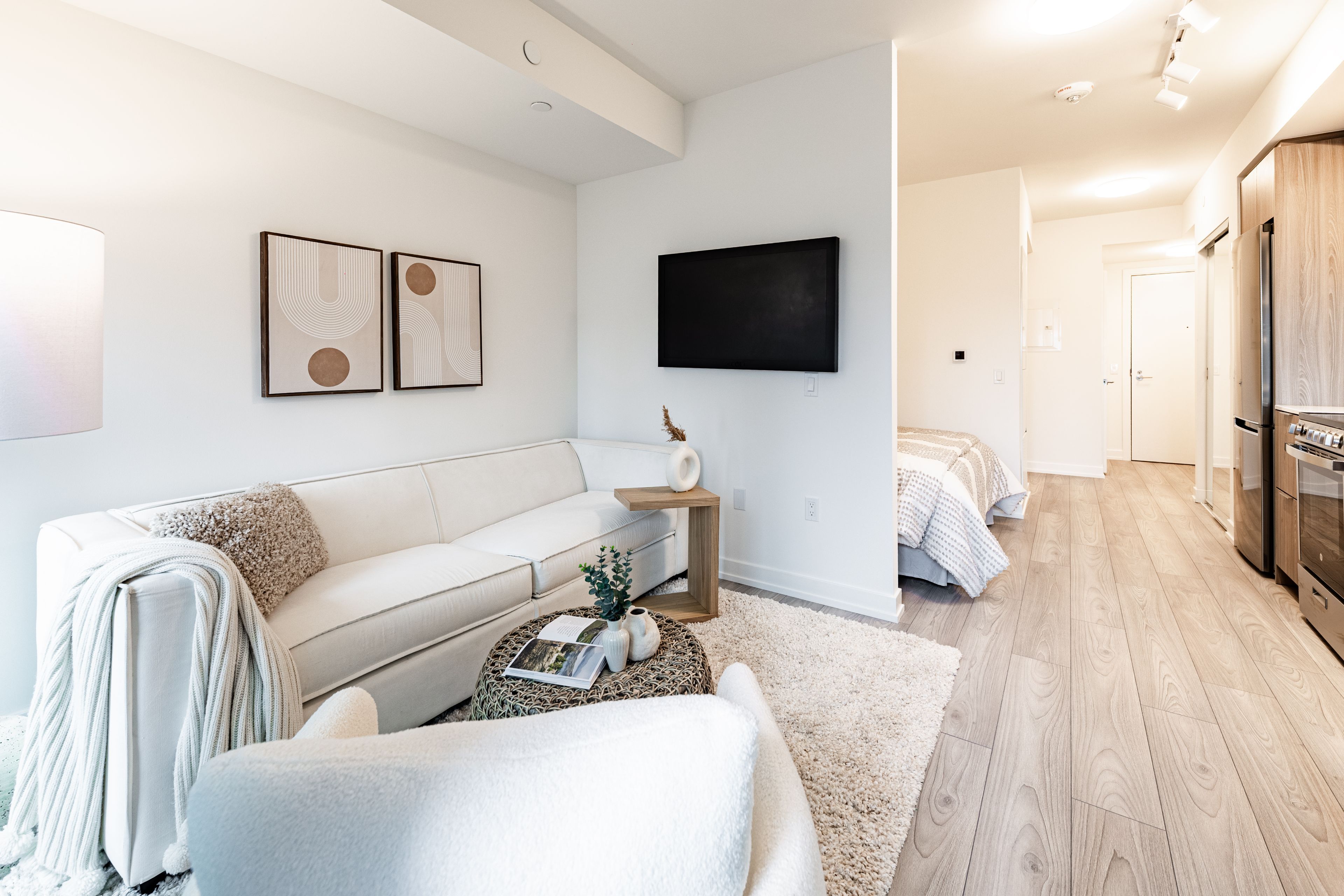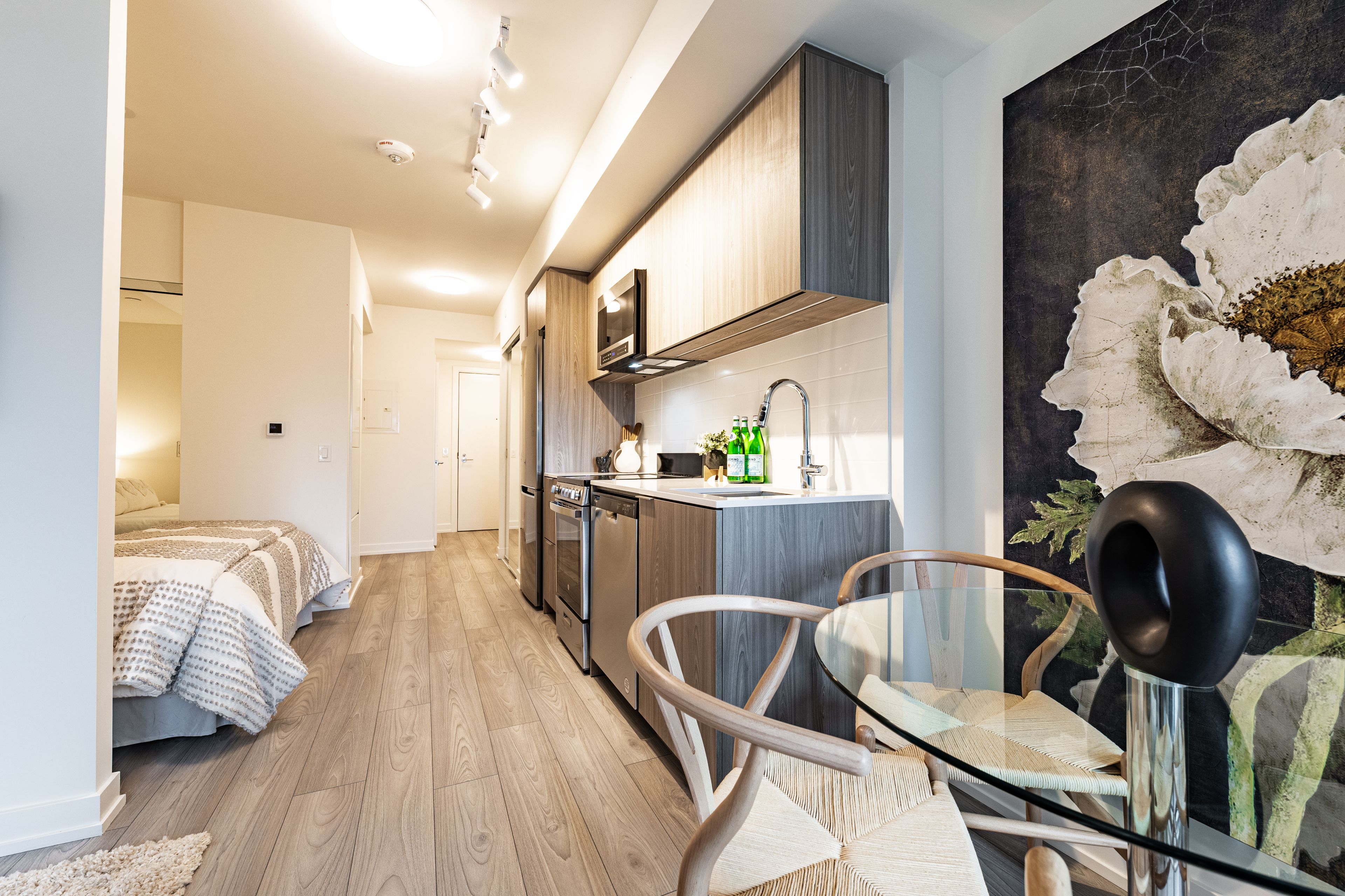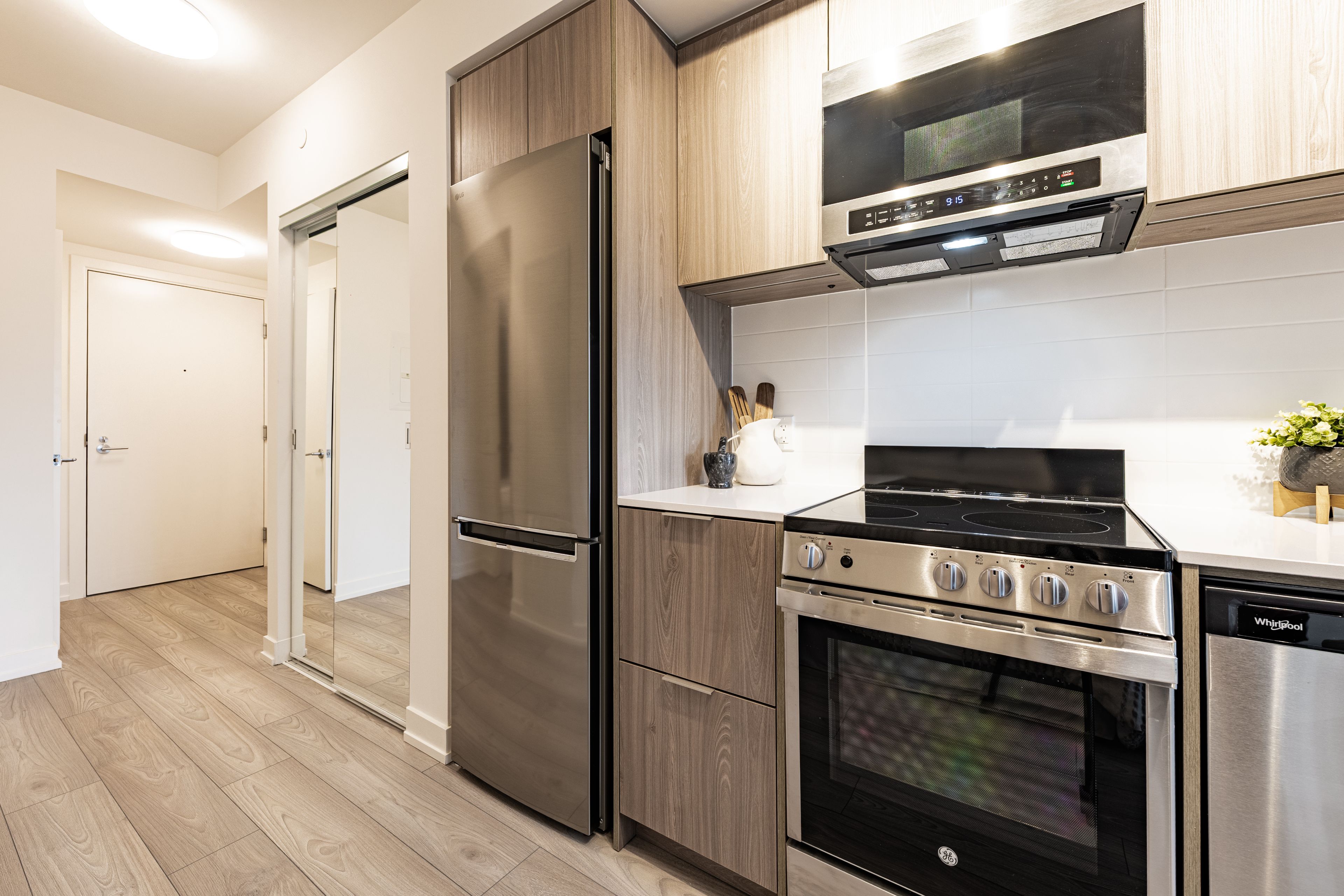 • Sophisticated amenities include outdoor terraces, fitness room, and co-working lounge.