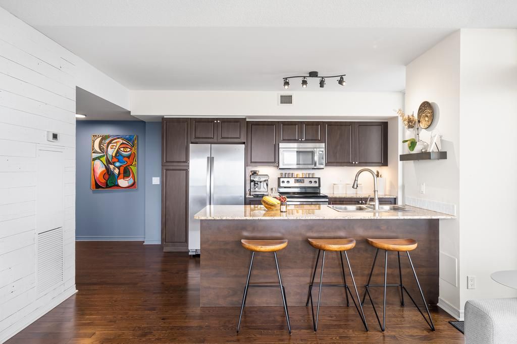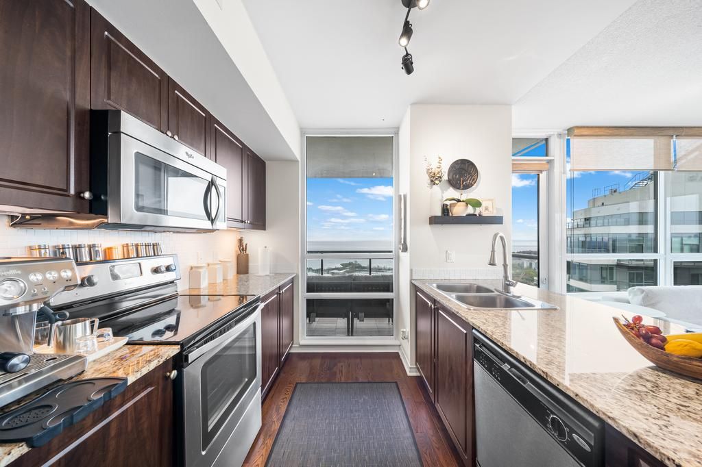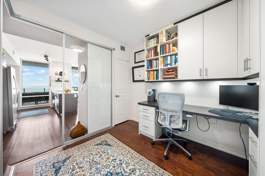Perched on the 38th floor, this stunning corner suite offers a front-row seat to sweeping, unobstructed lake and city views. Bright, open, and effortlessly elegant, the space is framed by two private balconies, including a serene walk-out from the primary bedroom. The second bedroom has been thoughtfully transformed with a custom-built office and a sleek retractable double murphy bed (over $11,000), blending design and functionality in a way that actually makes sense. Refrigerator (2022)washer & dryer (2022)laminate flooring in both bedrooms (2021)warm hardwood floors run through the main living space, leading into a modern kitchen finished with stainless steel appliances and granite countertops. Residents enjoy access to premium amenities including a fully equipped gym, indoor pool, guest suites, and generous visitor parking. Ideally located just minutes from downtown with easy access to mimico go station, this home offers that rare balance of calm waterfront living and city convenience. Current aaa tenant willing to stay or vacate.