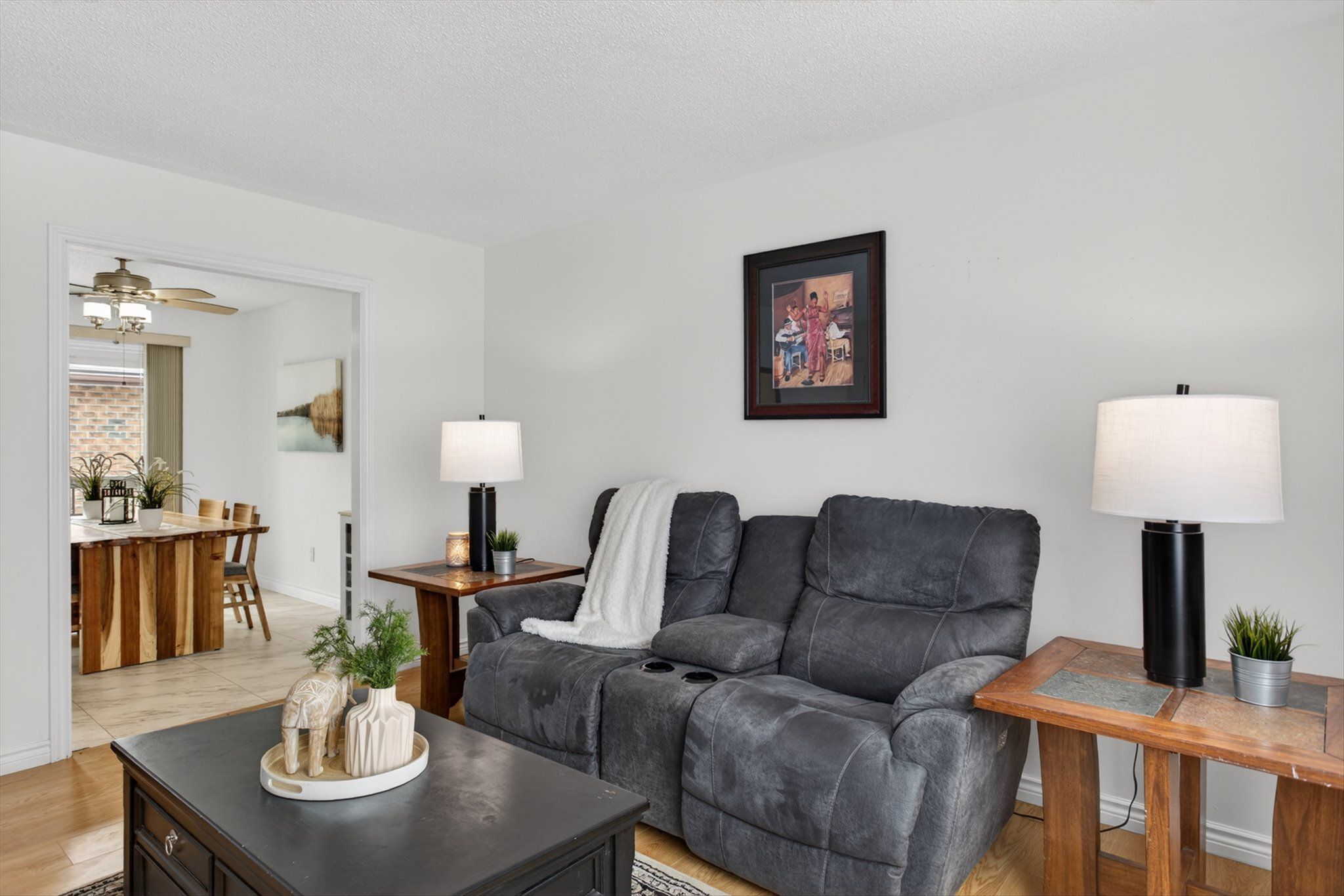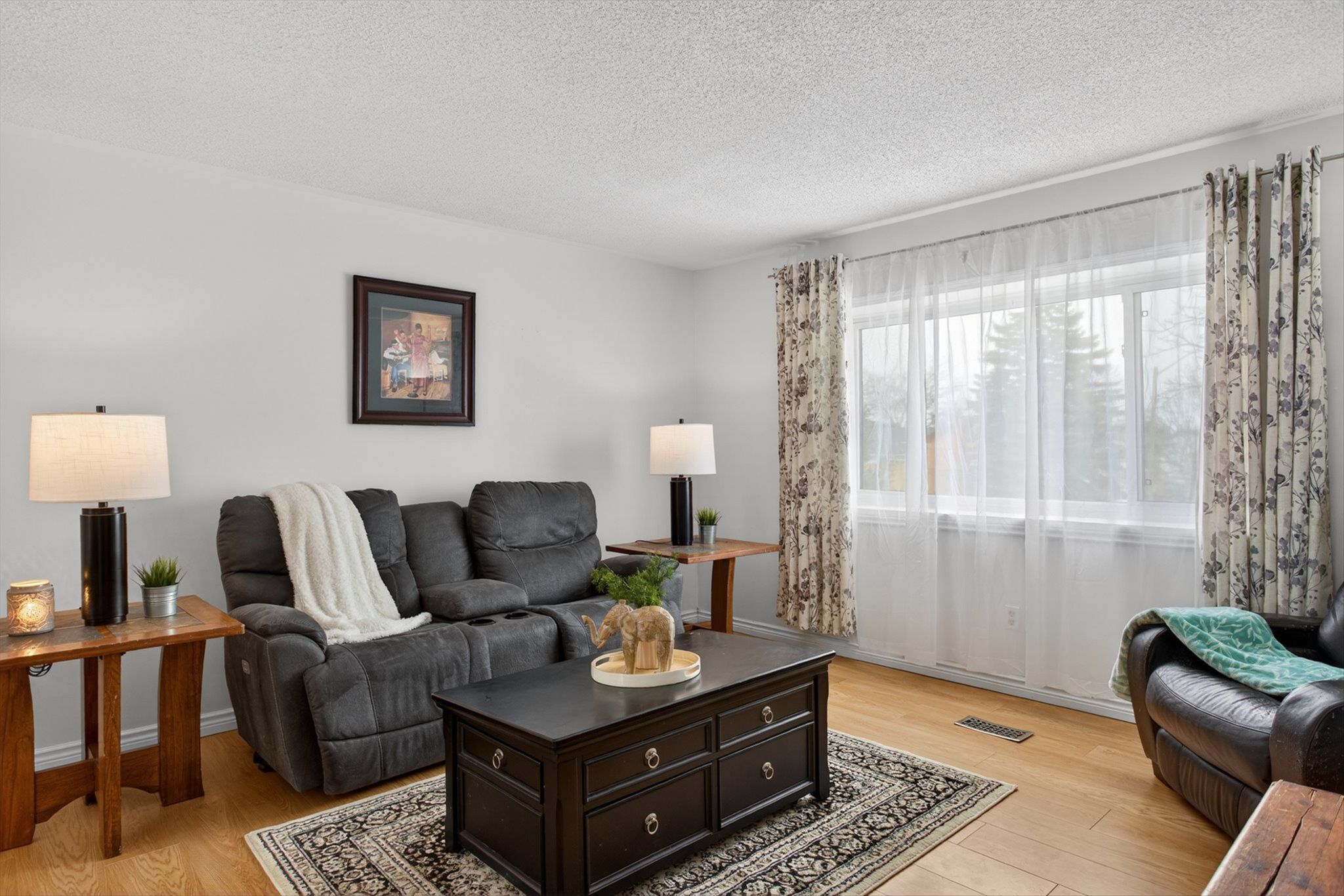 • Bright living room with new vinyl plank flooring and large windows.