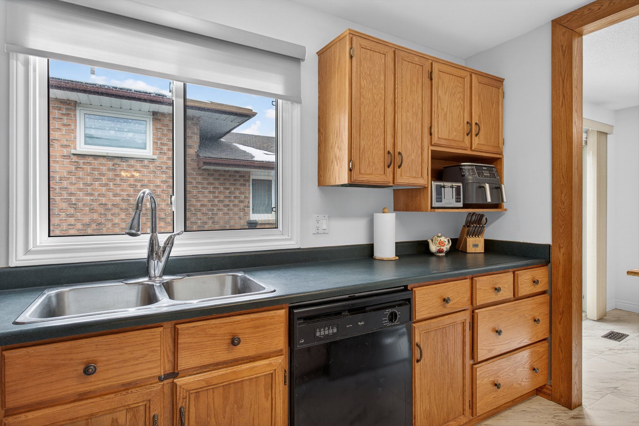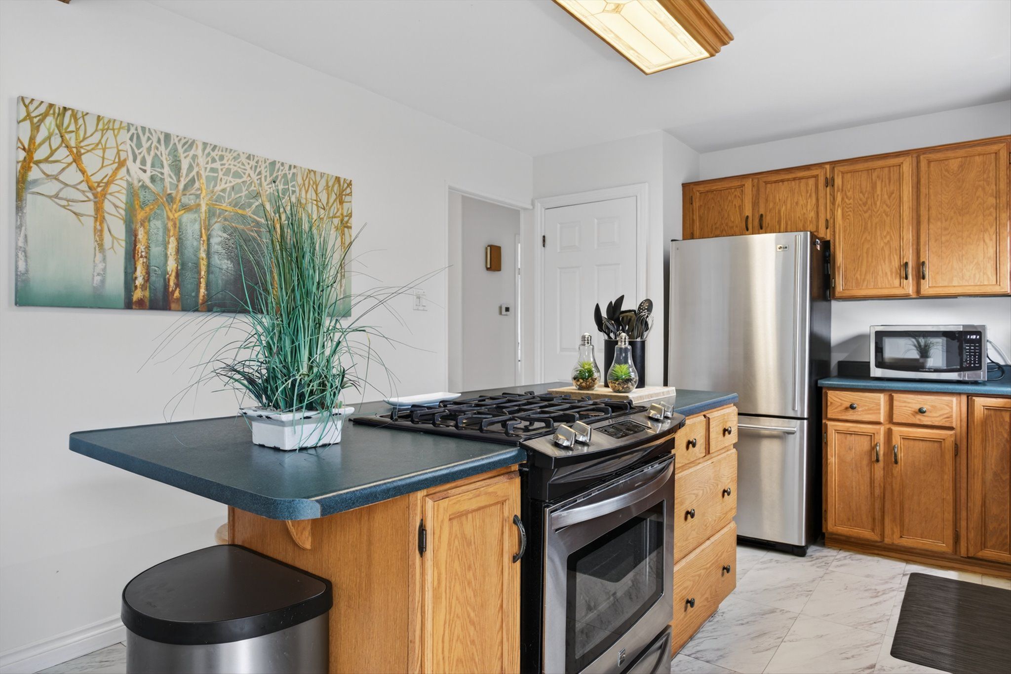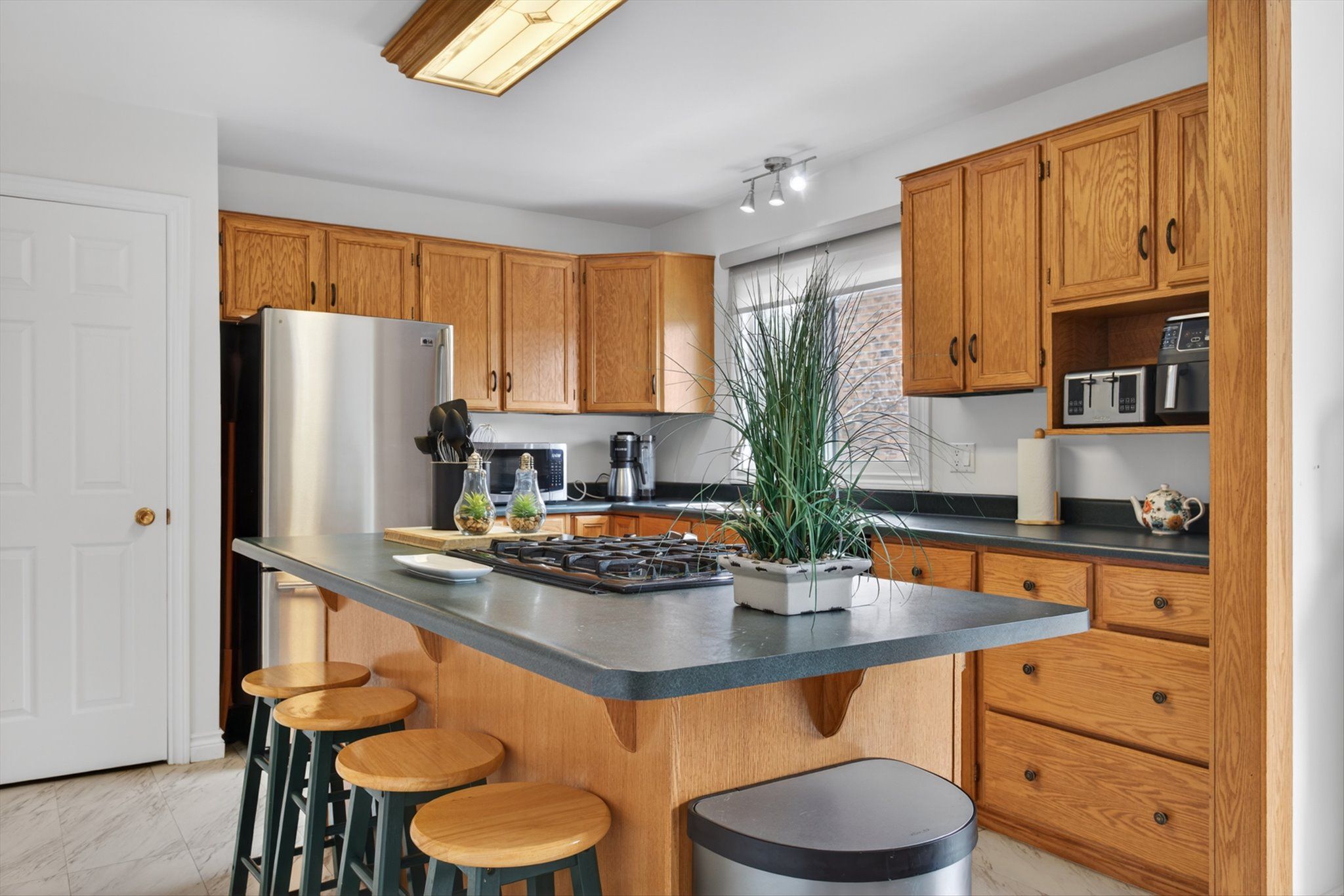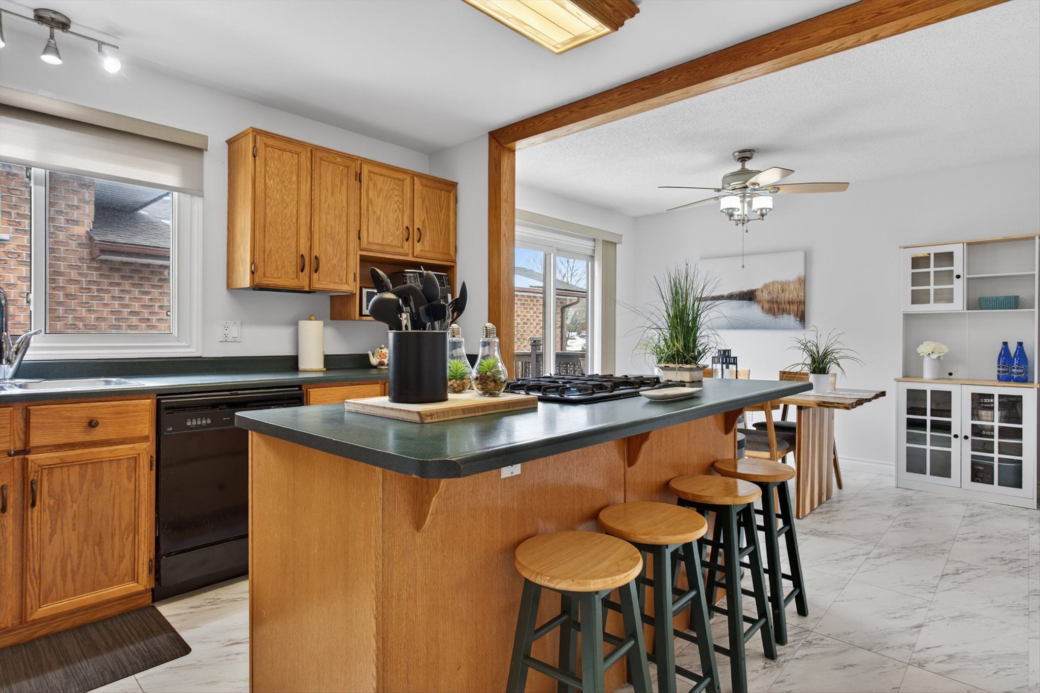 • Functional kitchen with ample cabinets, island seating, and pantry space.