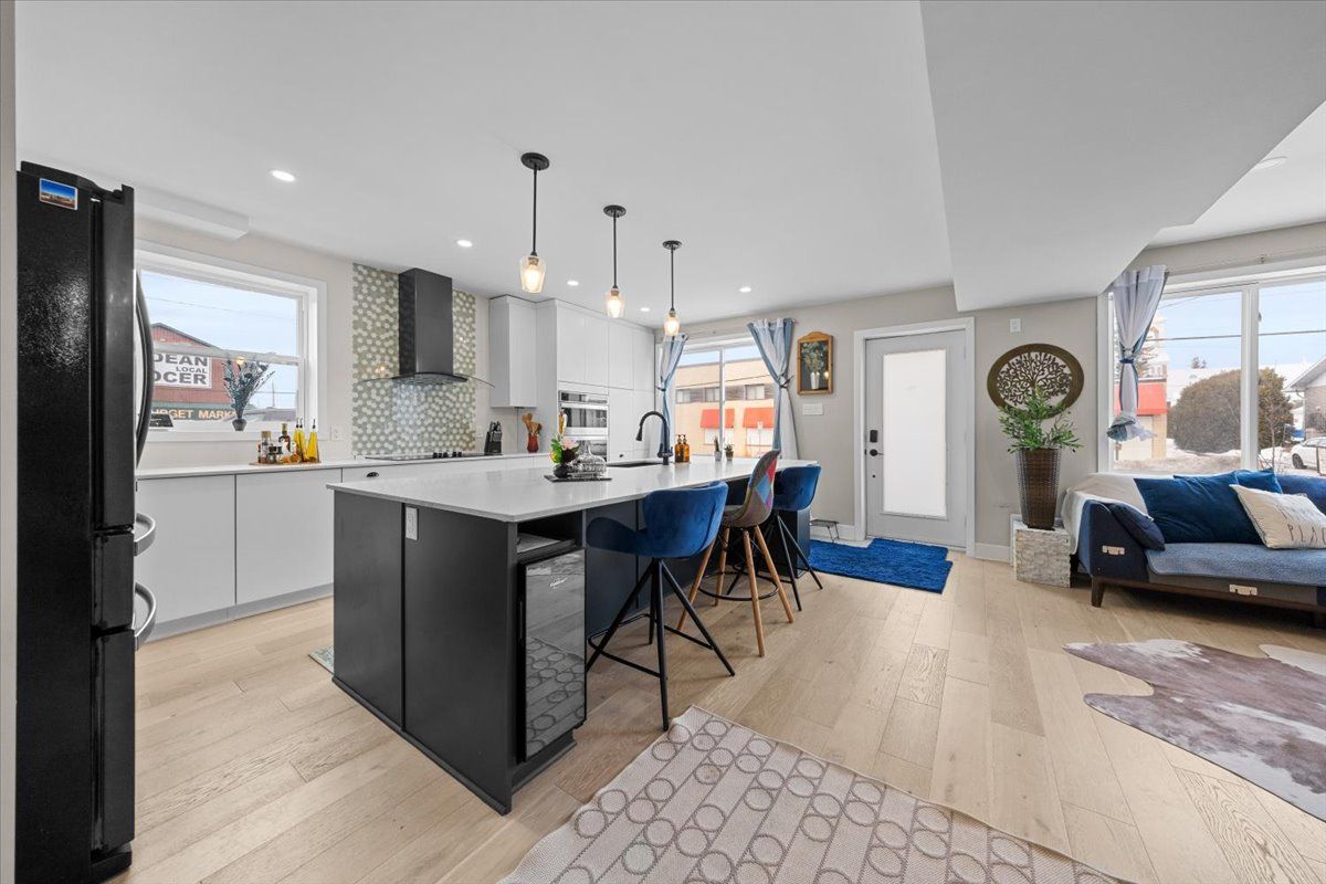 • Open-concept layout with high-end finishes and custom cabinetry.