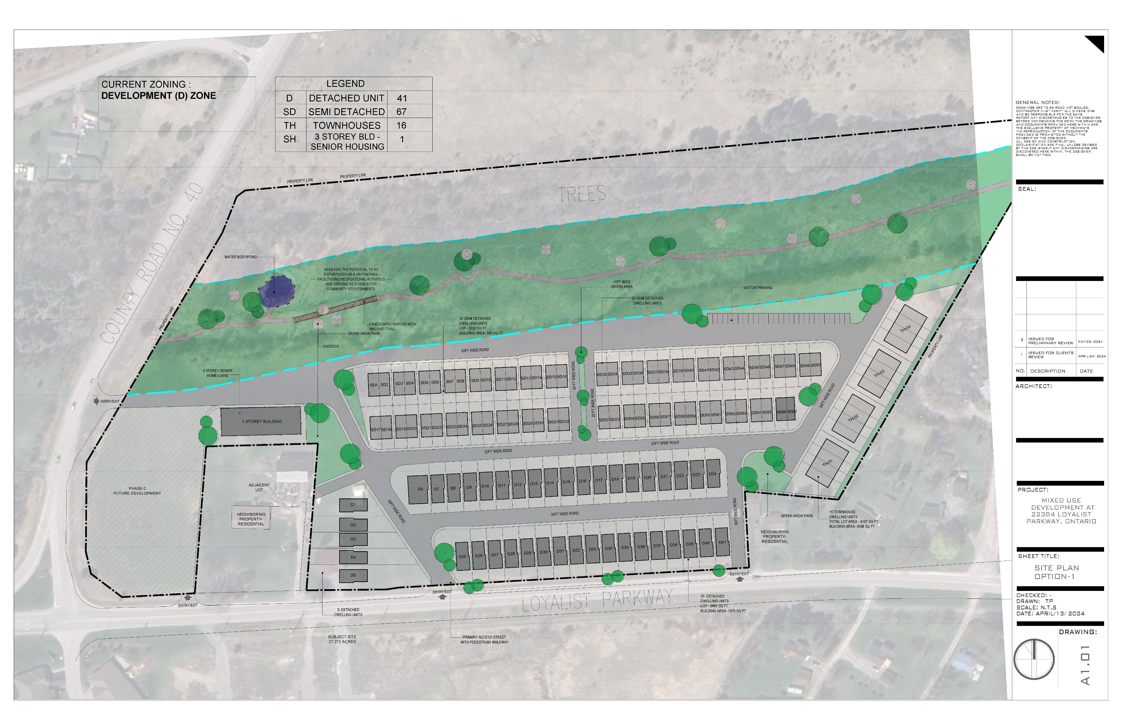Prime development opportunity along the picturesque bay of quinte! This 27. 28 acre parcel on busy loyalist parkway lies within the city of quinte west's growth corridor and across from the new kingfisher cove subdivision, offering a rare chance to create a vibrant mixed-use community in trenton's west end. The property is zoned development (d) and falls under the lower trent conservation authority. Municipal water is at the lot line and sewer extension will be required. A planning concept prepared by a professional planner envisions 37 single-detached lots, 32 semi-detached lots, 16 freehold townhome units and a three-storey seniors building with a future second phase. Internal roads, visitor parking, parkland and walking trails would create an attractive neighbourhood while leaving environmentally sensitive areas in open space. The parcel boasts rolling farmland with mature trees and wetland fringes and enjoys high visibility along loyalist parkway with quick access to prince edward county, downtown trenton, cfb trenton, marinas and hwy 401. The new kingfisher cove subdivision being built directly across the road adds to the area's residential appeal. Buyers may pursue the existing concept or reimagine the land for other permitted uses under development zoning. Whether you wish to land bank in a rapidly growing region, build a signature community by the water or develop multi-generational housing, this property offers unlimited possibilities. Vendor will provide concept plans and preliminary studies to qualified buyers. Don't miss this unique opportunity to secure one of the largest undeveloped parcels on loyalist parkway!