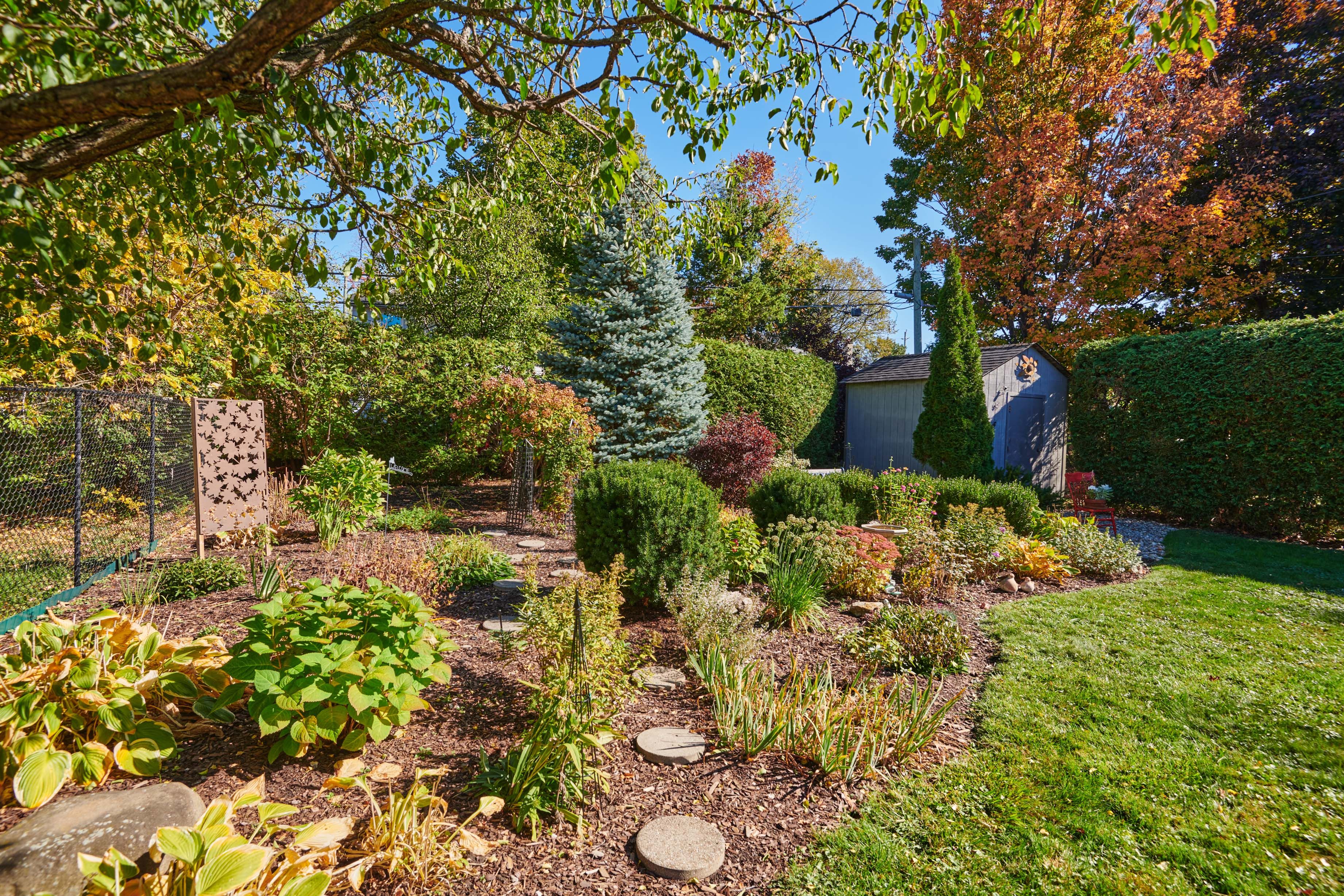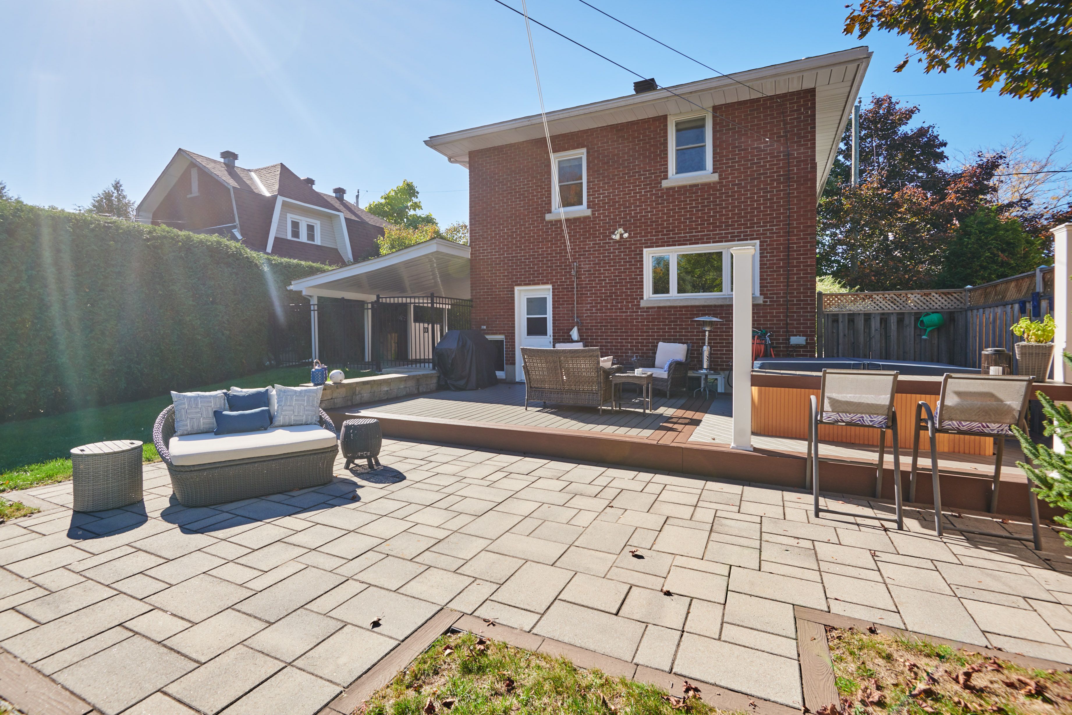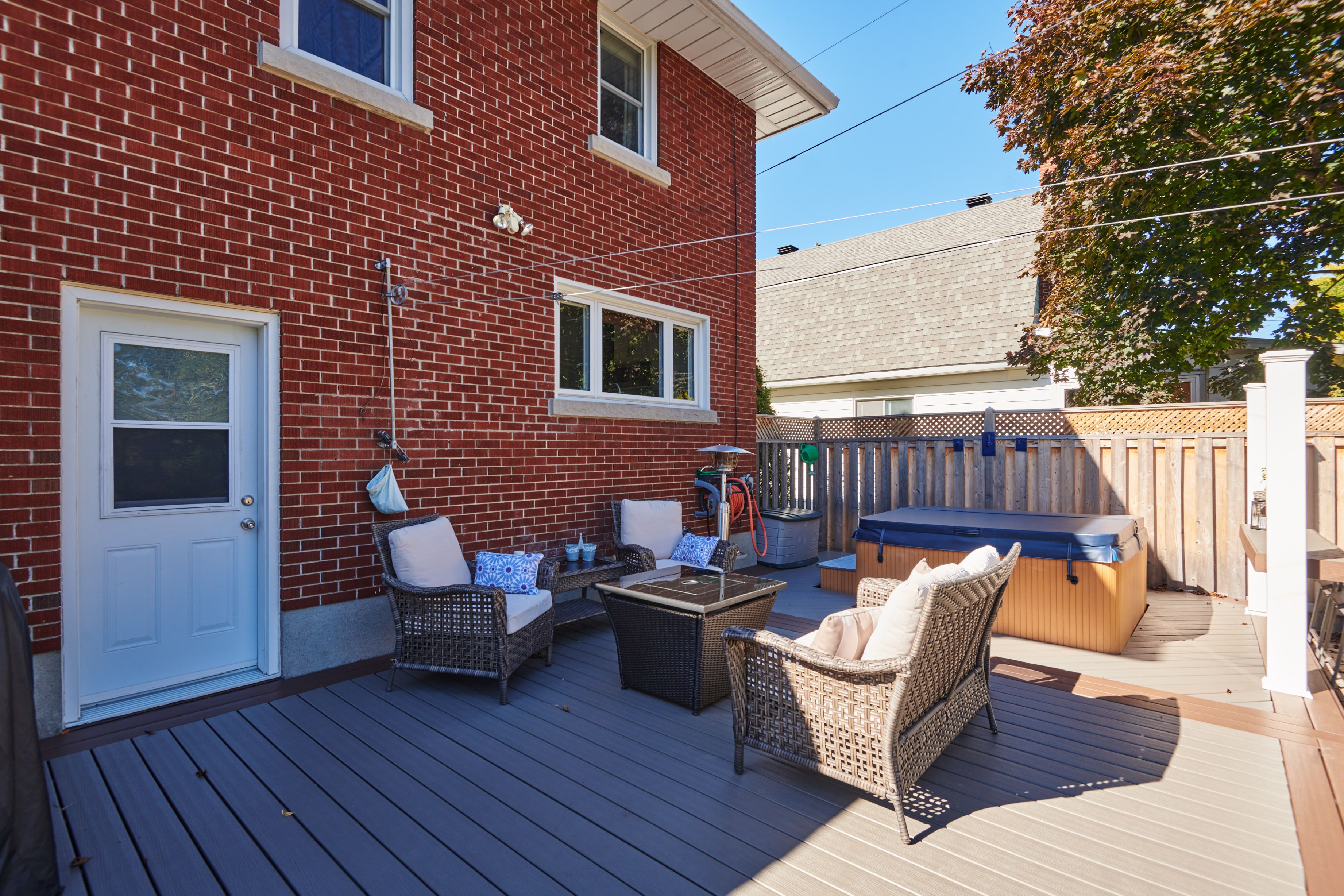 • Private backyard with a raised deck, interlock patio, and mature hedges.