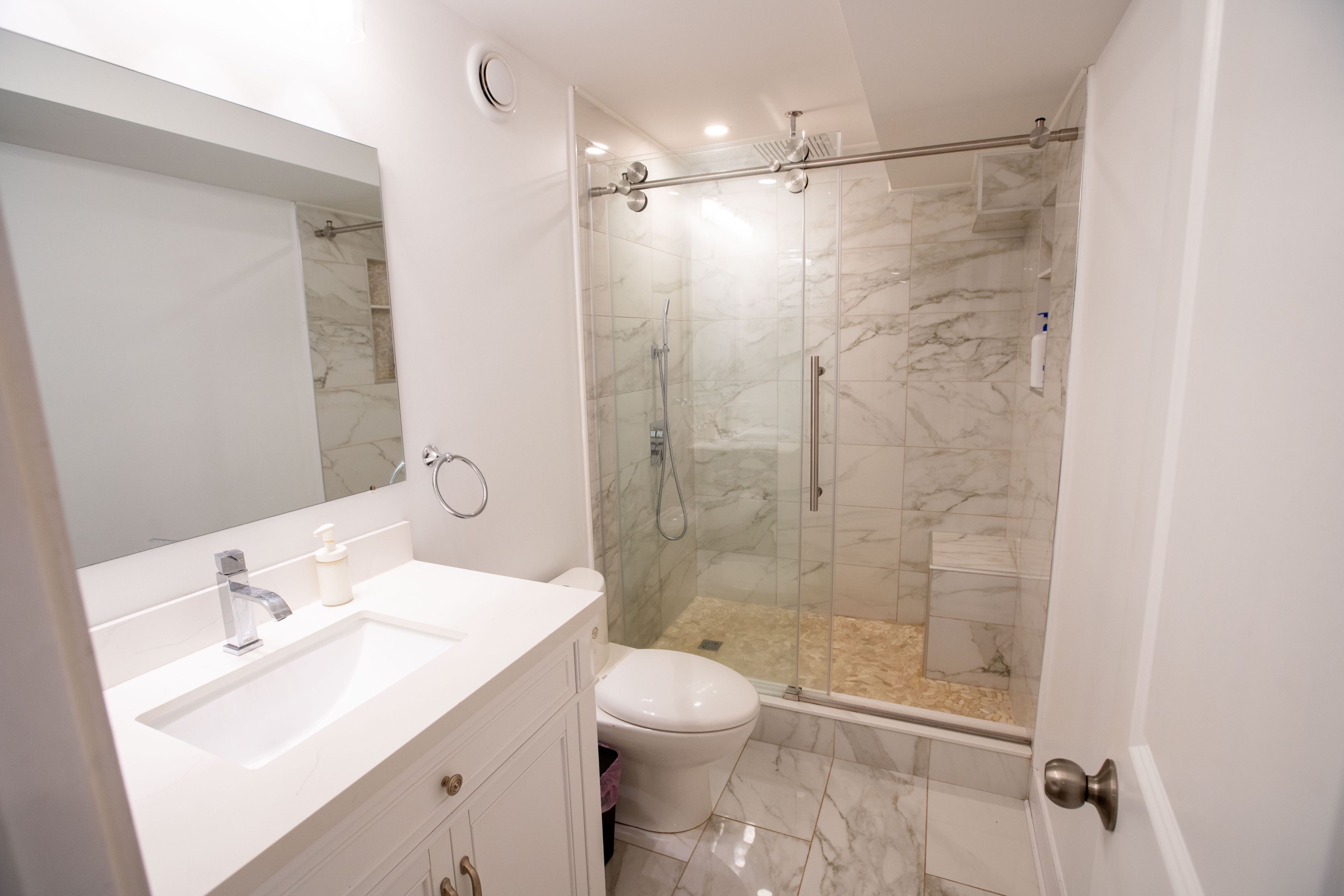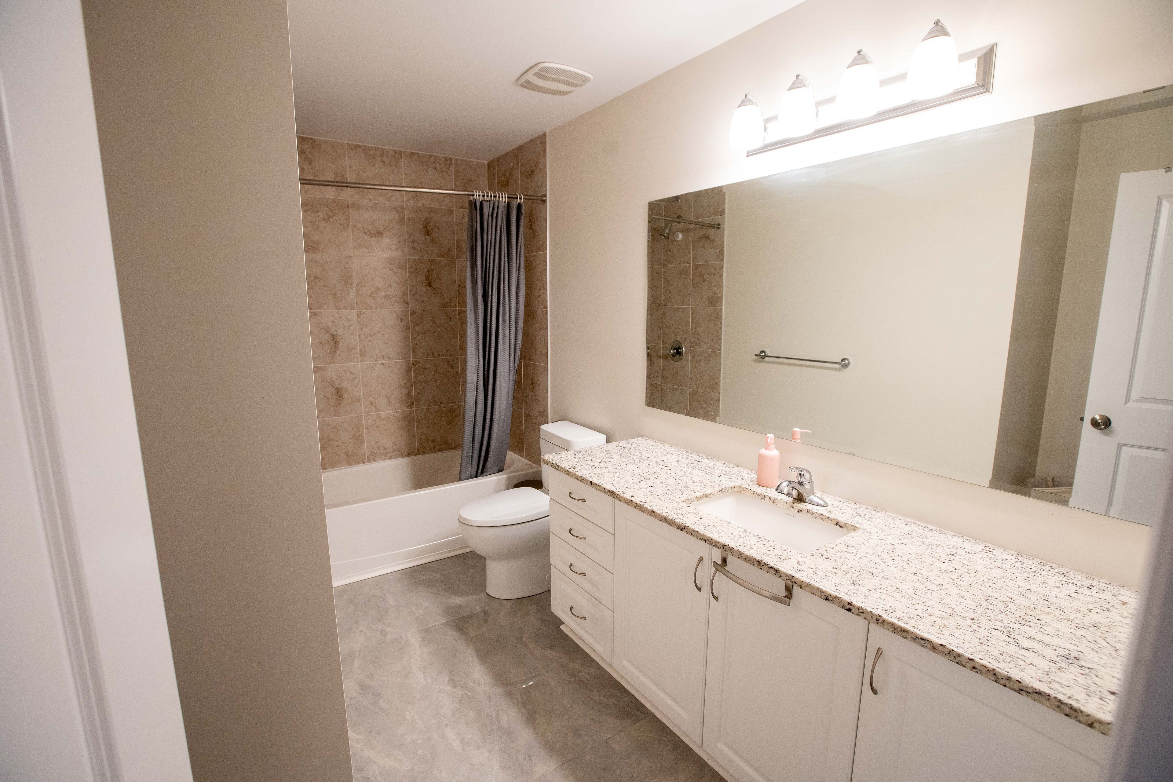 • Modern kitchen with granite countertops and new stainless steel appliances.