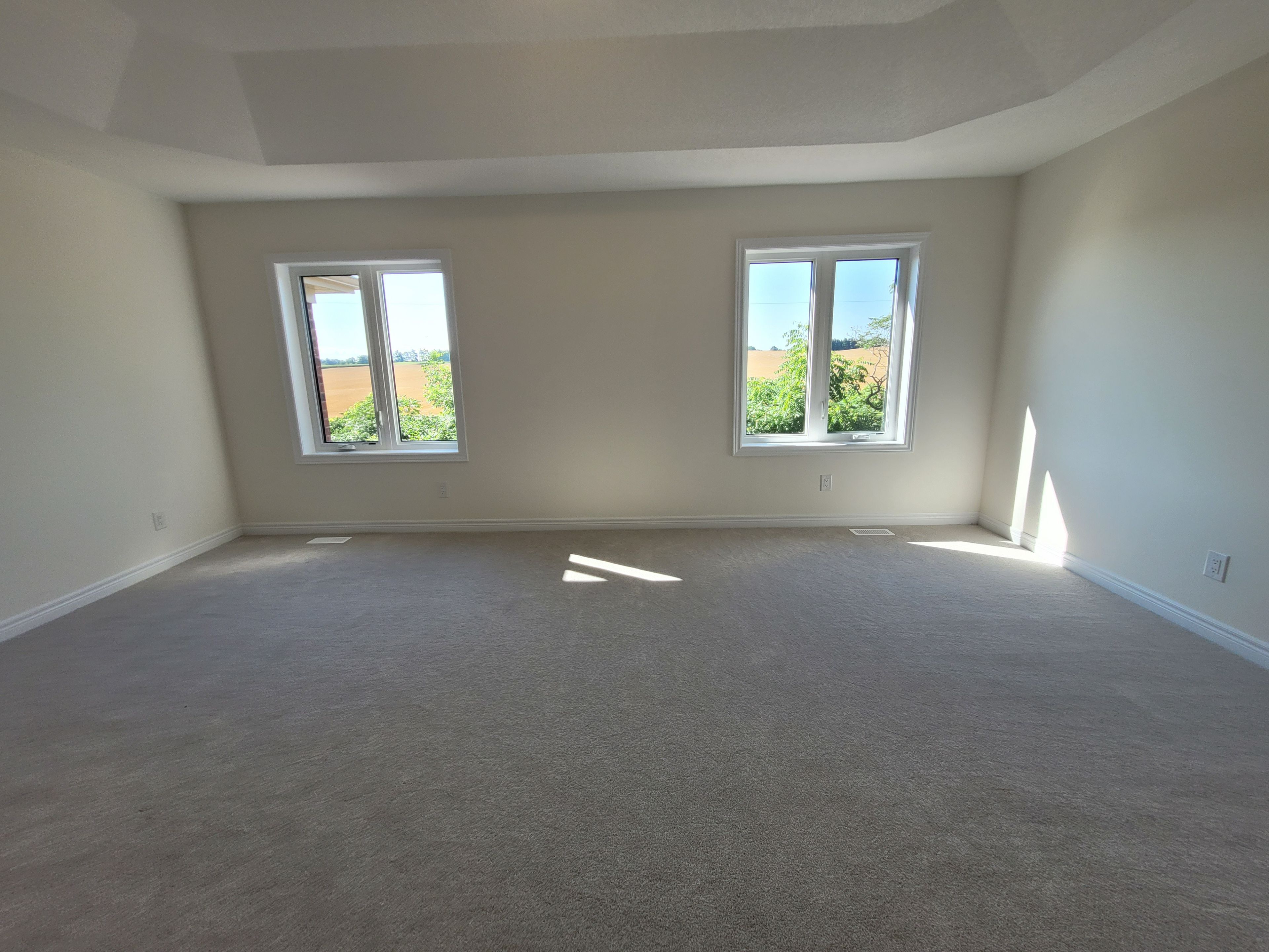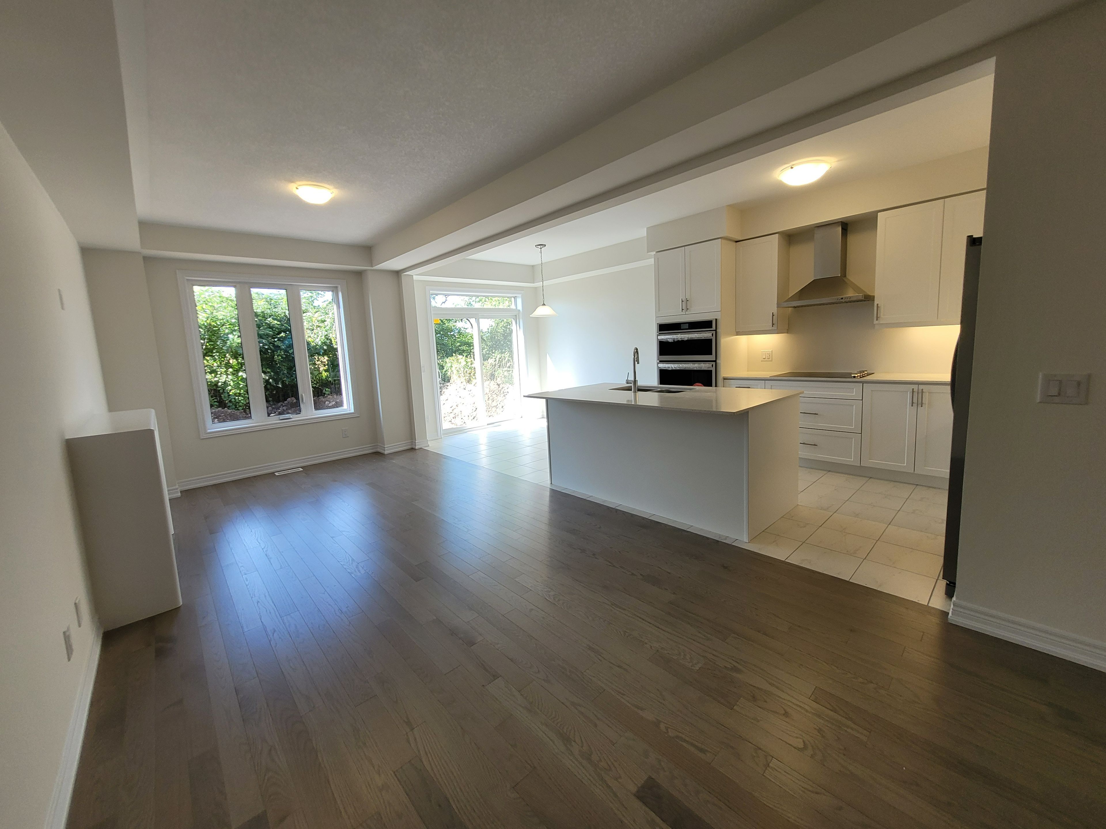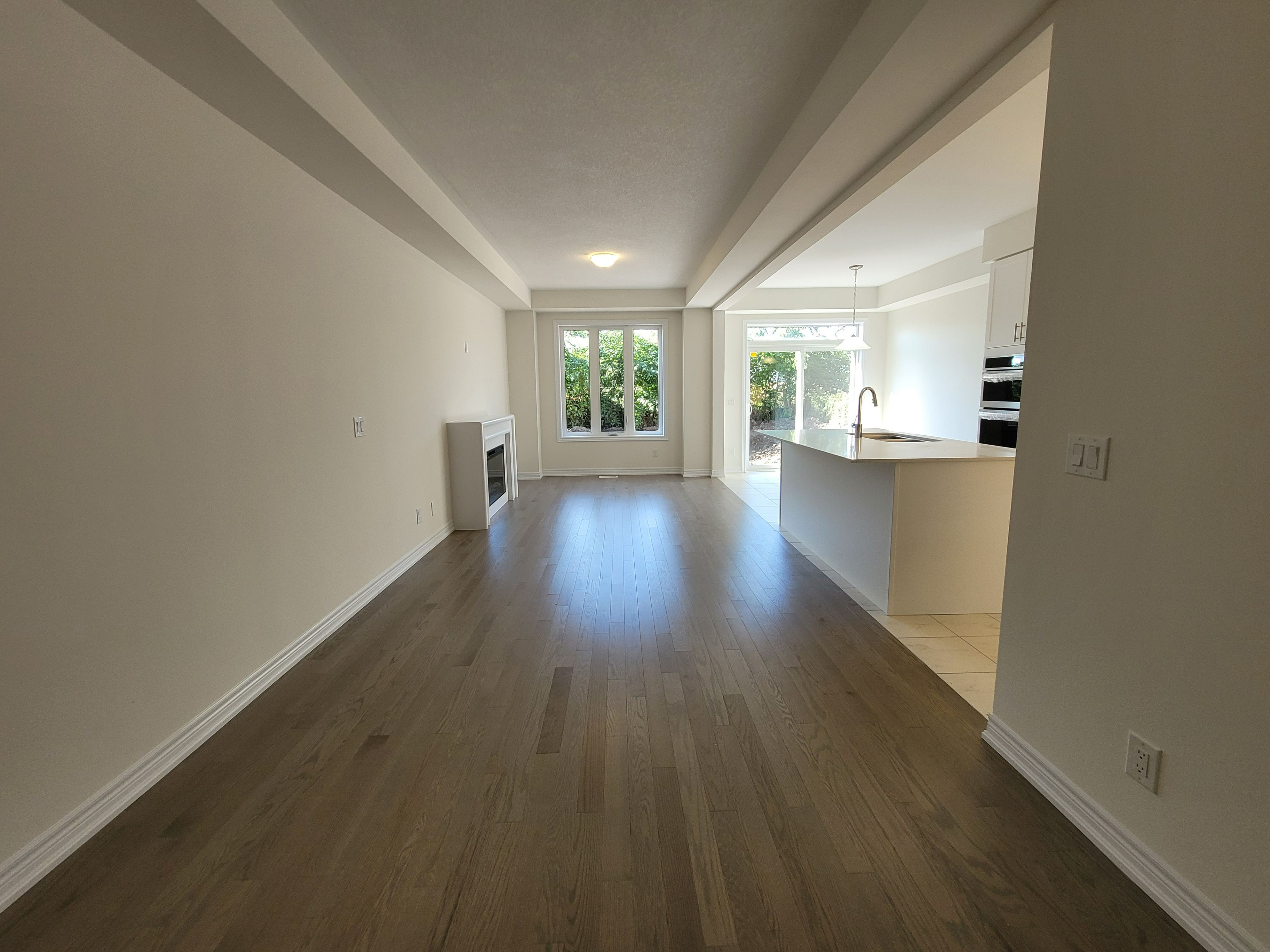 • Spacious great room with large windows and an electric fireplace.
