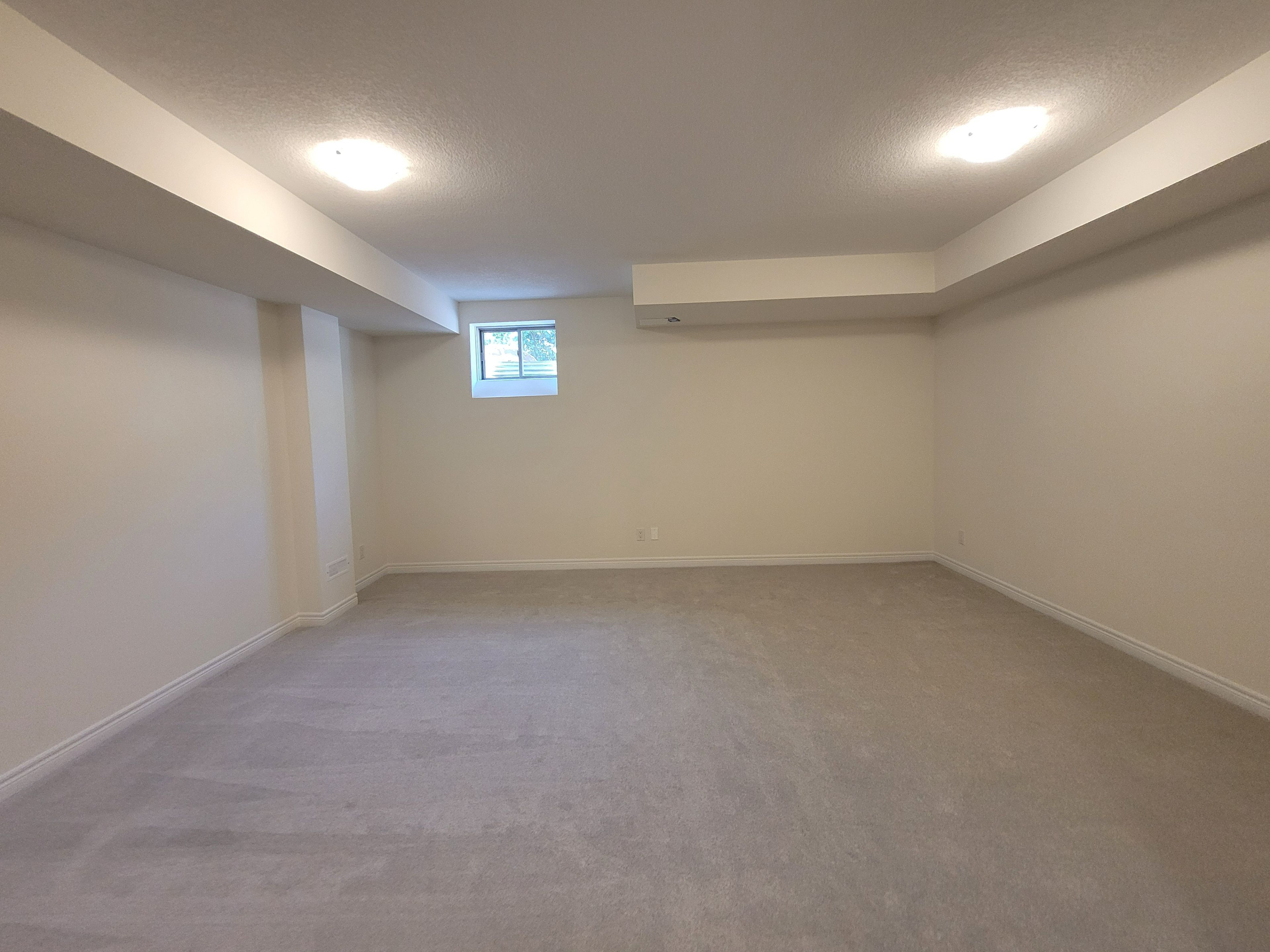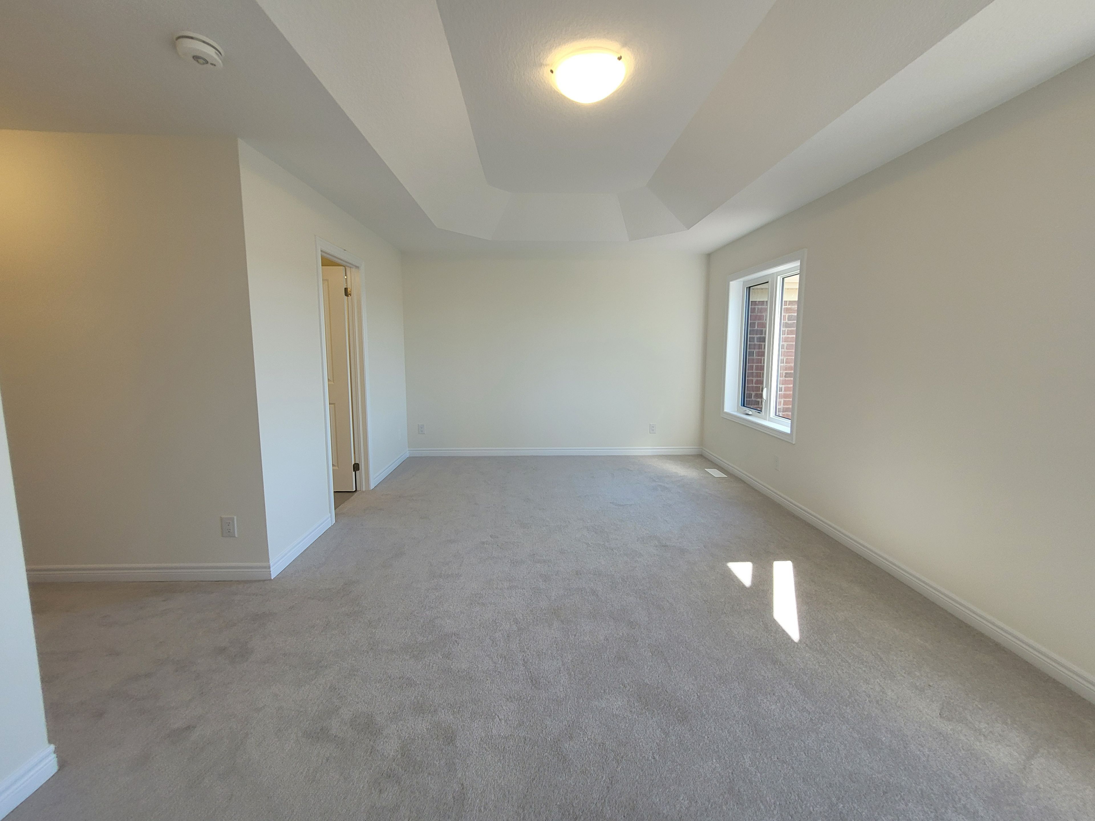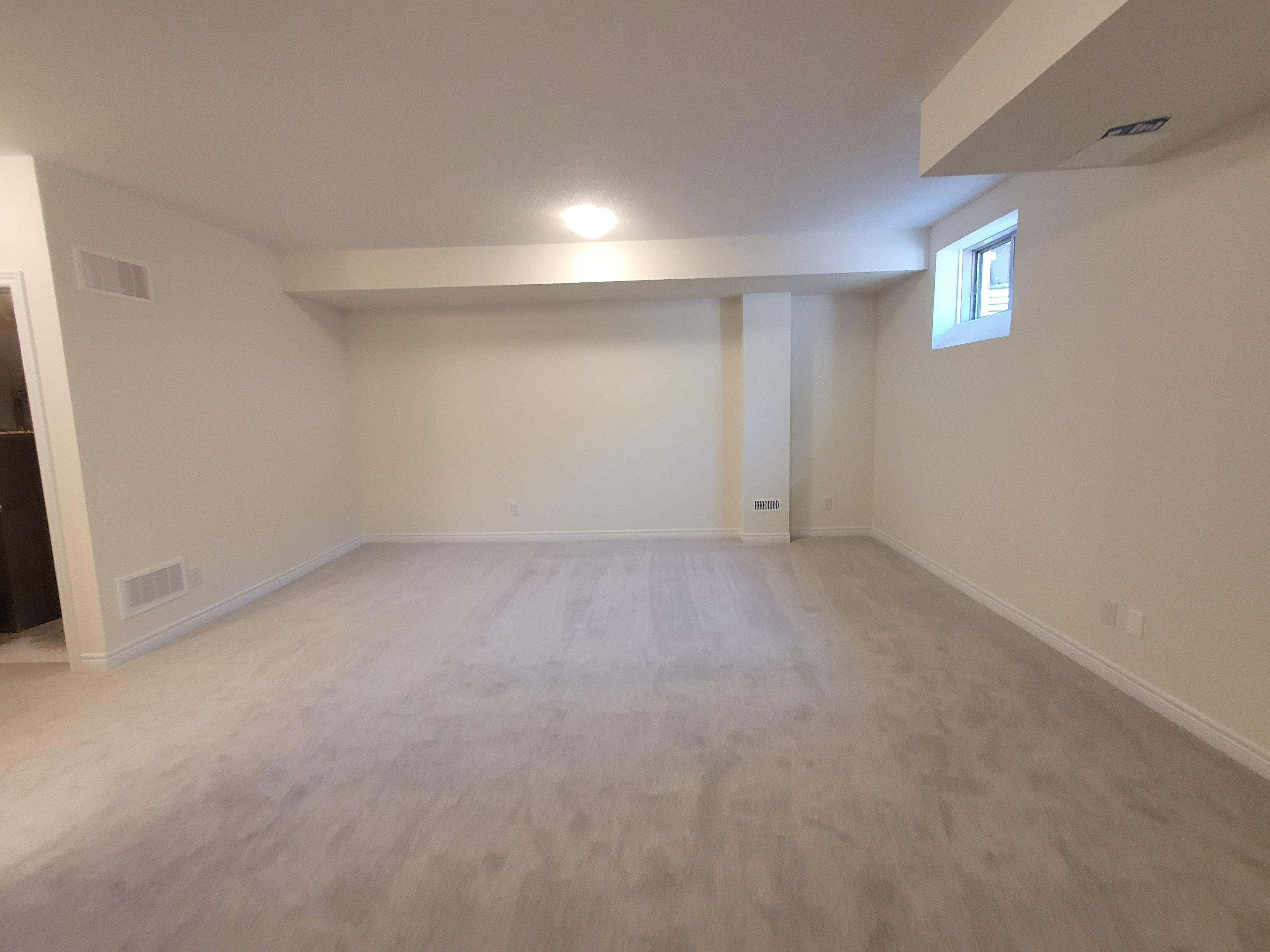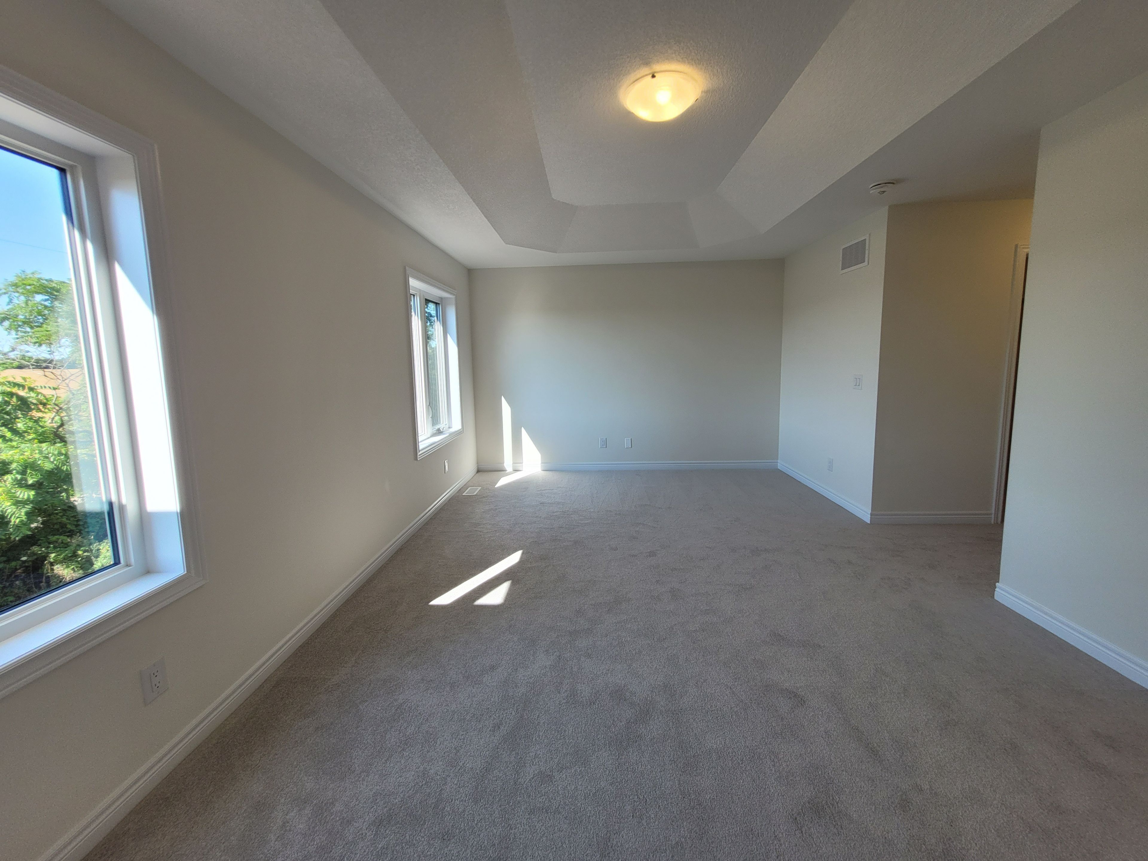 • Spacious great room with large windows and an electric fireplace.